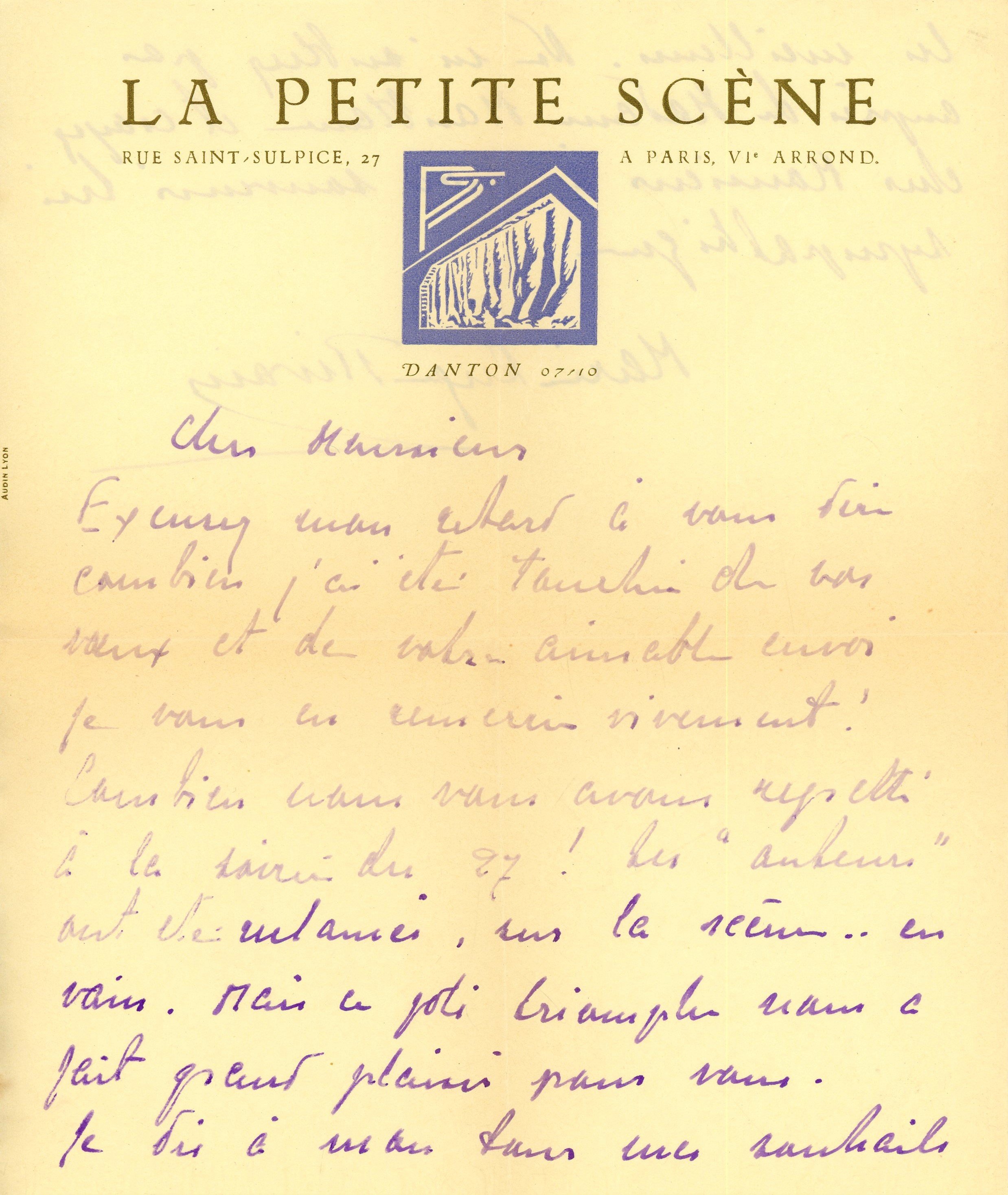 - « Les Rajeunis », comédie en 3 actes qui témoigne des interrogations et des inquiétudes de deux jeunes intellectuels sur leur époque, c. 1923, non interprétée: brouillons manuscrits (premier jet), 150 pages in-4 pliées ; manuscrit, 167 pages in-4 ; tapuscrit avec corrections et annotations, 167 pages ; tapuscrit définitif, 157 pages in-4 ; 2 L.S., 14 avril 1923, par F.H. Michel, secrétaire général du théâtre national de lOdéon, et du 19 juillet 1923, par Firmin Gemier (1869-1933), directeur du théâtre national de lOdéon ;
