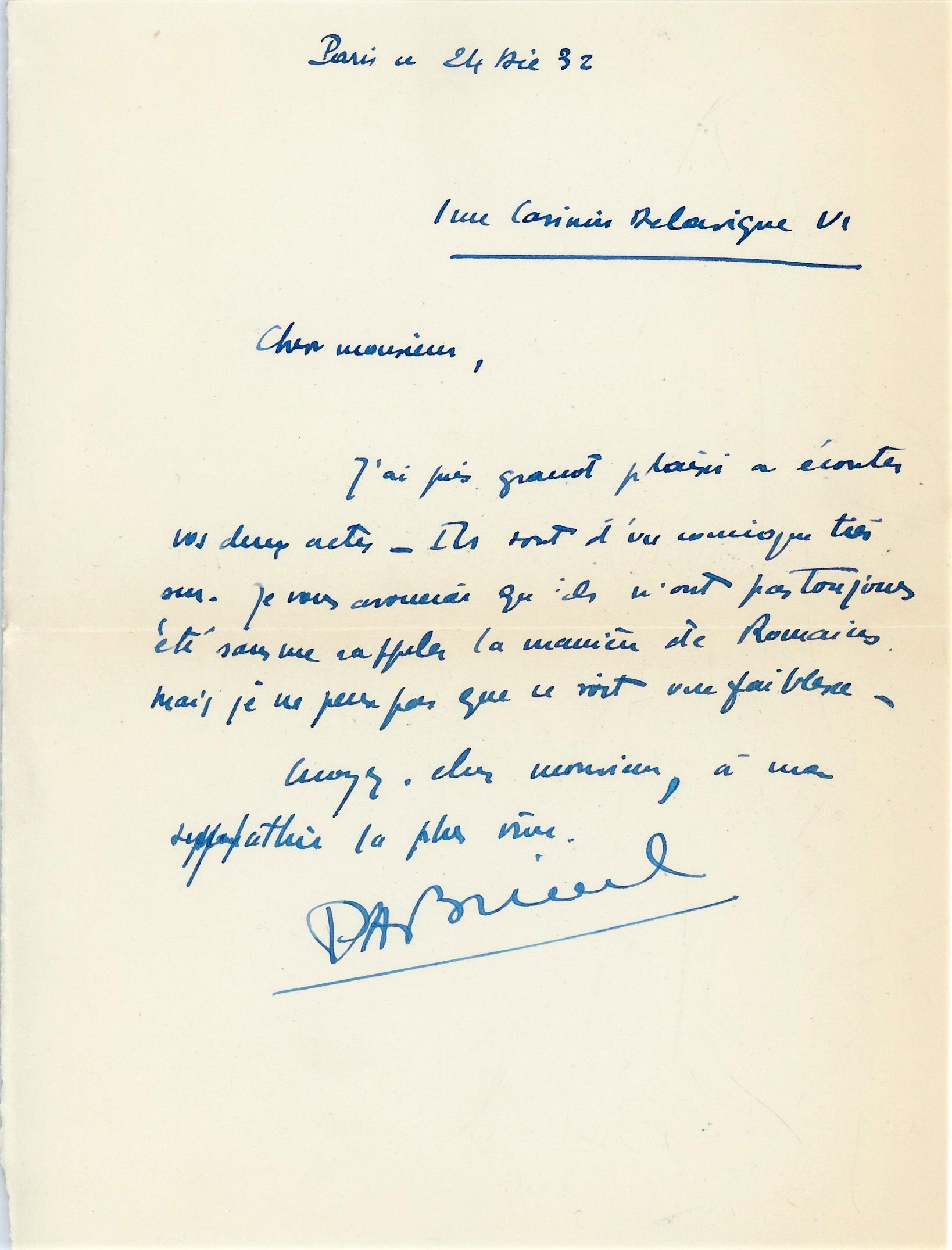 - « Le Politique malgré lui », comédie en 2 actes, c. 1932, interprétée et mise en scène de François Marèze au Théâtre de la Petite scène à Paris, 1ère représentation le 8 décembre 1932 : tapuscrit avec corrections, 86 pages in4 ; tapuscrit définitif, 83 pages in-4 ; tapuscrit traduit en italien avec corrections manuscrites, 77 pages in-4 ; scénario cinématographique manuscrit, c. 1933, env. 70 pages in-4 ; 5 tirages photographiques de la représentation au théâtre de la Petite Scène ; Théâtre de la Petite Scène : programmes, bulletins de souscription, invitations ; Coupures de presse des annonces et critiques. ; 12 L.A.S. de remerciements et de félicitations dont lactrice Marie-Ange Rivain, le scénariste Pierre-Aristide Bréal, le journaliste Edmond Delage, etc ;