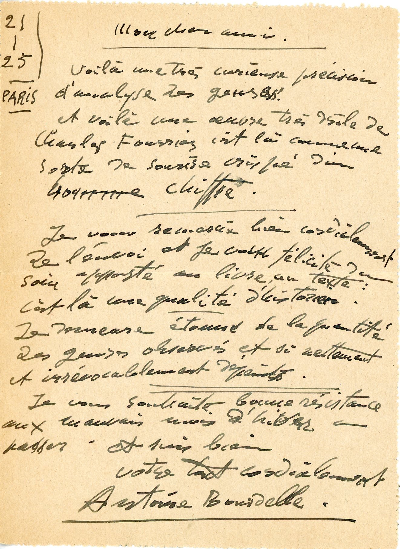 - P.A.S., Paris, 21 janvier 1925, à René Maublanc : « Mon cher ami voilà une très curieuse précision d’analyse des genres! Et une voilà une œuvre très drôle de Charles Fourier [Hiérarchie du cocuage] c’est là comme une sorte de sourire crispé d’un homme chiffré. Je vous remercie bien cordialement de l’envoi et je vous félicite du soin apporté au livre, au texte: c’est là une qualité d’historien. Je demeure étonné de la quantité des genres observés et si nettement et irrévocablement dépeints. Je vous souhaite bonne résistance aux mauvais mois d’hiver à passer… » ;