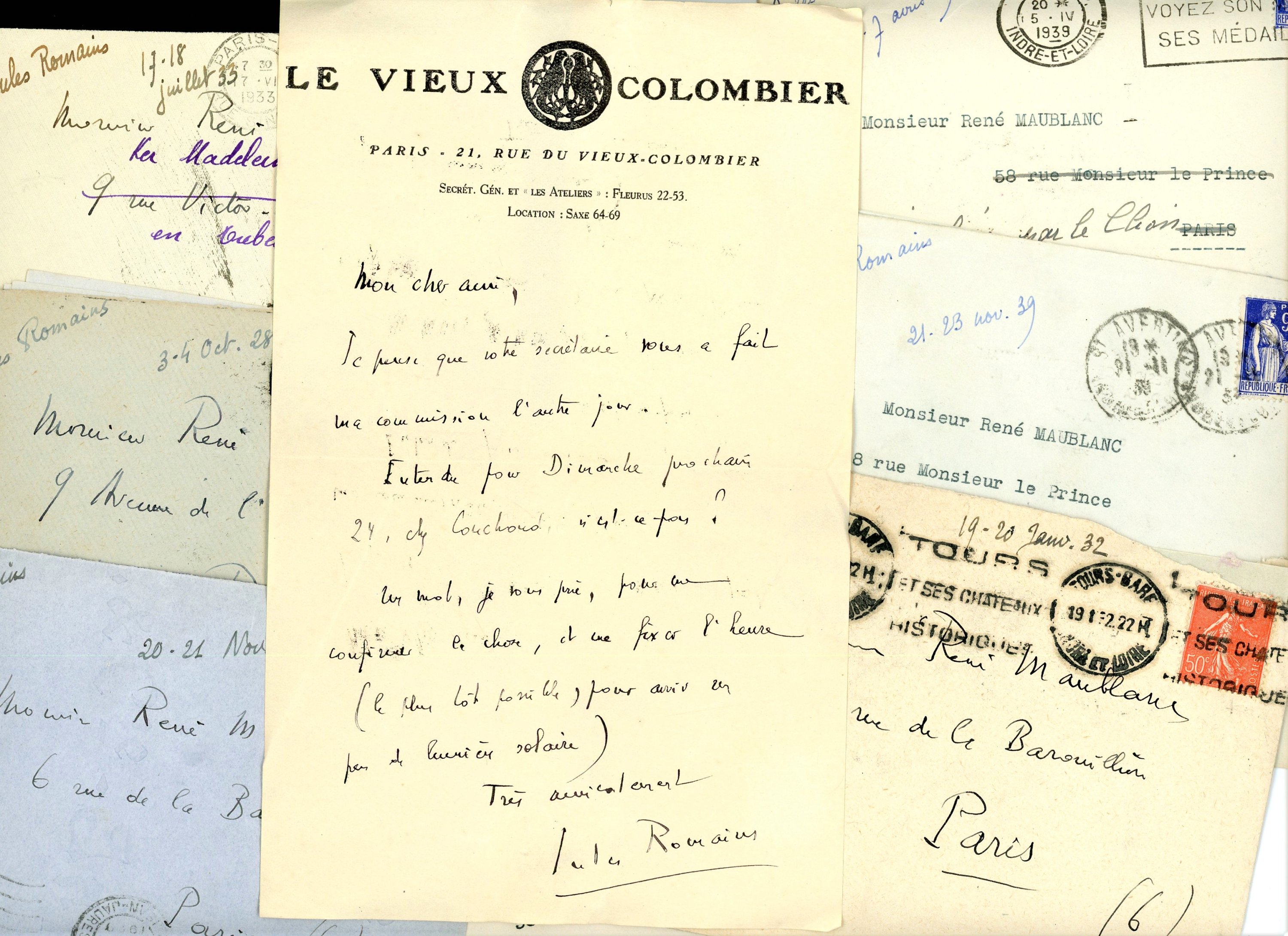 - Lot de 10 tirages photographiques par R.M., 4 x 7 cm : portraits de Jules et de Gabrielle Romains, 1924 ; escapade à Nanteuil-sur-Marne en présence du peintre Henri Le Fauconnier, Henri Legrand, Albert Cazes et son épouse, 10 juillet 1927 ;