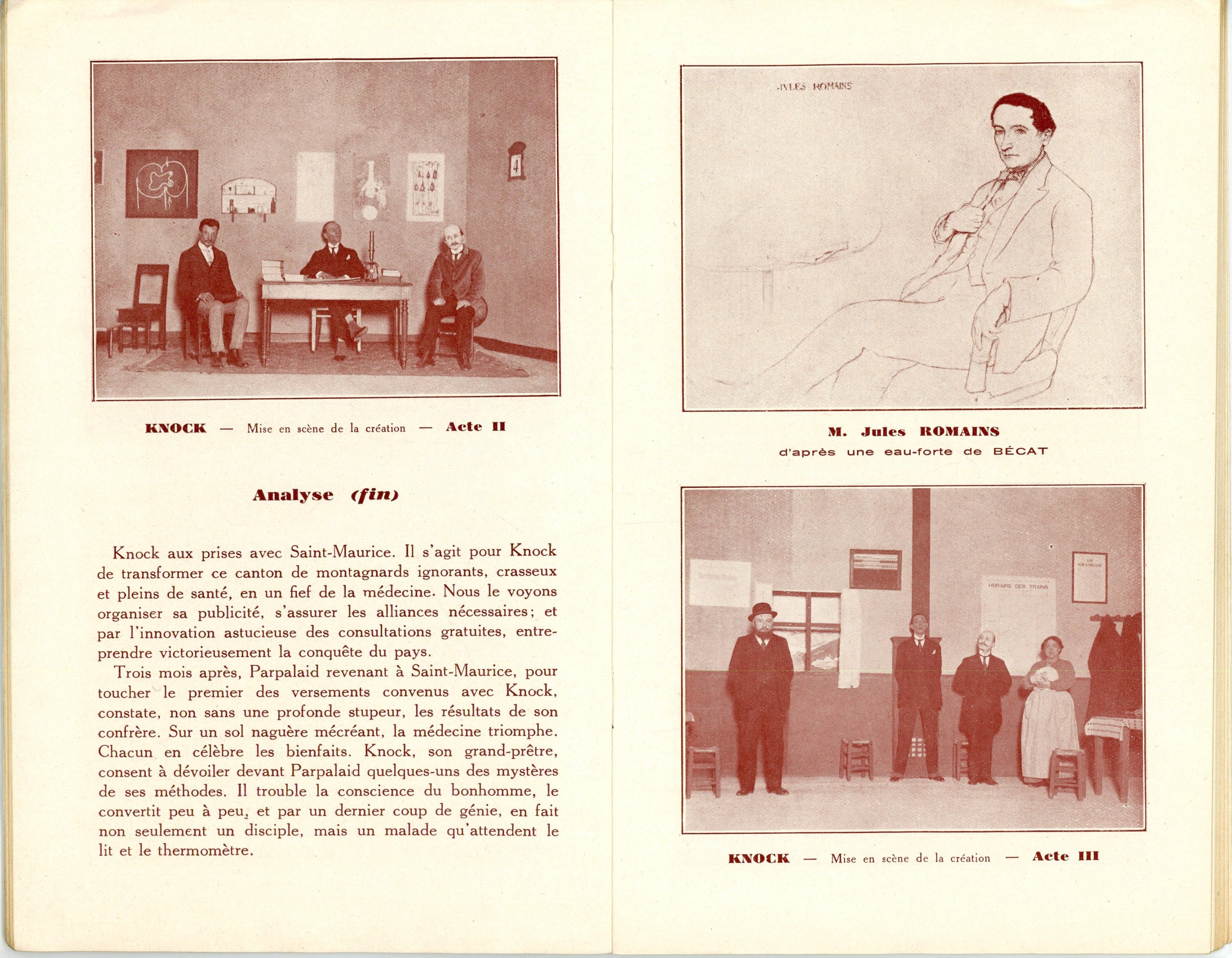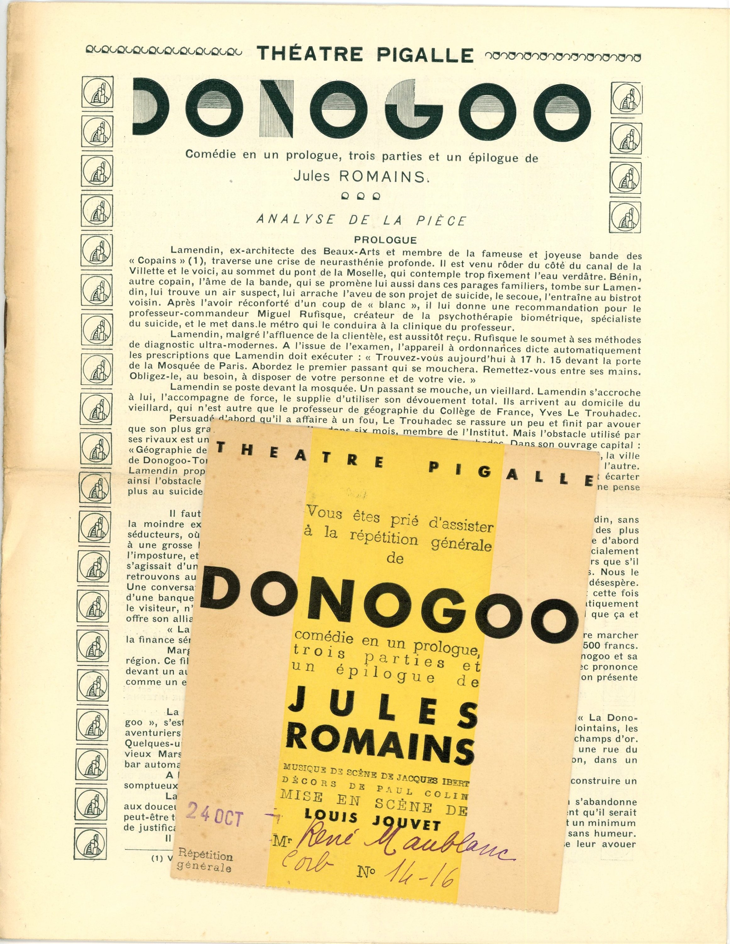 - Invitation et plaquette de promotion de « Donogoo » au théâtre Pigalle + Tapuscrit d’une partie de la pièce de théâtre « Donogoo », 28 pages in-4 ;