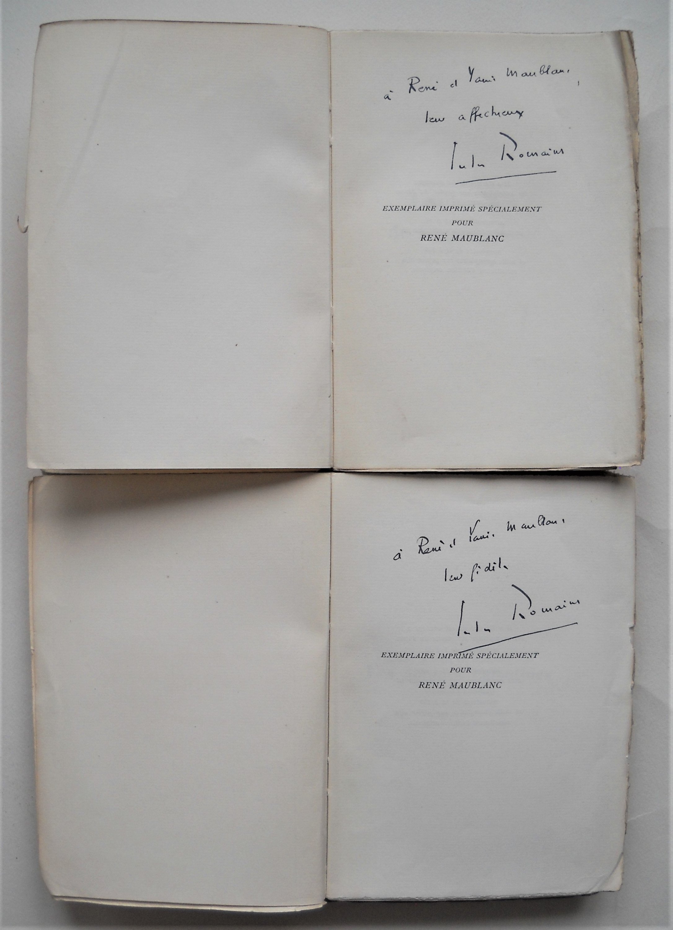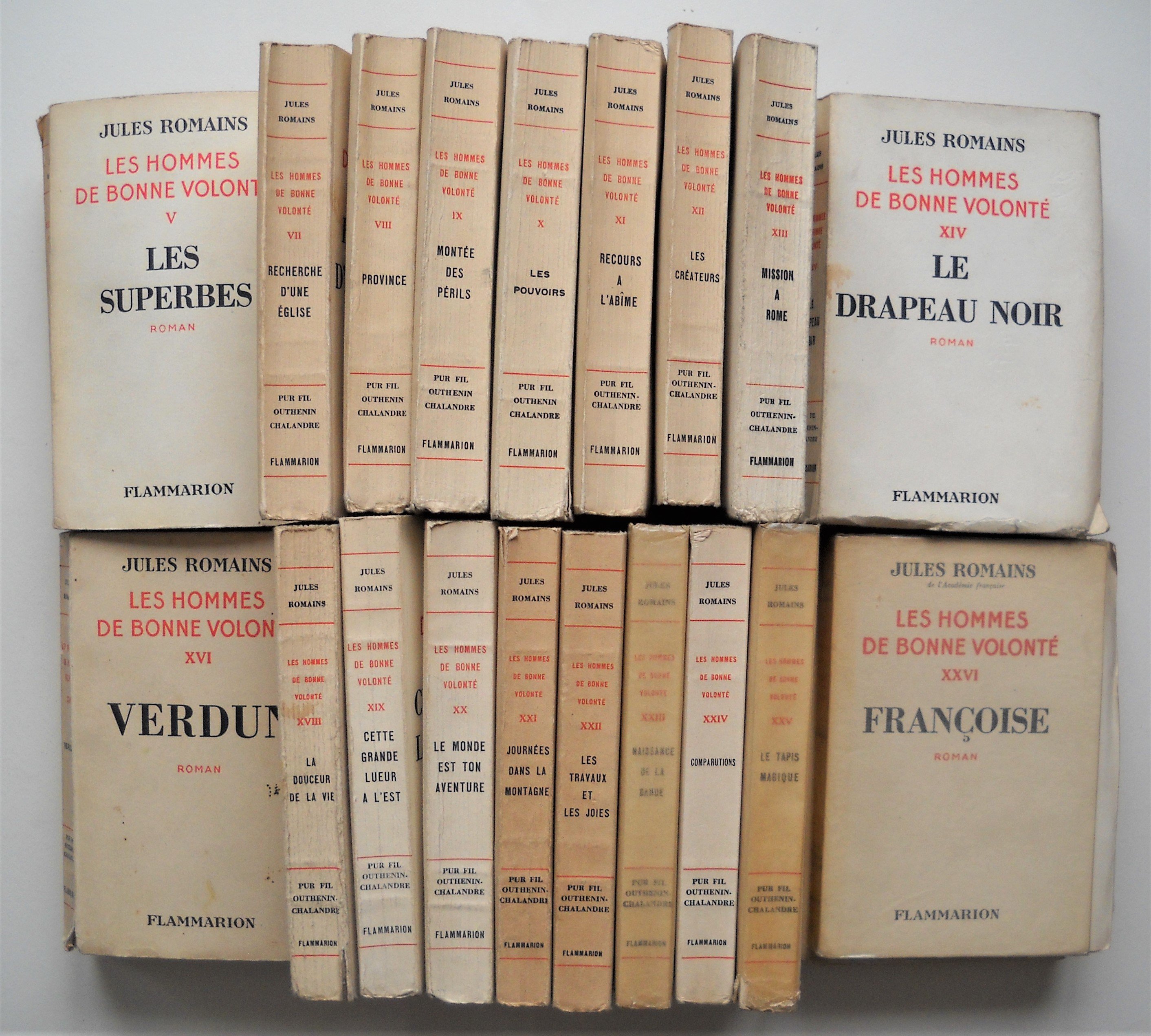 Les Hommes de bonne volonté, 27 volumes, complet, Flammarion, 1932-1946, br. in-12. Edition originale. Chaque vol. contient en frontispice un feuillet indiquant «exemplaire édité spécialement pour René Maublanc». La plupart des vol. comporte un envoi autographe signé ou une signature manuscrite.