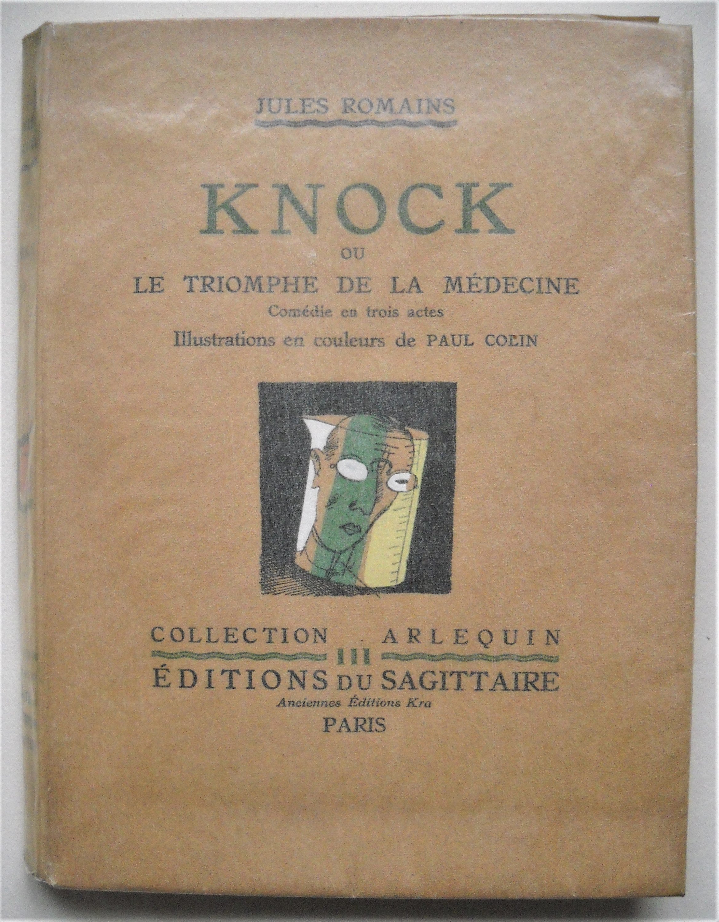 Knock ou le triomphe de la médecine - Comédie en trois actes, illustrations de Paul Colin coloriées au pochoir dans le texte et à pleine page, Collection Arlequin, éditions du Sagittaire, 1931, édition originale, br. in-8, 146 pages. Ex. sur Rives. Envoi autographe signé.