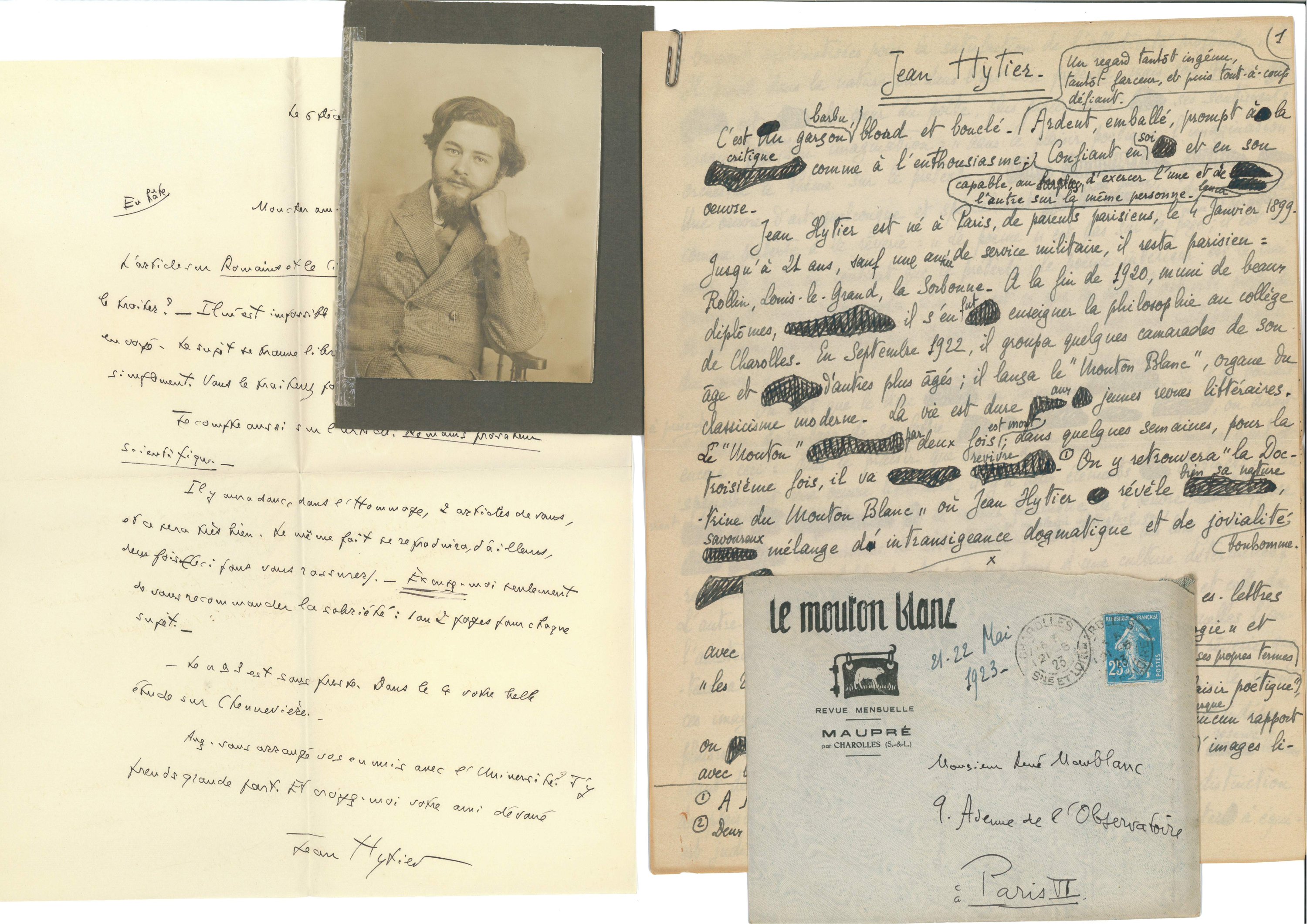 - Jean HYTIER (1899-1983) et les éditions du Mouton Blanc : 14 L.A.S. et P.A.S., 1922-1924 ; « La Belle Sorcière », 1924, avec envoi autographe + 1 ex. du n°1 du Mouton Blanc ; « Jean Hytier », 2 brouillons manuscrits de R.M., 1924, pour un article proposé aux Nouvelles Littéraires qui ne sera pas publié, accompagné d’un portrait photographique.