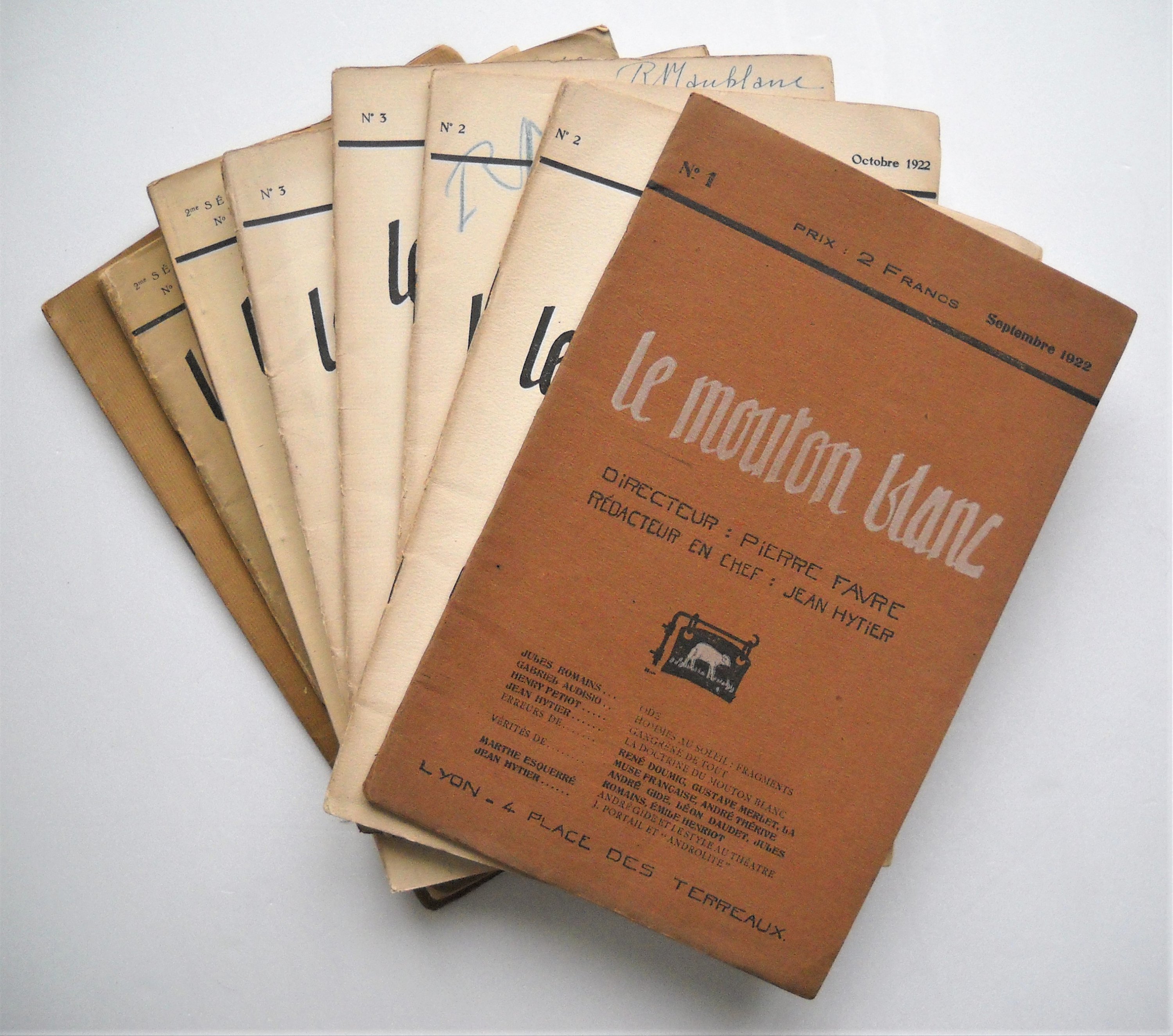 Ensemble complet des 7 numéros de la revue littéraire Le Mouton Blanc, éditée à Lyon puis à Maupré (Saône-et-Loire) de 1922 à 1924, dirigée par Pierre Favre puis Marthe Esquerré, et Jean Hytier rédacteur en chef, format br. in-8: 1ère série: 4 numéros en 4 livraisons du n° 1 (septembre 1922) au n° 4 (janvier 1923); 2e série: 3 numéros en 3 livraisons du n° 1 (septembre-octobre 1923) au [s.n.] (novembre 1924). Ont collaboré: Gabriel Audisio, Georges Chennevière, Benjamin Crémieux, André Cuisenier, Paul Fierens, Franz Hellens, René Lalou, René Maublanc, Adrienne Monnier, Francis Ponge, Jules Romains, Stefan Zweig, etc.