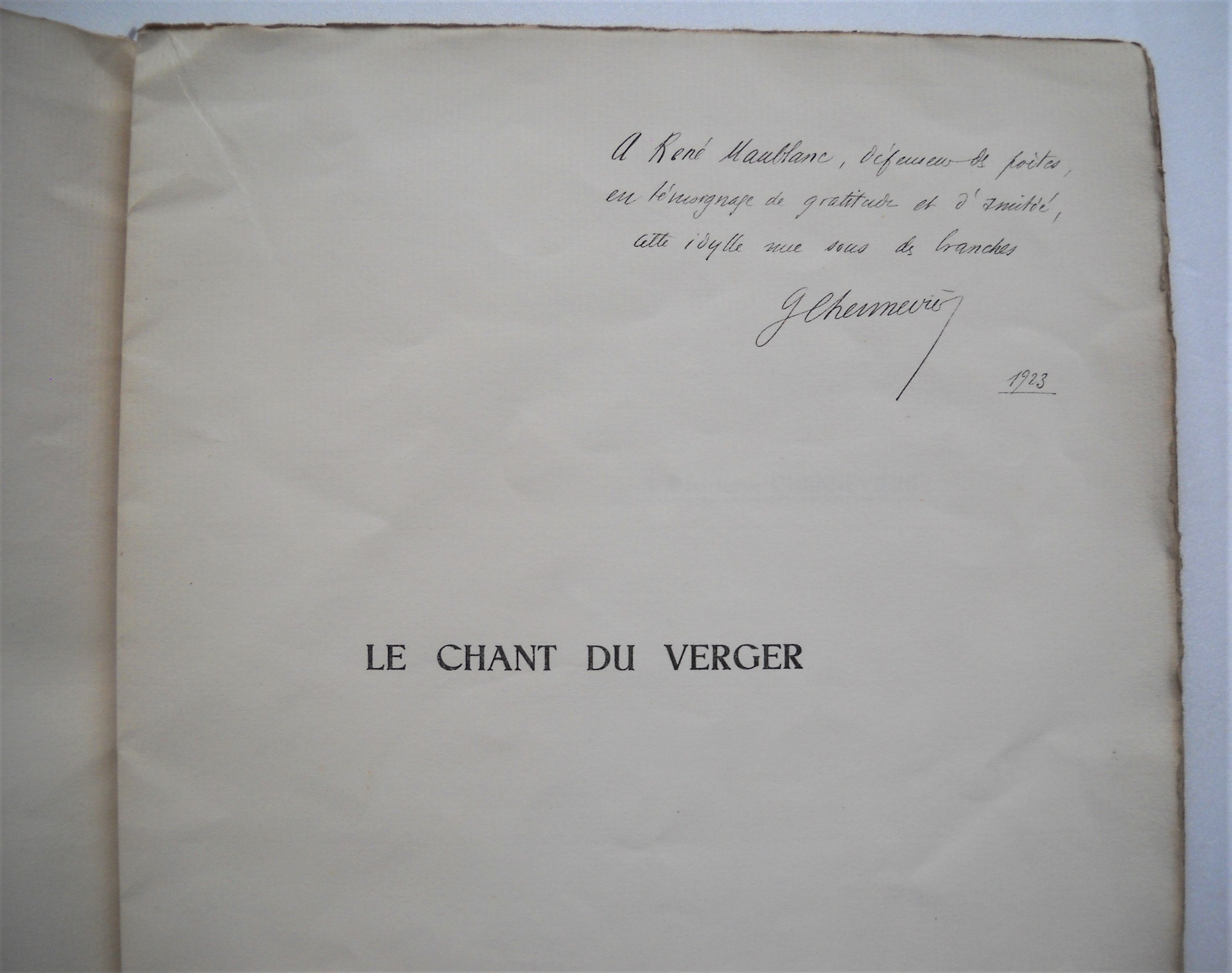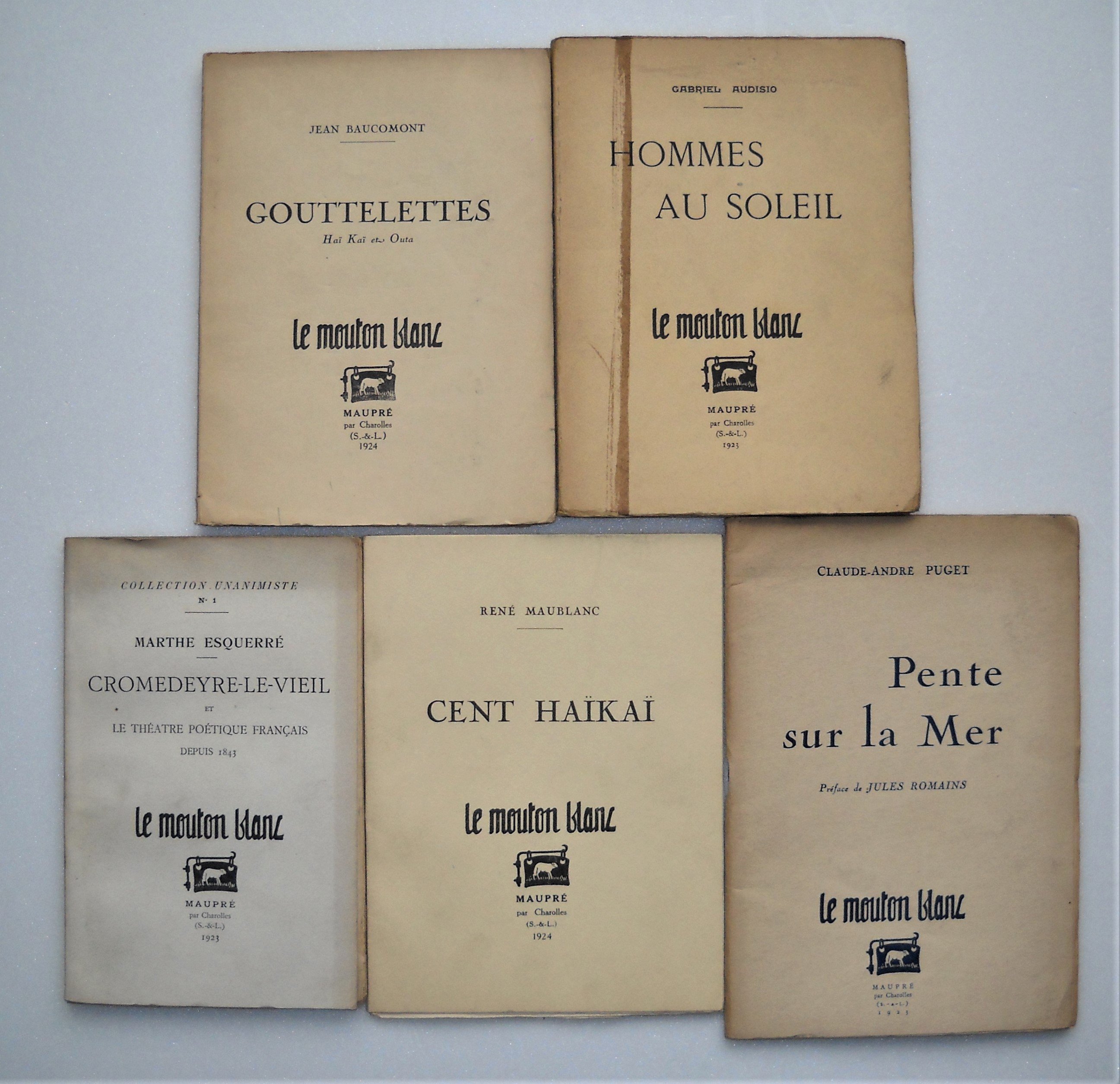 Sy ajoute 7 publications éditées par Le Mouton Blanc : Gabriel AUDISIO, Hommes au soleil, 1923, br. in-12, 109 pages, Ex. n°90, envoi autographe signé et daté Georges CHENNEVIERE, Le Chant du Verger (Idylle), 1923, in-4, 22 pages. Ex. sur Hollande van Gelder, envoi autographe signé et daté «A René Maublanc, défendeur des poètes, en témoignage de gratitude et damitié, cette idylle nue sous des branches». Claude-André PUGET, Pente sur la mer, préface de Jules Romains, 1923, br. in-8, non paginé, Ex. n°363/550 sur papier bouffant, envoi autographe signé Marthe ESQUERRE, Cromedeyre-Le-Vieil et le théâtre poétique français depuis 1843, Collection unanimiste n°1, 1923, br. in-12, 66 pages, envoi autographe signé Jean HYTIER, La Belle Sorcière, 1924, format journal, envoi autographe signé René MAUBLANC, Cent Haïkaï, 1924, br. in-12 Jean BAUCOMONT, Gouttelettes, Haï-Kaï et Outa, 1924, br. in-12, 33 pages, 2 exemplaires n°75 et n°299/500, dont un avec envoi autographe signé.