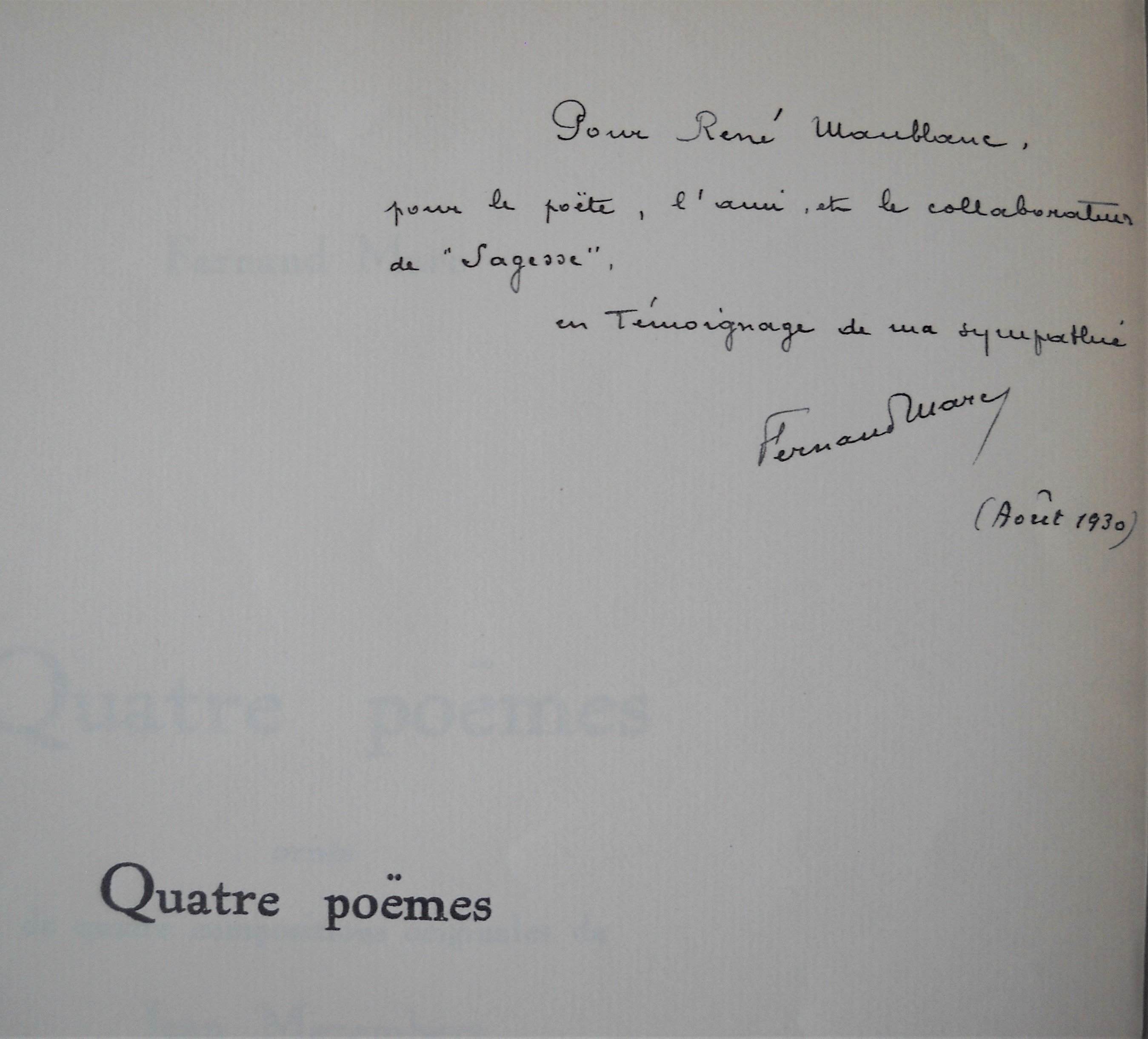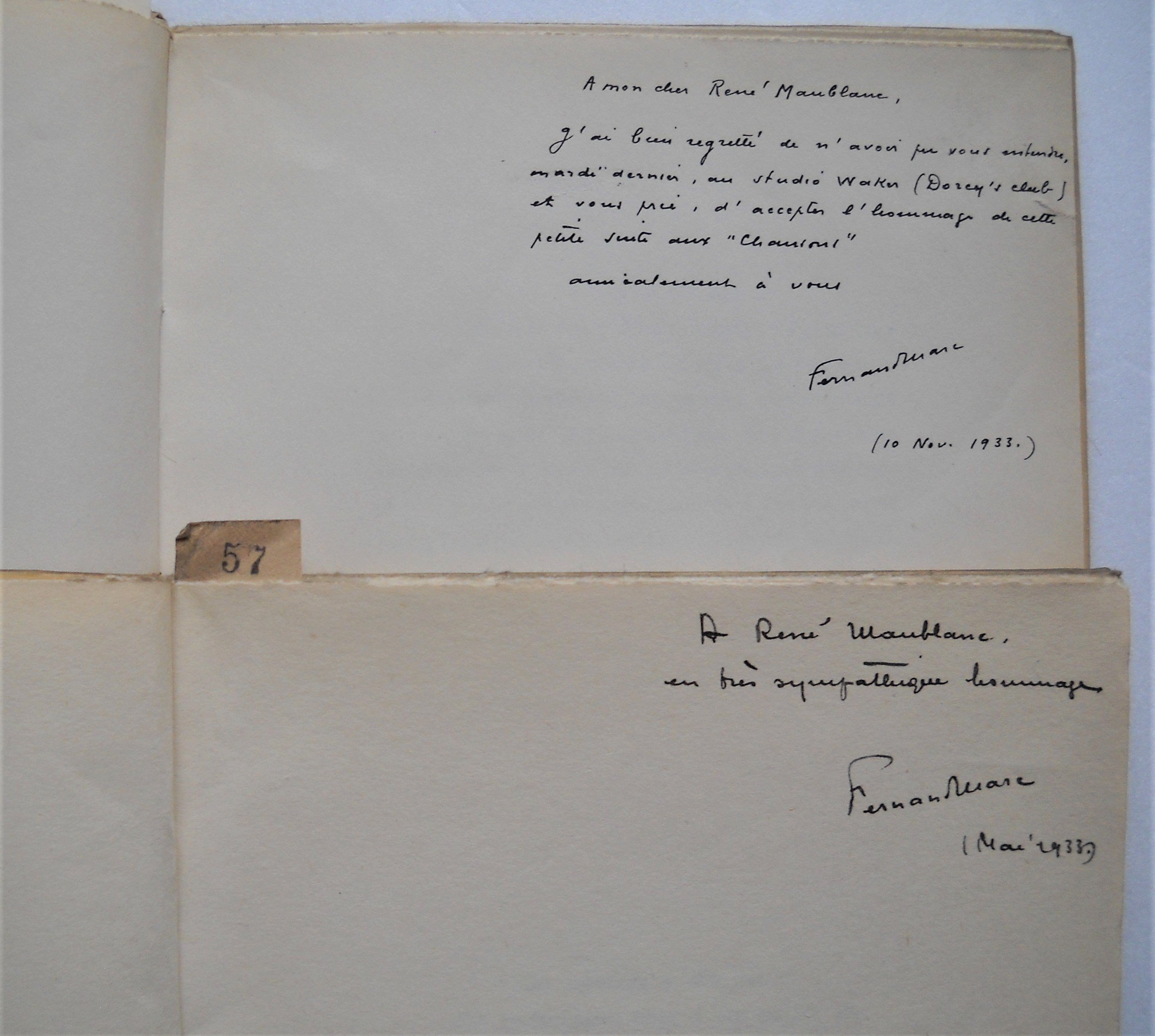 Fernand MARC: Nomenclature, poème, orné de trois compositions de Jean Marembert, Editions Sagesse, 1932, br. in-8, 45 pages. Ex. n°57/521 sur papier Alfax Mousse. Envoi autographe signé et daté. Chansons nouvelles suivies d’un conte inachevé, avec trois dessins de Georges Malkine, Editions Sagesse, 1933, br. in-8, 35 pages. Ex. n°494/501 sur papier Hélio Navarre. Envoi autographe signé et daté: « A mon cher René Maublanc, j’ai bien regretté de n’avoir pu vous entendre, mardi dernier, au studio Waker (Dorcy’s club) et vous prie d’accepter l’hommage de cette petite suite aux « chansons » ».
