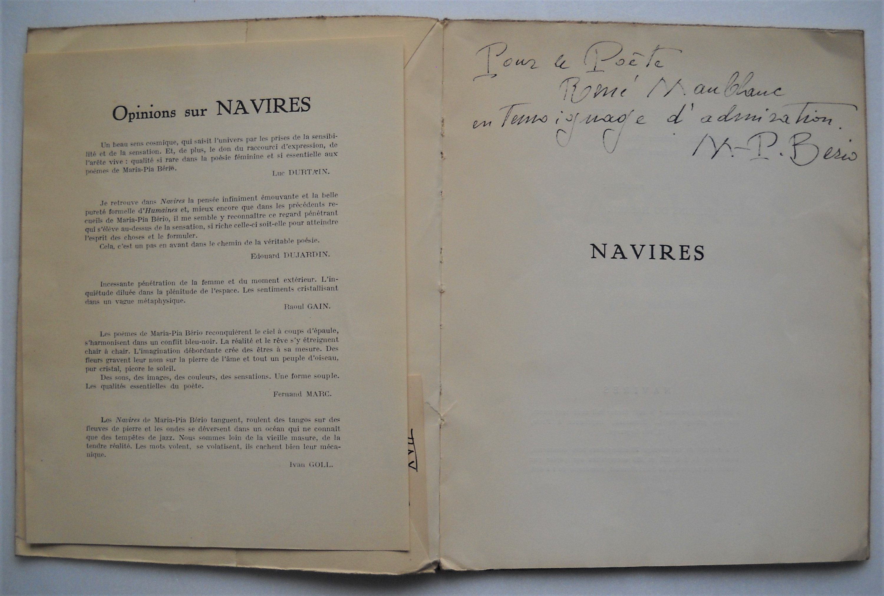 Maria-Pia BÉRIO: Navires, poèmes, ornés de quatre compositions originales de Jean Marembert, Editions Sagesse, [1930], br. in-4, non paginé. Envoi autographe signé.