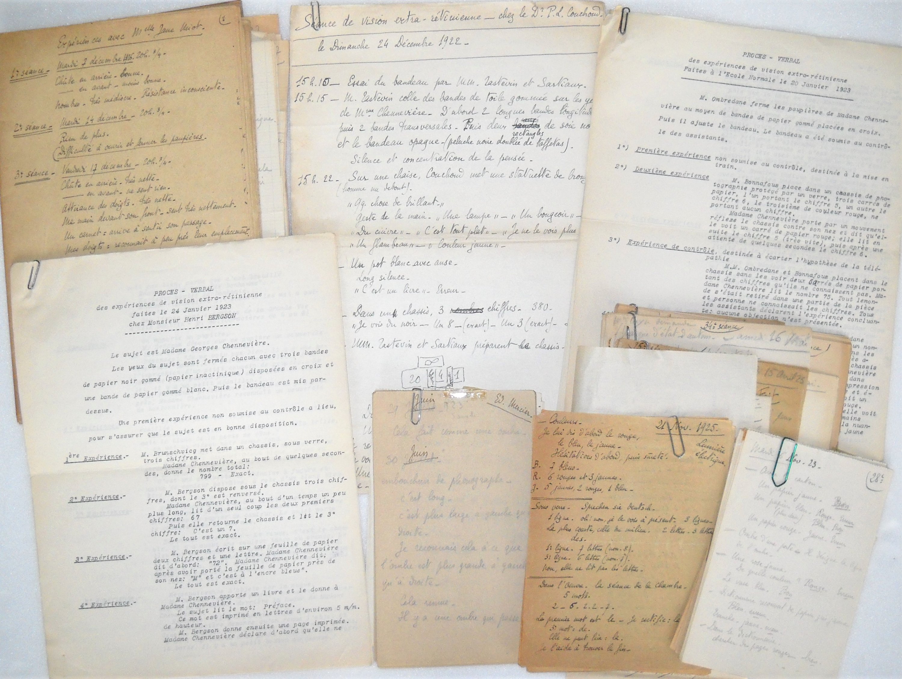 - Notes manuscrites sur des bouts de papier, formats divers :comptes rendus et procès-verbaux des expériences conduites par René Maublanc, comportant la date, le lieu, le nom du sujet, les objets employés, le détail des résultats, avril 1923 à mars 1924, avril à septembre 1925 ;