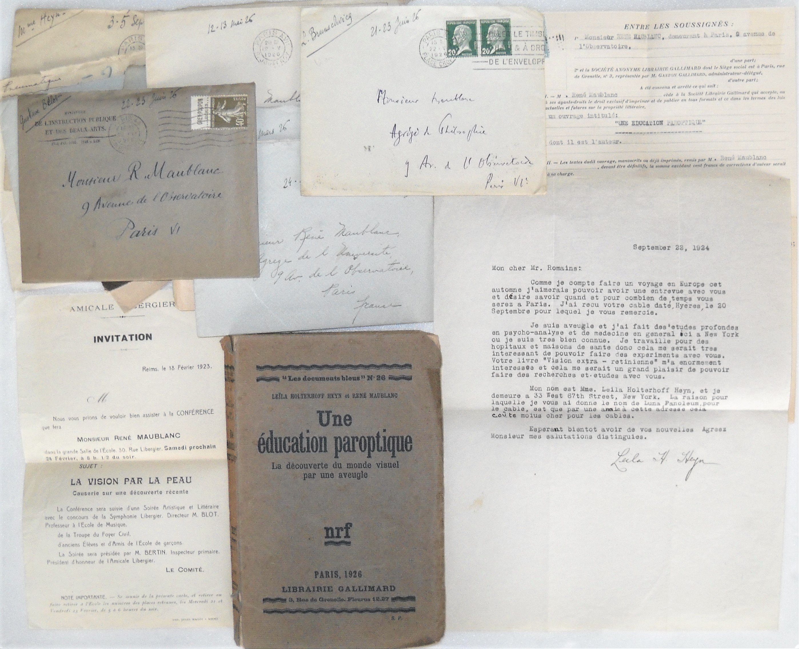 - Exemplaire «Une éducation paroptique» paru en 1926+ brouillon manuscrit : 1ère partie: description des expériences par R. M., et brouillon manuscrit de la traduction faite par André CUISENIER de la 2e partie: description des expériences par Leïla Holterhoff Heyn, avec corrections manuscrites de R.M. + épreuve d'impression avec corrections manuscrites + tapuscrit d'env. 130 pages in-4 + contrat de publication avec la librairie Gallimard, 25 janvier 1926 ;