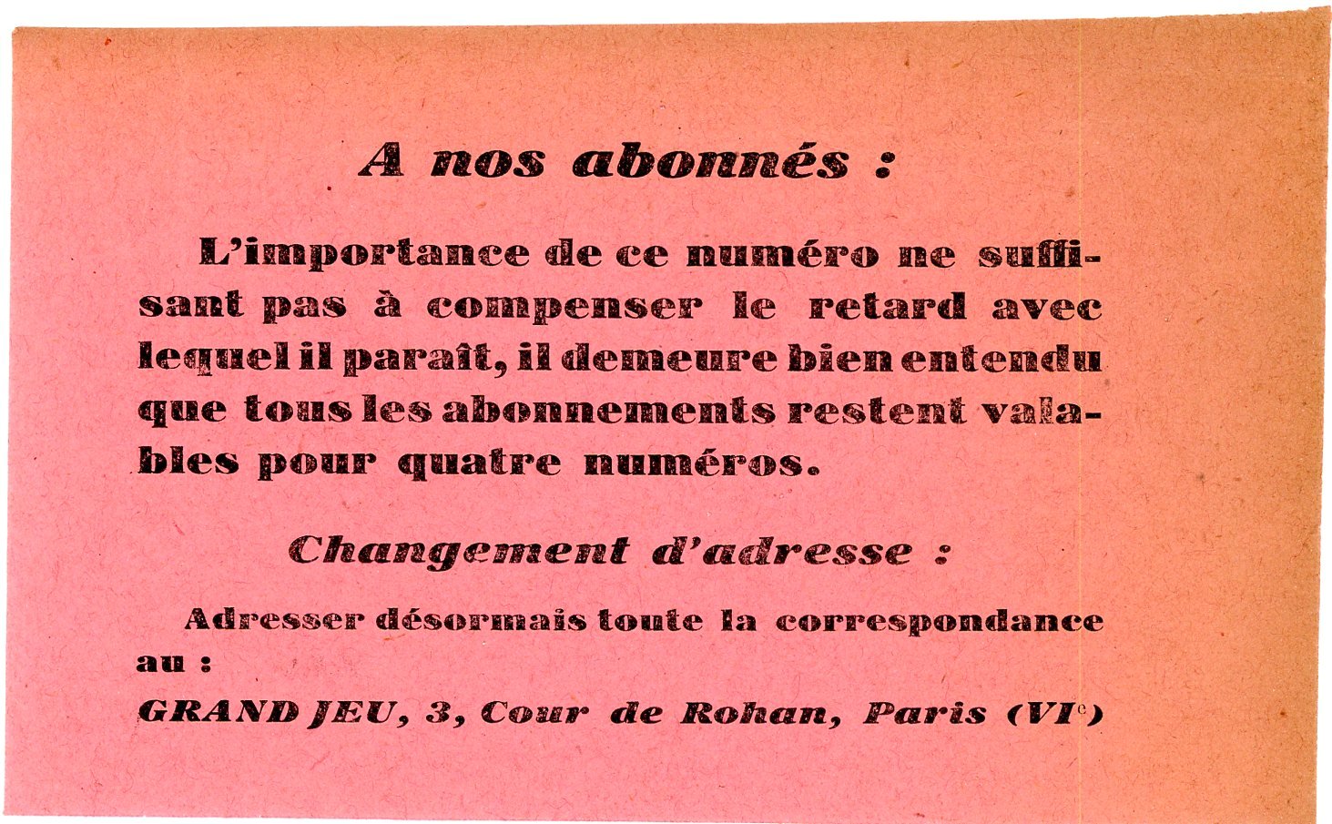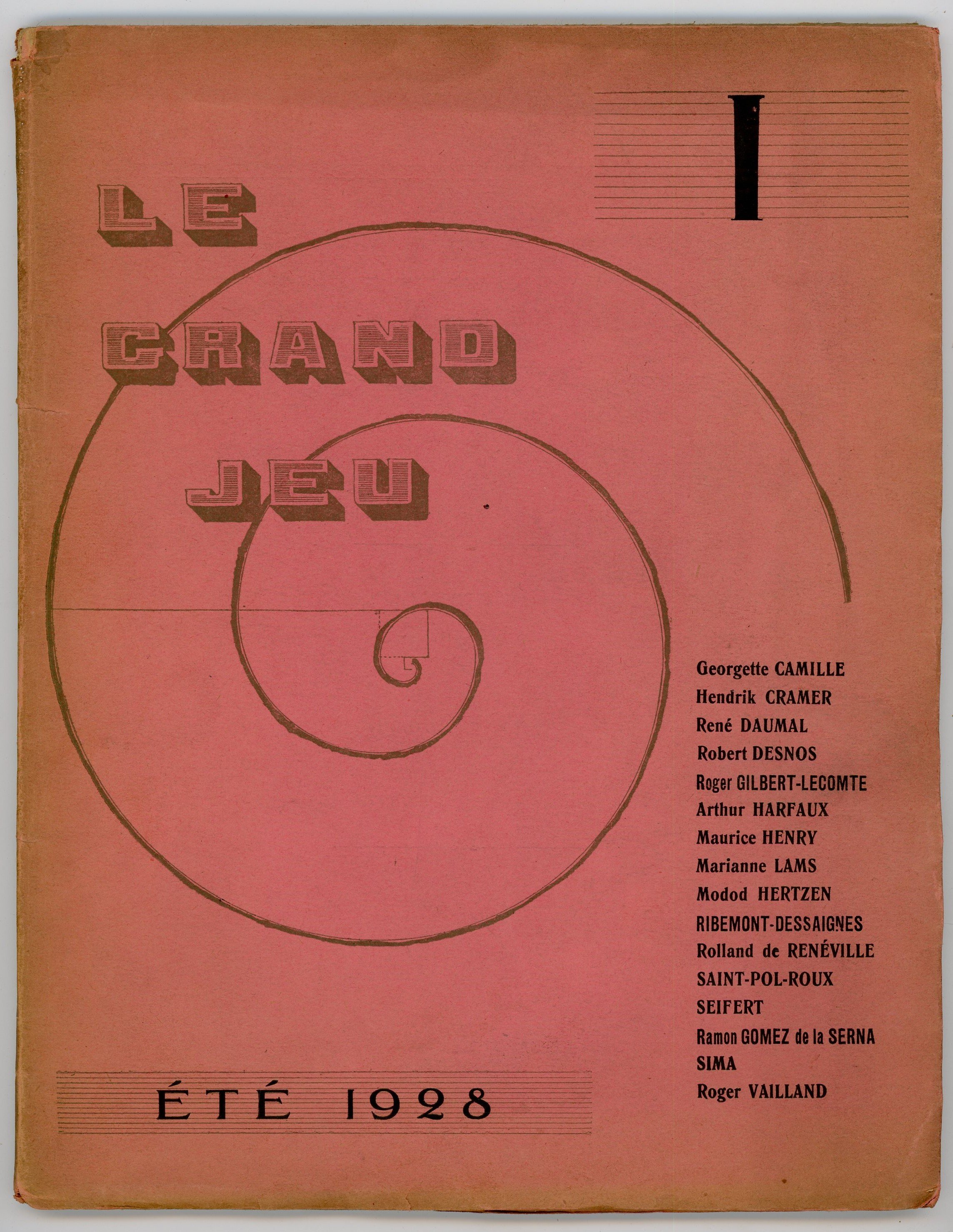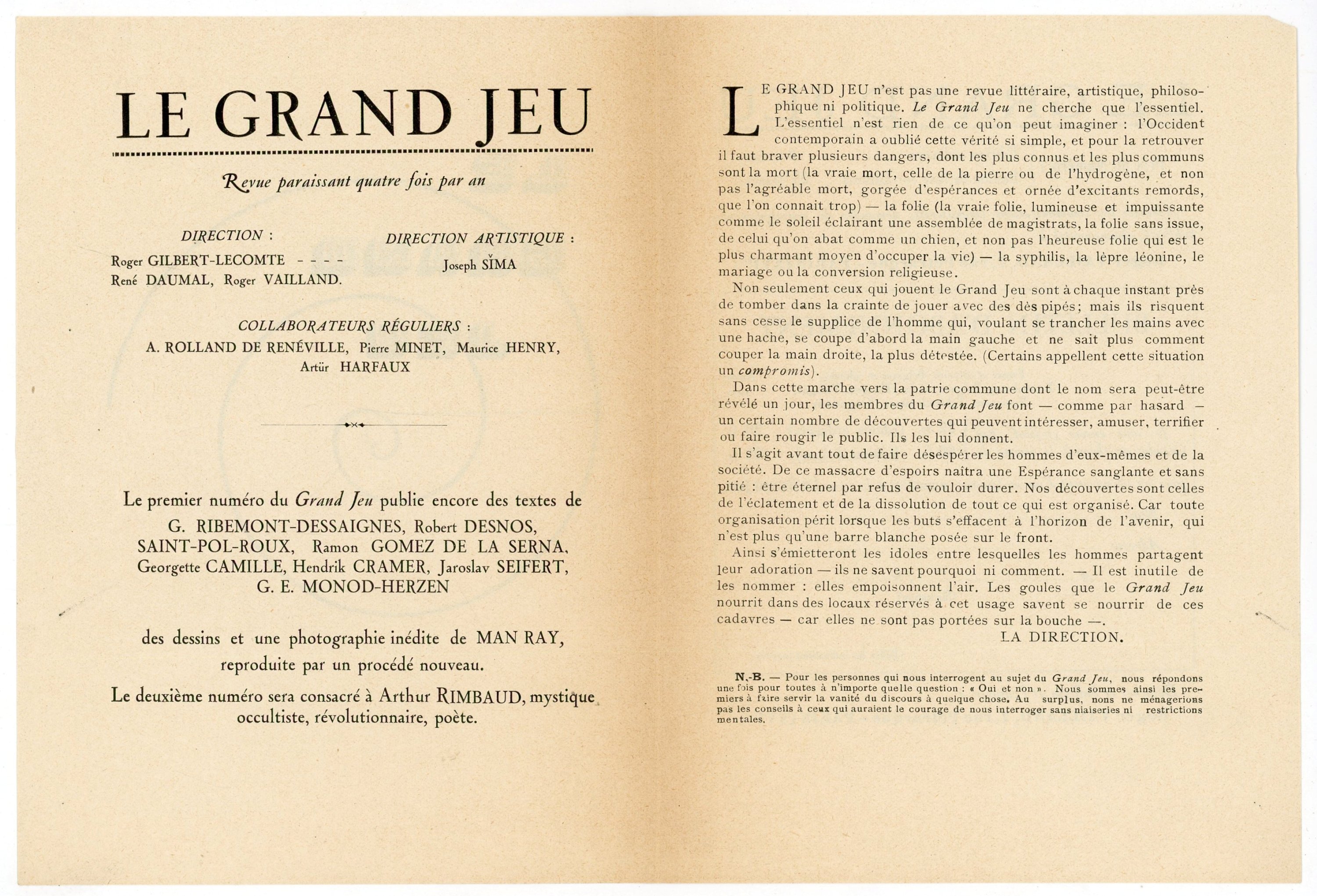 Rare réunion des 3 numéros, br. grand in-8, couv. rempliées. Collection complète de cette revue littéraire et expérimentale parue entre l'été 1928 et l'automne 1930, fondée par René Daumal, Roger Gilbert-Lecomte et Roger Vailland. Elle regroupe des textes littéraires, philosophiques, des chroniques, etc. de Robert Desnos, Ribemont-Dessaignes, Saint-Pol-Roux, Sima, Arp, Monny de Boully, Roger Vitrac, Rolland de Renéville, etc., et quelques dessins et reproductions notamment de Sima, Masson, Maurice Henry et Man Ray. Le numéro 2 est presque exclusivement consacré à Arthur Rimbaud. Dans le numéro 3 figure la Lettre ouverte à André Breton sur les rapports du surréalisme et du Grand jeu rédigée par René Daumal en réponse à l'attaque que Breton avait faite contre lui dans le Second Manifeste du Surréalisme. Un quatrième numéro était en préparation mais ne fut jamais publié. Légères insolations aux couvertures.