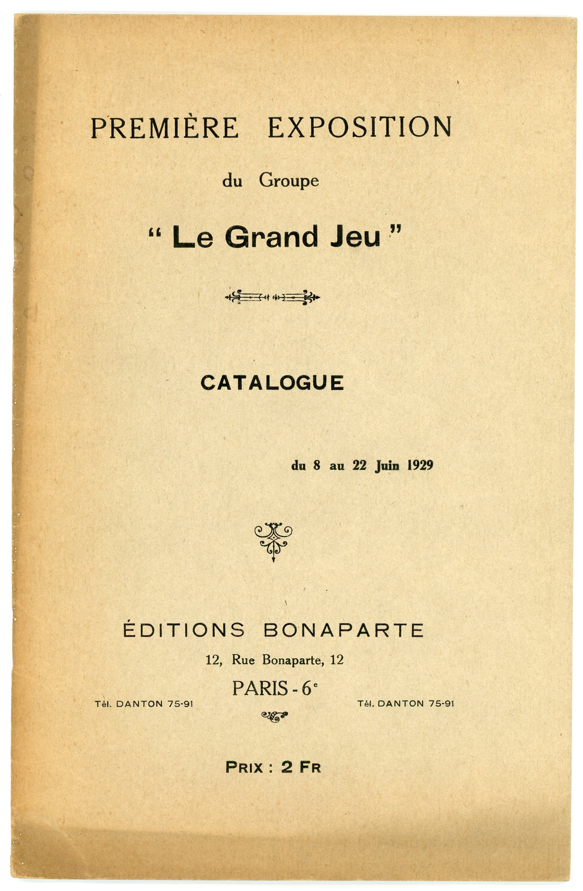 - Catalogue de la Première Exposition du groupe « Le grand Jeu », 1929, br. in-8, 15 pages, 2 reproductions de peintures de Joseph Sima [L'exposition eut lieu à Paris du 8 au 22 juin 1929 à la librairie Bonaparte, rue Bonaparte dans le sixième et présentait des peintures de Joseph Sima, des photographies et dessins de Artür Harfaux, des dessins de Maurice Henry et de Mayo, ainsi que des « sculptures de sauvages » provenant des célèbres collections du docteur Stephen-Chauvet et de Paul Chadourne.] ;