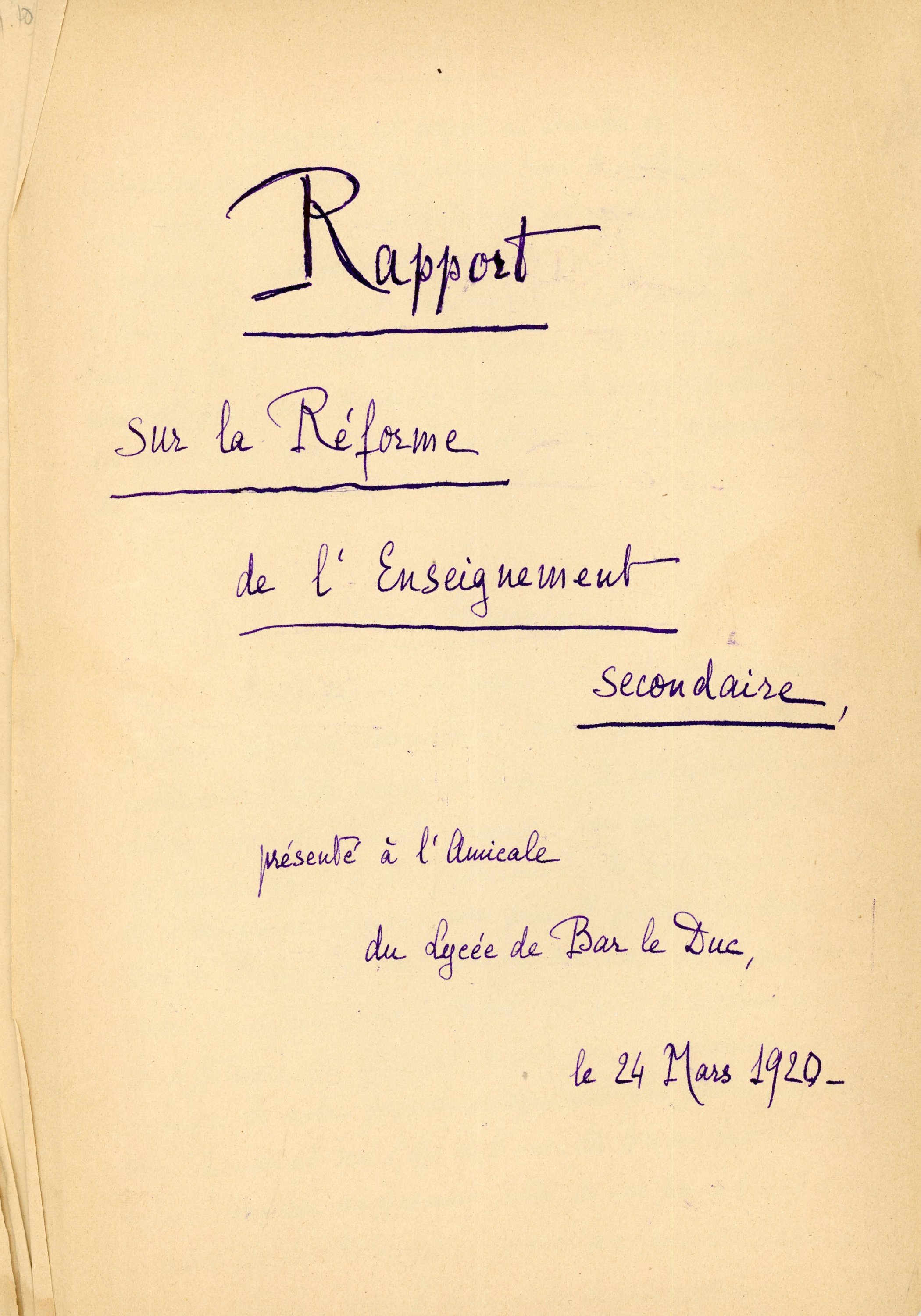 - Syndicalisme de l’enseignement, 1920-1921 : extraits de journaux, statuts de syndicats divers, notes manuscrites de Maublanc dont celles de son exposé fait au lycée de Bar le Duc le 13 février 1920, appelant à la formation d’un syndicat des enseignants ; Amicale du lycée de Bar Le Duc, 1920 : « Rapport sur la réforme de l’enseignement secondaire » présenté à l’Amicale du lycée de Bar le Duc le 24 mars 1920, 39 pages ronéotées in-fol., 3 exemplaires ; Manuscrit de R.M. sur les résultats de l’enquête menée par ses soins ; L.A.S., 19 avril 1920, de Lucy Prenant, 2 pages in-4, exposant ses propositions de réforme ;