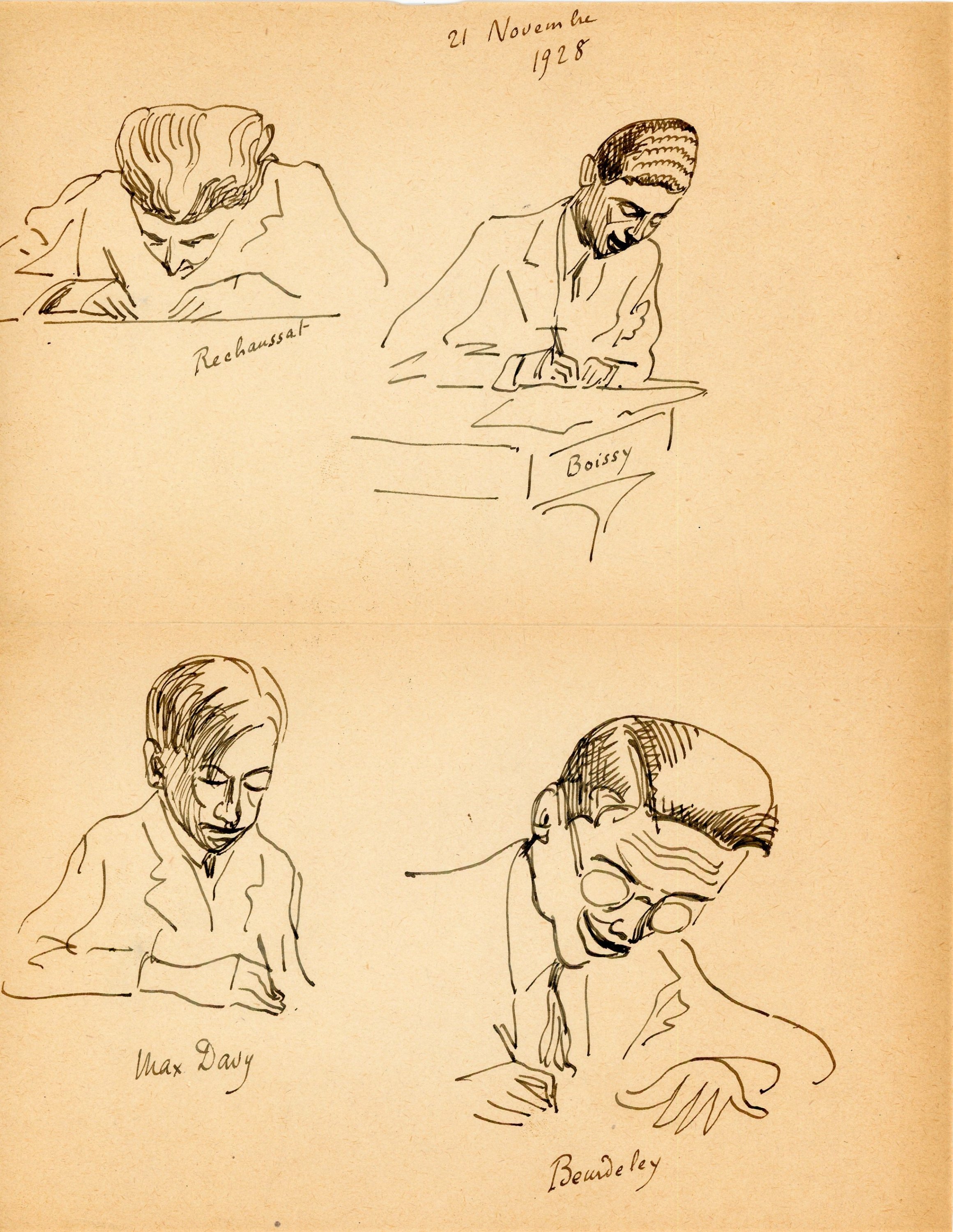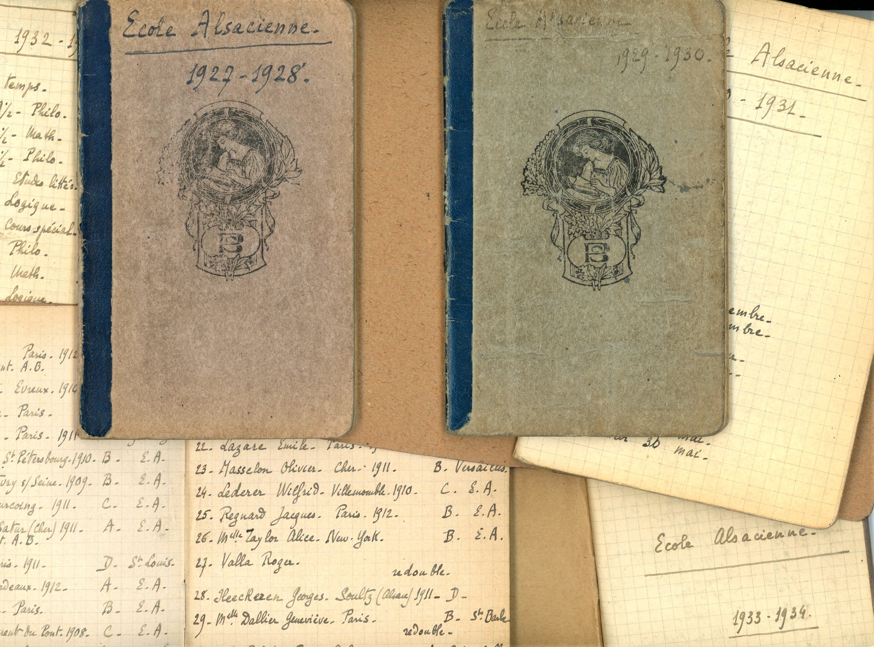 - 7 petits carnets manuscrits, env. 15 x 9 cm, 1927-1934, titrés et datés. Dans chaque carnet, R.M. y mentionne la liste des élèves par niveau, les tableaux de notes, l’emploi du temps, les dates de compositions, etc ;