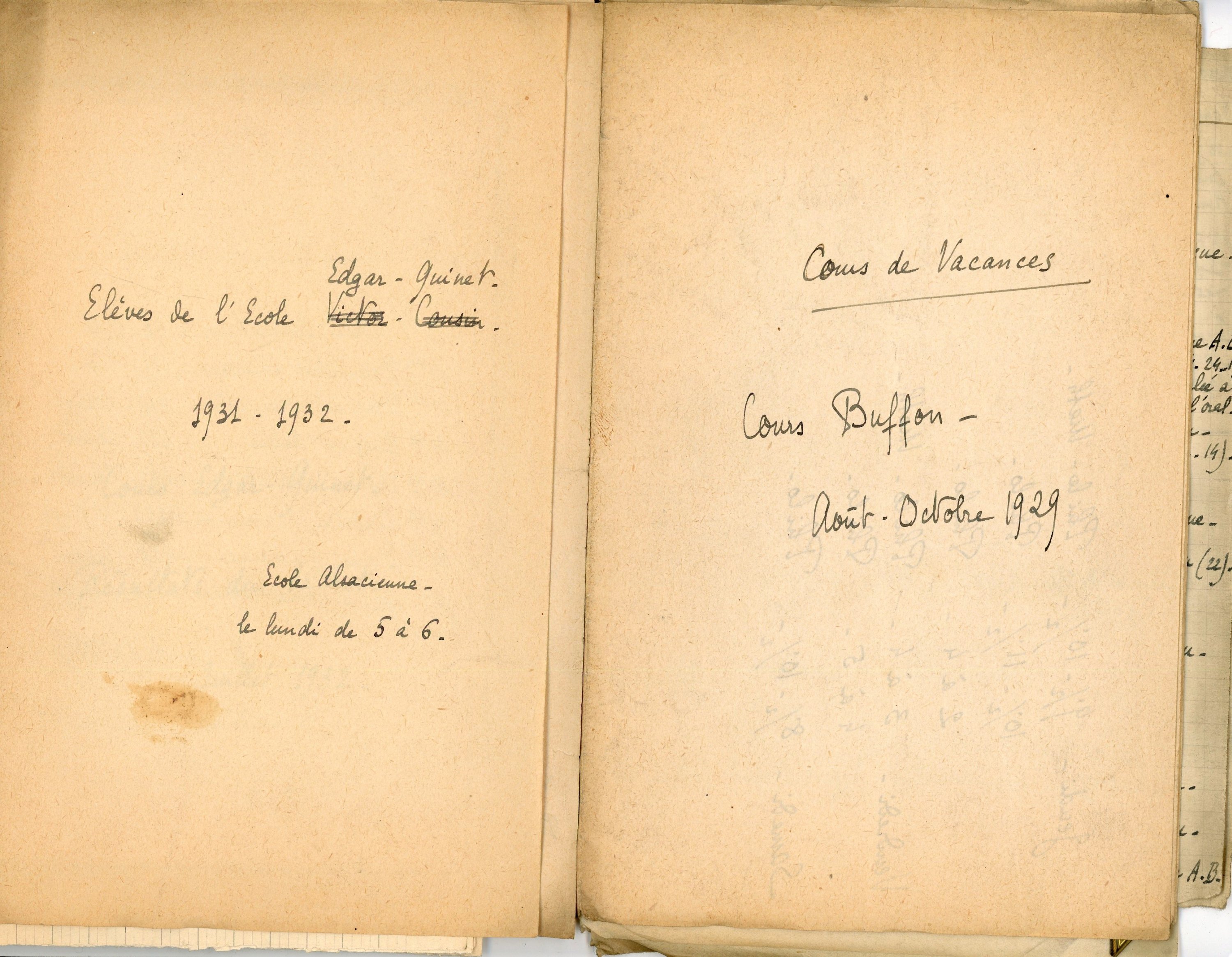- Cours privés et de vacances : 17 petits dossiers, classés par année scolaire et par discipline, contenant listes des noms des élèves, tableaux de notes et appréciations, sujets de compositions, etc, 1929-1939 ; 11 L.A.S. d’élèves (tapirs) ou de parents de tapirs ; Notes manuscrites de sujets et de notations dispensées aux cours de vacances au collège de Sévigné durant les étés 1941 et 1942 ;
