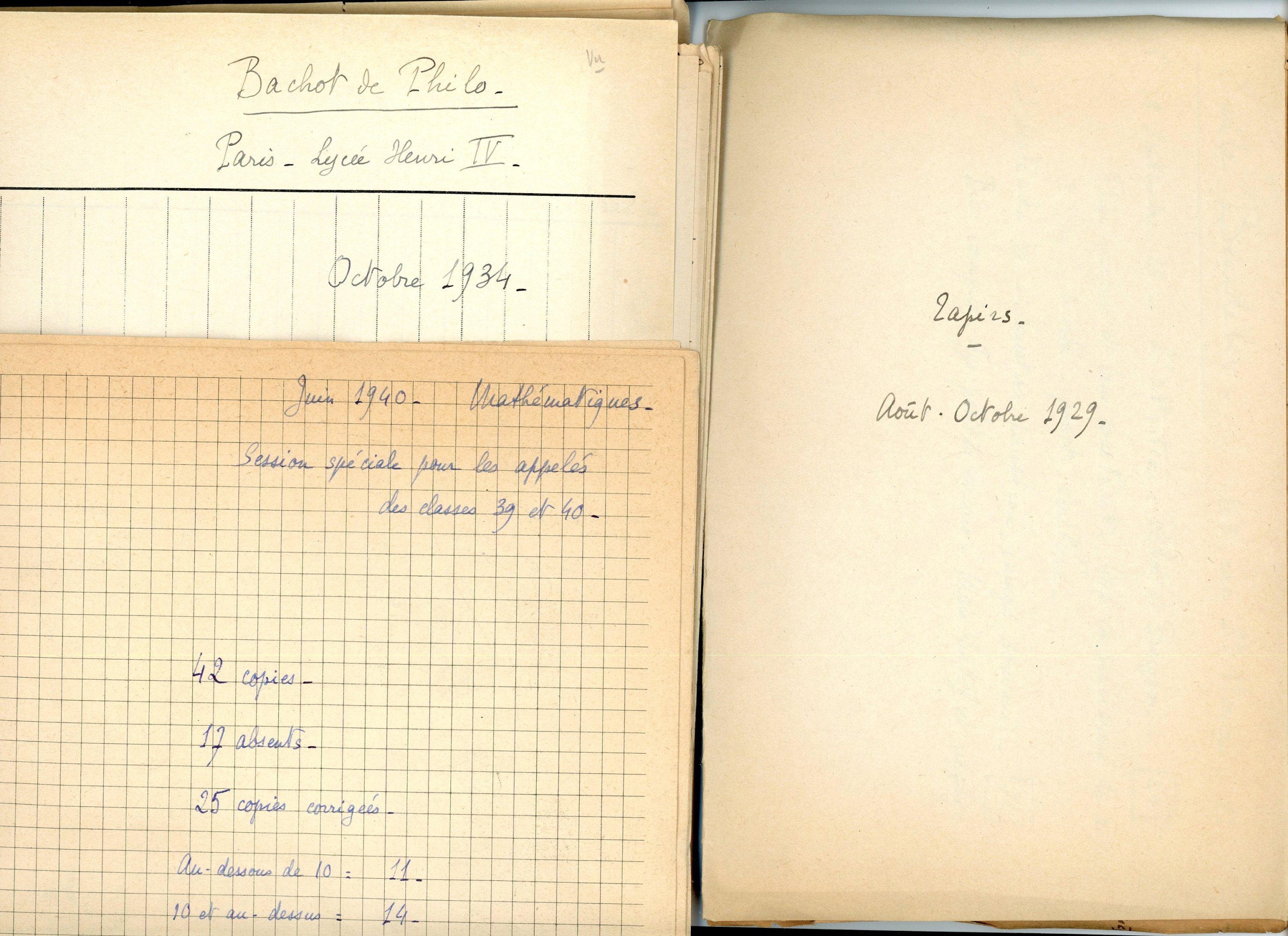 - Le Bachot : Réunion de 19 petits dossiers, classés par année et lieux d’examens, contenant listes des noms des candidats, notes et appréciations, sujets des écrits et des oraux de philosophie, etc, pour les années 1920 à 1922, 1934 à 1940 et 1946 ; 14 L.S. ou P.A.S., 1932-1954 ; Brouillon manuscrit de la lettre écrite le 2 novembre 1948 par R.M. au recteur d’académie au sujet de son hostilité aux évolutions du programme de philosophie.