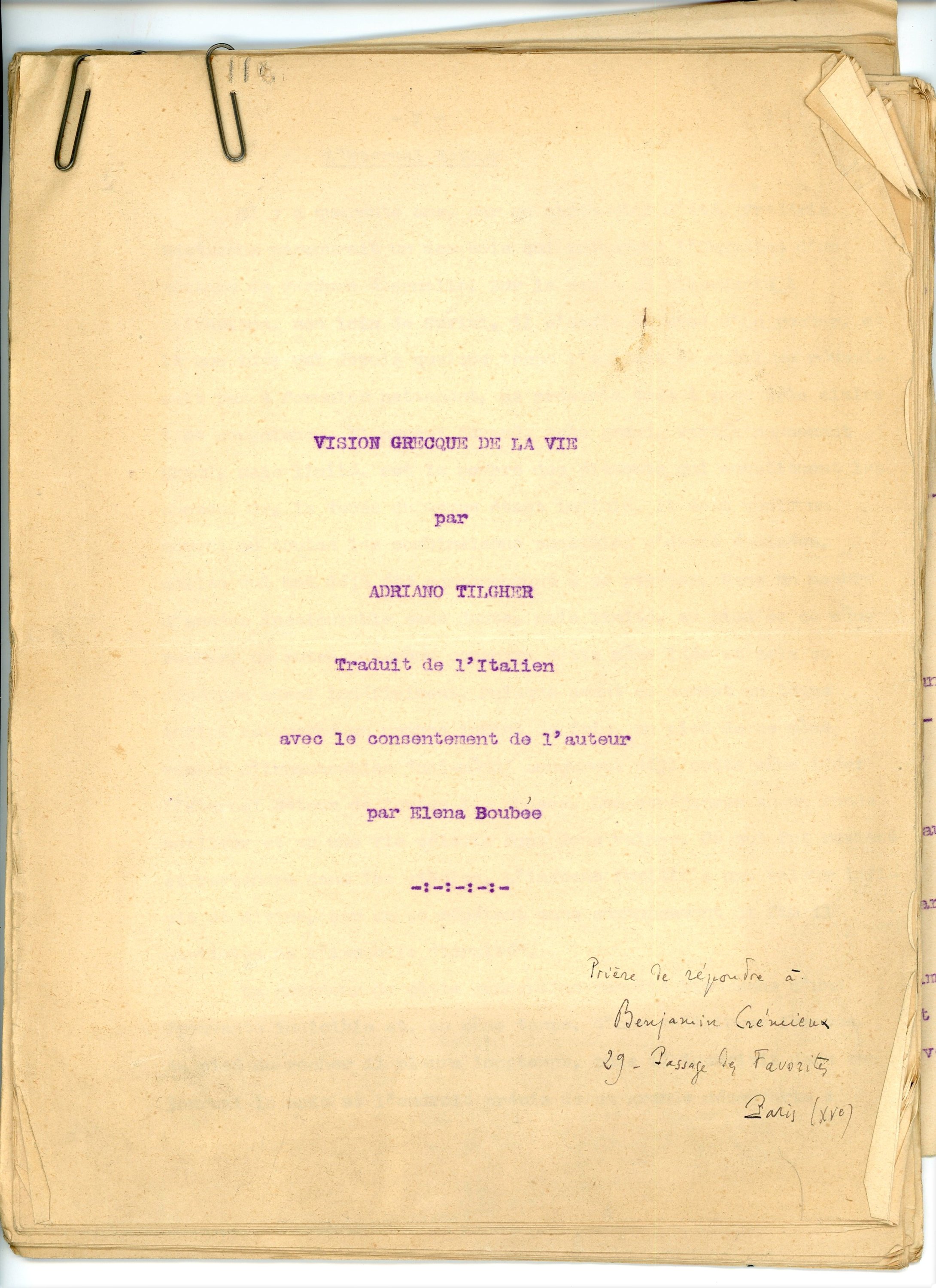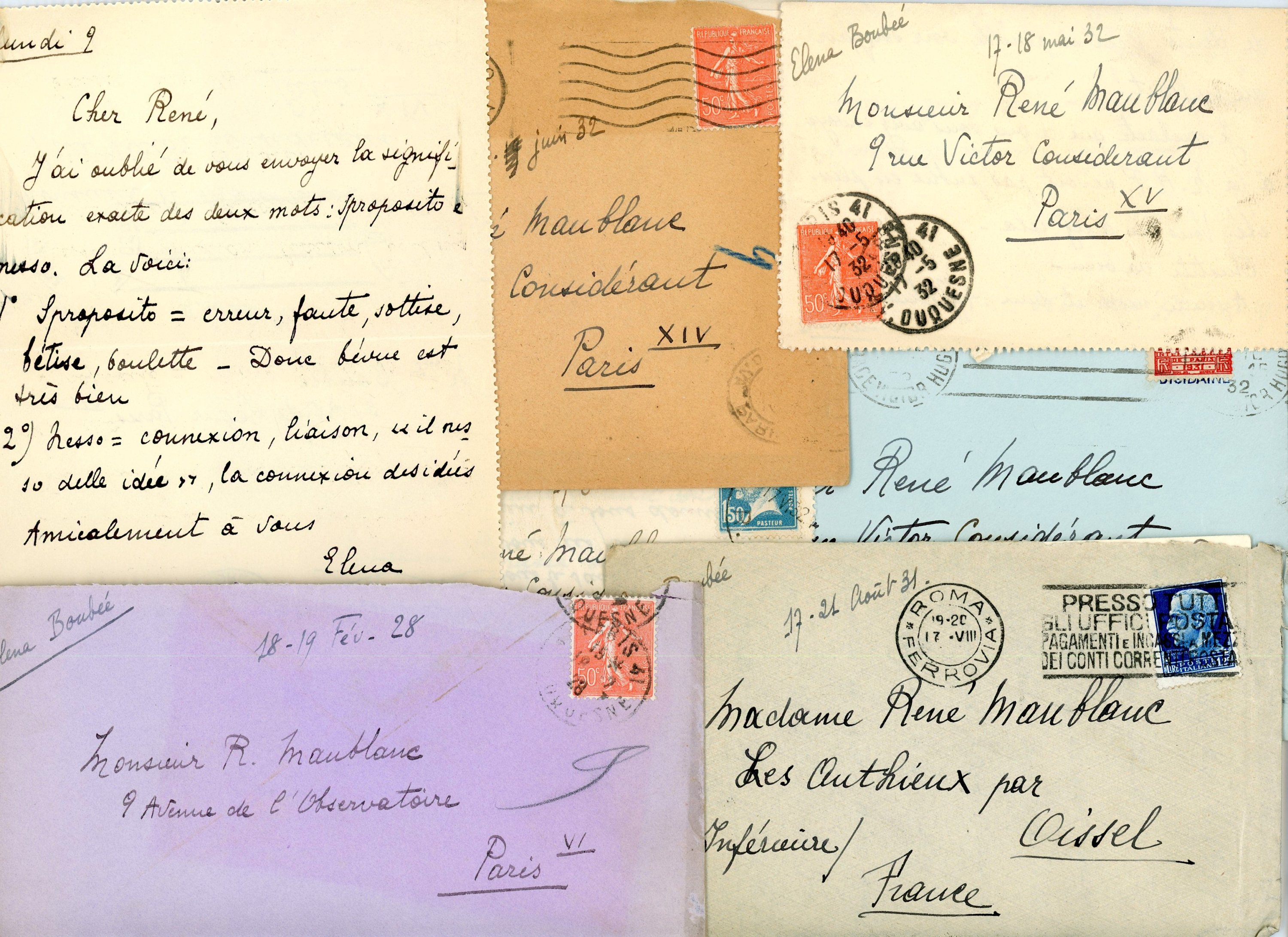 - Divers manuscrits : 2 manuscrits de la traduction en français de « Art et vie dans lesthétique » de Benedetto Croce, 424 pages in-folio ; Tapuscrit de « La Danza Nuziale » de Cavalluccio Marino, 45 pages in-4 ; Tapuscrit de « Les aventures de Pinocchio » par Carlo Collodi, traduite par Elena Boubée, 84 pages in-4 ; Manuscrit inédit de la traduction de « Vision grecque de la vie » par Adriano Tilgher ;