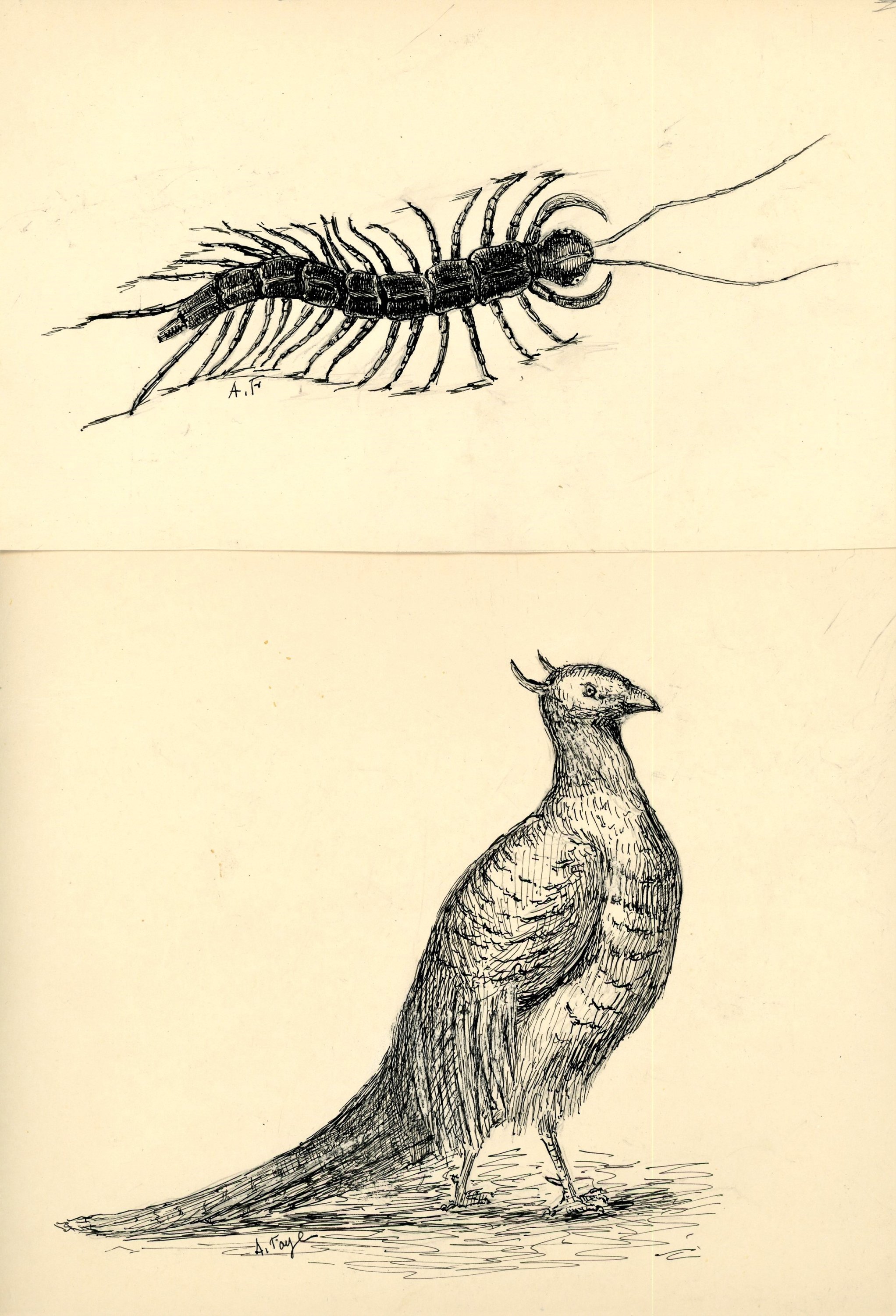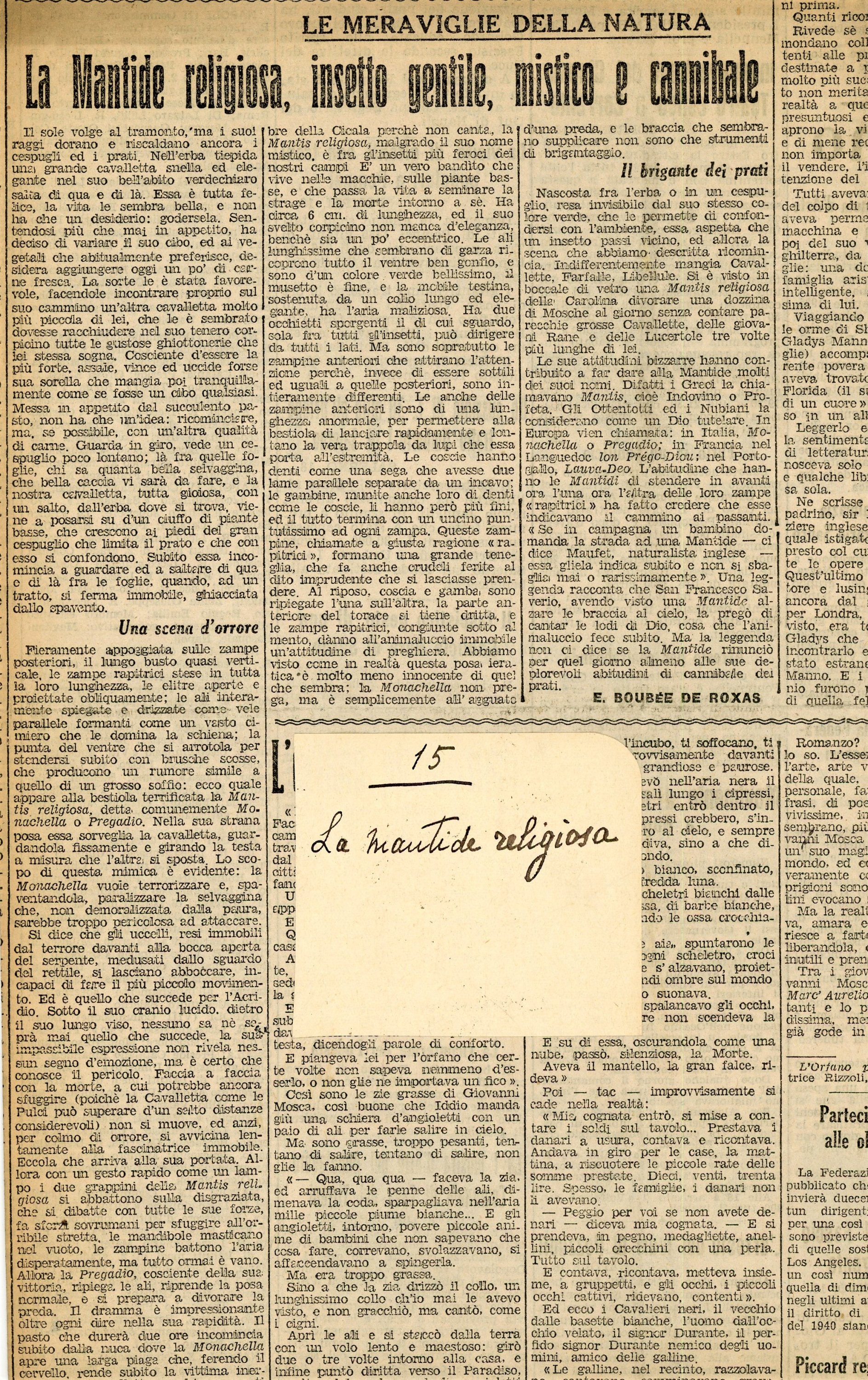 - Réunion de manuscrits écrits en italien ayant pour sujet la nature (phoques, éphémères, etc) avec 4 illustrations signées « A. Faye » (André Faye ?) en vue de publication dans le journal italien « Il popolo di Roma » + 3 extraits darticles signés « Elena Boubée de Roxas » parus en 1933-1934 ;