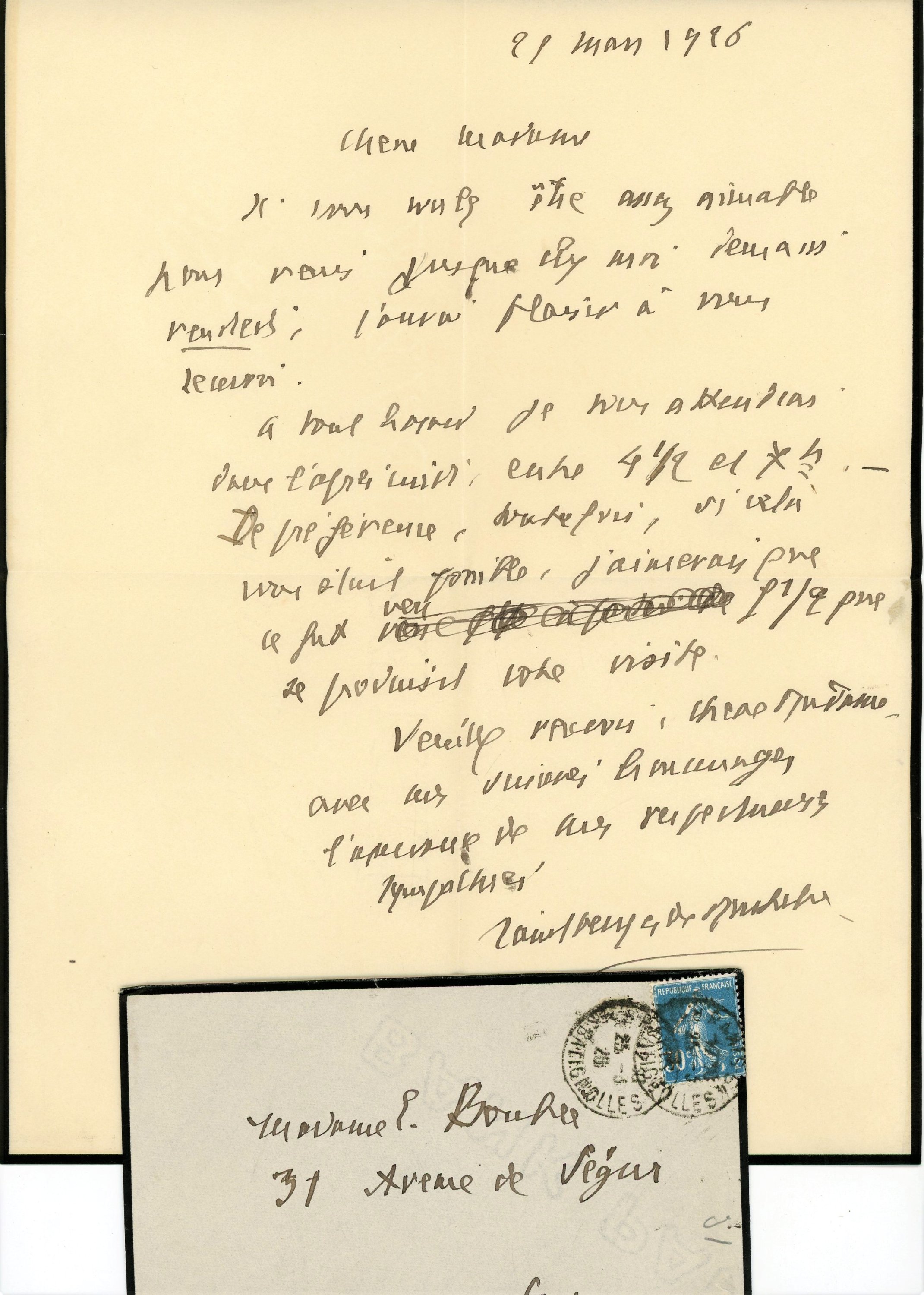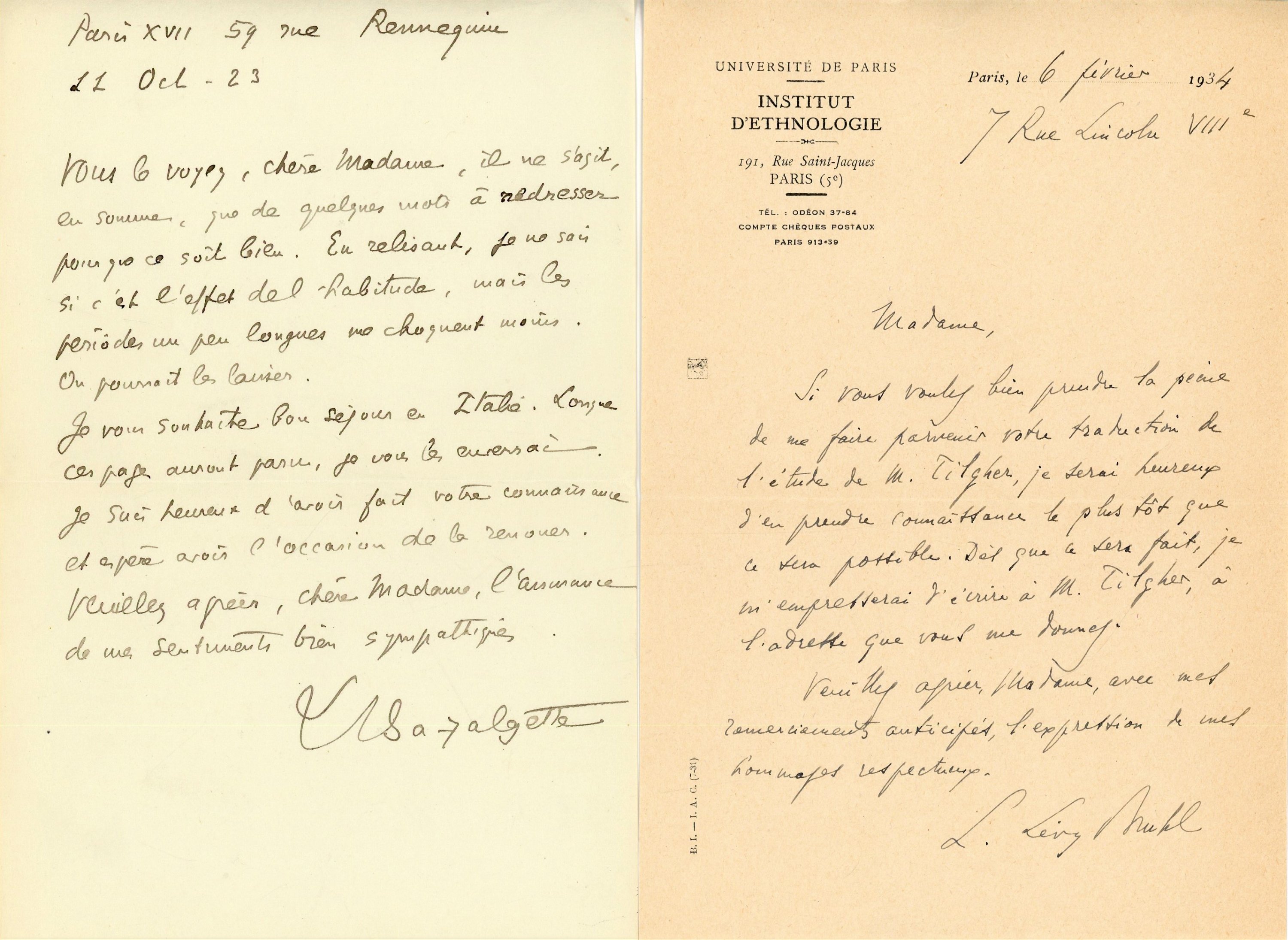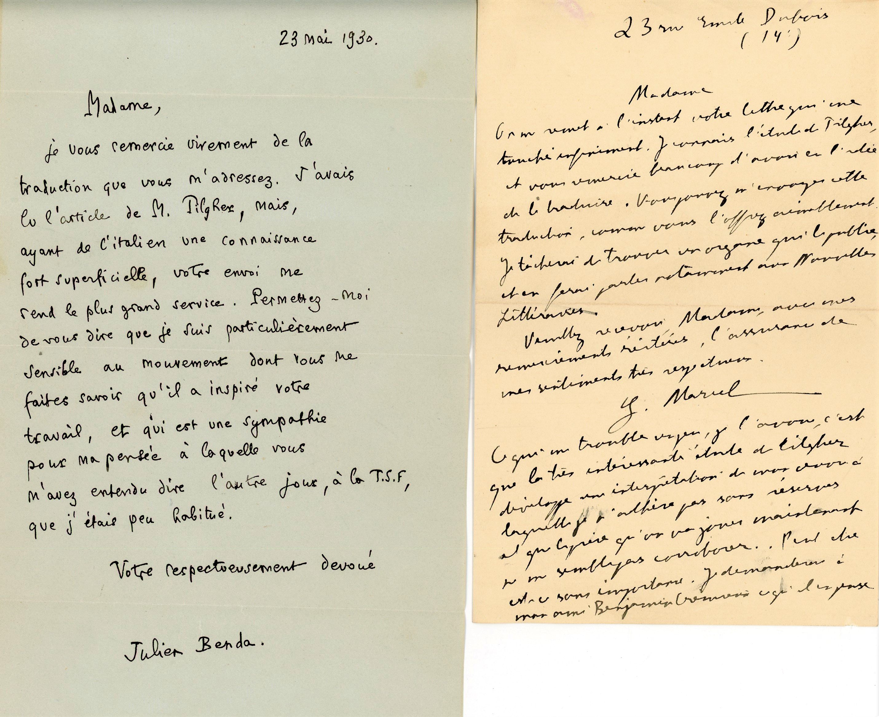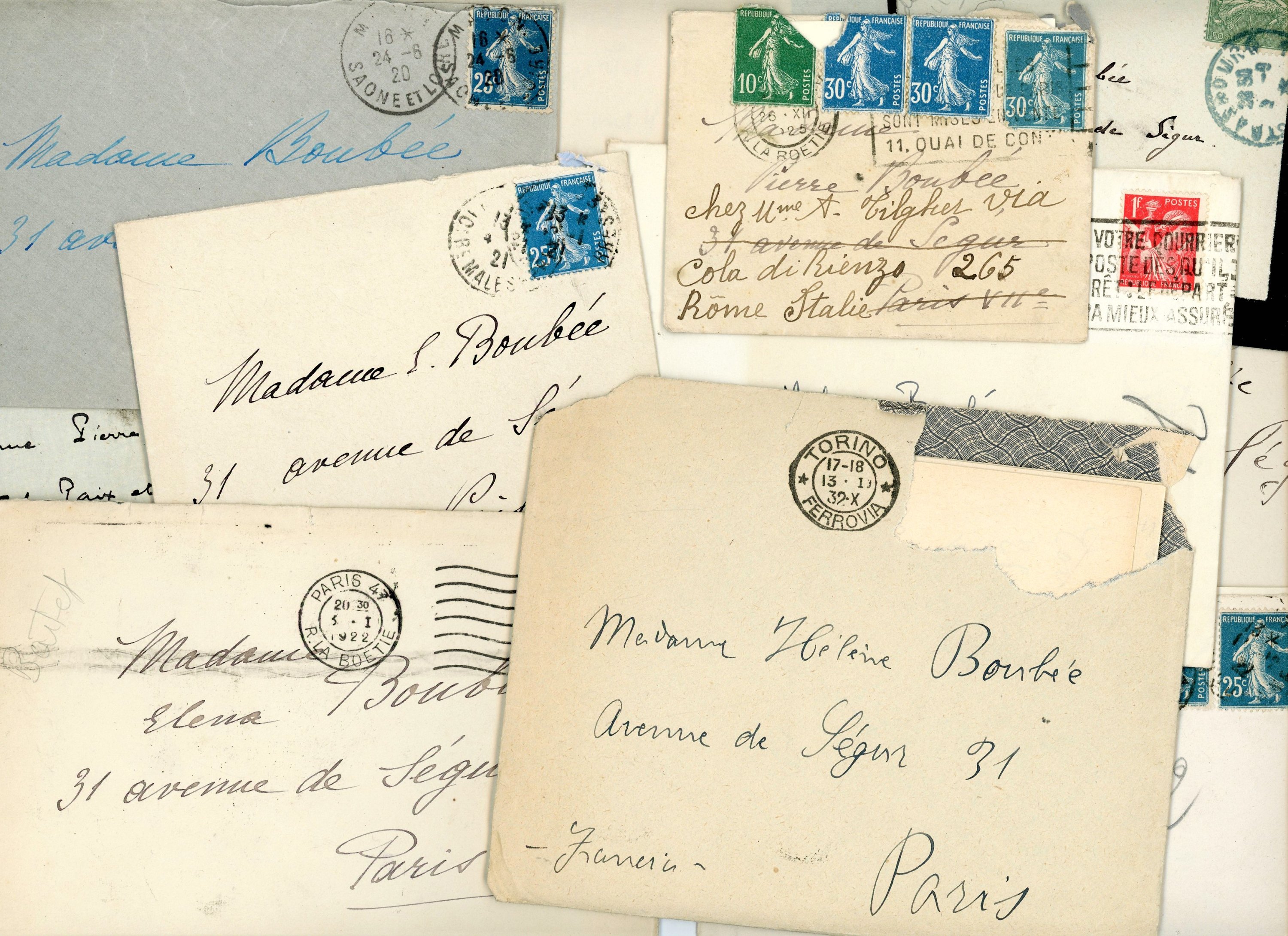 - Correspondance adressée à Elena Boubée en provenance dintellectuels et dartistes, en majorité avec enveloppes : 9 L.A.S. Léon BALZAGETTE (1873-1928), écrivain ; 3 P.A.S. et carte de visite Julia BARTET (1854-1941), comédienne ; L.A.S. Julien BENDA (1867-1956), philosophe ; L.A.S. Yvette GUILBERT (1867-1944), chanteuse ; L.A.S. André HALLAYS (1859-1930), écrivain ; 3 L.A.S. Henri HAUVETTE (1865-1935), homme de lettres ; L.A.S. Frantz Philippe JOURDAIN (1906-1989), architecte ; L.A.S. Lucien LÉVY-BRUHL (1857-1939), philosophe ; 4 L.A.S. Gabriel MARCEL (1889-1973), philosophe ; 2 L.A.S. Édouard SCHNEIDER (1880-1960), homme de lettres ; 2 L.A.S. Édouard SCHURÉ (1841-1929), philosophe ; 2 L.A.S. Luigi SALVATORELLI (1886-1974), historien ; L.A.S. Mariette SULLY (1878-1950), vedette dopérette etc.
