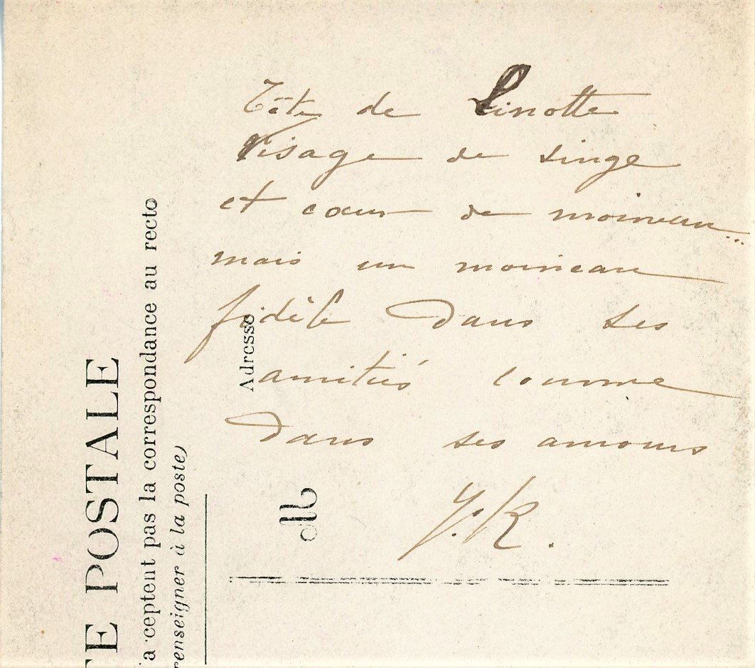 Joint : carte photo avec texte manuscrit au dos « Tête de linotte, visage de singe, et cur de moineau, mais un moineau fidèle dans les amitiés comme dans ses amours » signé « Y. K. » - Portrait photographique de femme.