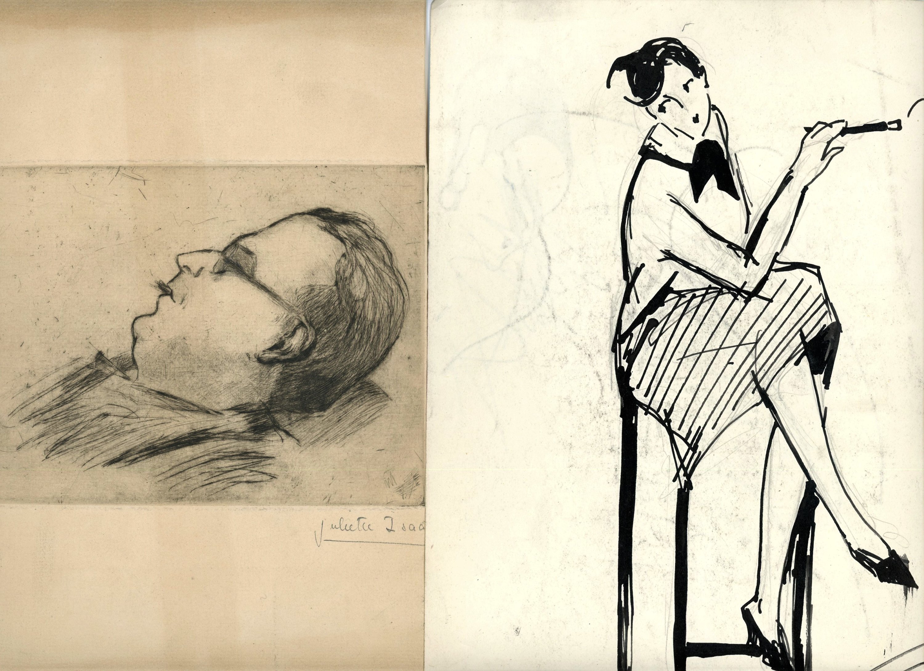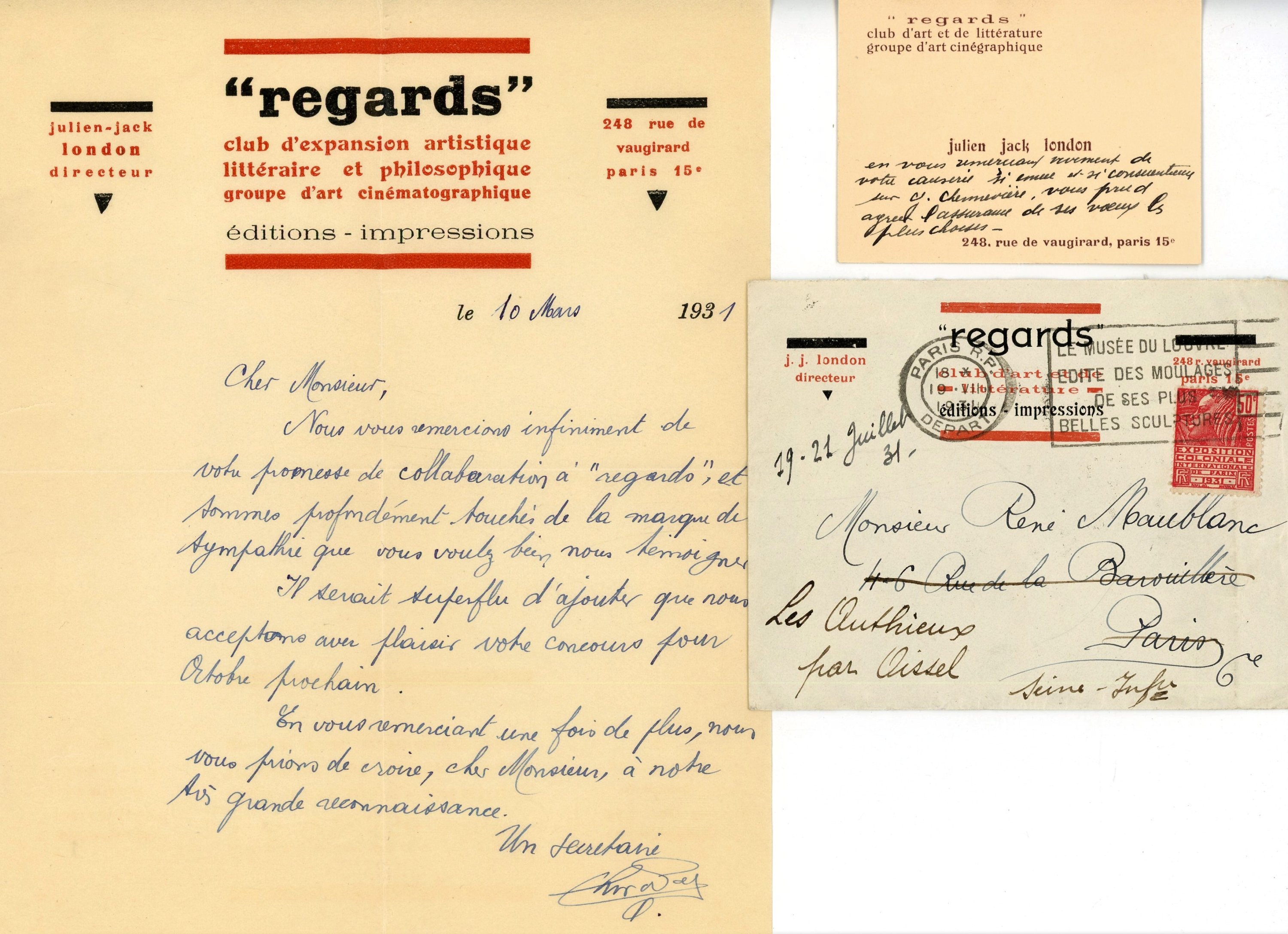 L.A.S. Pierre SICHEL (1899-1983), peintre ; 2 L.A.S. Pierre Louis FLOUQUET (1900-1967), écrivain peintre et poète, au sujet de la création dune revue de poésie ; 15 L.A.S. Erich LEHMANN, réfugié allemand et critique dart ; 11 P.A.S. Juliette ISAAC (1903-1943 à Auschwitz), artiste peintre, fille du professeur Jules Isaac et épouse du journaliste Robert Boudeville, amie et partenaire de René Maublanc à lacadémie Colarossi + 5 croquis à la mine de plomb et encre, formats divers + P.A.S. Laure ISAAC née Ettinghausen (1978-1943 à Auschwitz), artiste peintre et mère de Juliette ISAAC ; Edouard AUTANT et Louise LARA, L.A.S. à entête « Art et Action, laboratoire de théâtre pour laffirmation et la défense doeuvres modernes » + publication « Art et Action, le théâtre universitaire, 1911-1934 », br. in-4, 214 pages, avec envois autographes signés ; Rose ADLER, relieuse et décoratrice (2) ; Jean BAZAINE, peintre ; André BERLEY, acteur (2) ; Fanny BUNAND-SEVASTOS, peintre ; Centre de préparation dramatique ; Paul CHWAT, secrétaire du club dexpansion artistique « Regards » (5) ; André DELFERRIÈRE ; Roger DÉSORMIÈRE, chef dorchestre ; Jacqueline FERNAY, comédienne ; Jean FOURNET, chef dorchestre (2) ; Henri GUILAC, caricaturiste et illustrateur ; Paul HAASEN, peintre et graveur (2) ; Maurice JACQUELIN, comédien et metteur en scène ; Victor LALOUX, architecte (2) ; Henri LESIEUR, directeur de théâtre ; Julien Jack LONDON, directeur du club artistique « Regards » ; Max MAUREY, directeur du théâtre des Variétés ; Jean PICART LE DOUX, peintre ; Léon ROSENTHAL, critique dart, sur entête « LArt de France » ; Matéï ROUSSOU, dramaturge moldave (4) ; Denise STERNBERG, pianiste (13) ; Simone TAVERNIER, comédienne (3) ; Pierre VORMS, galeriste ; etc ;