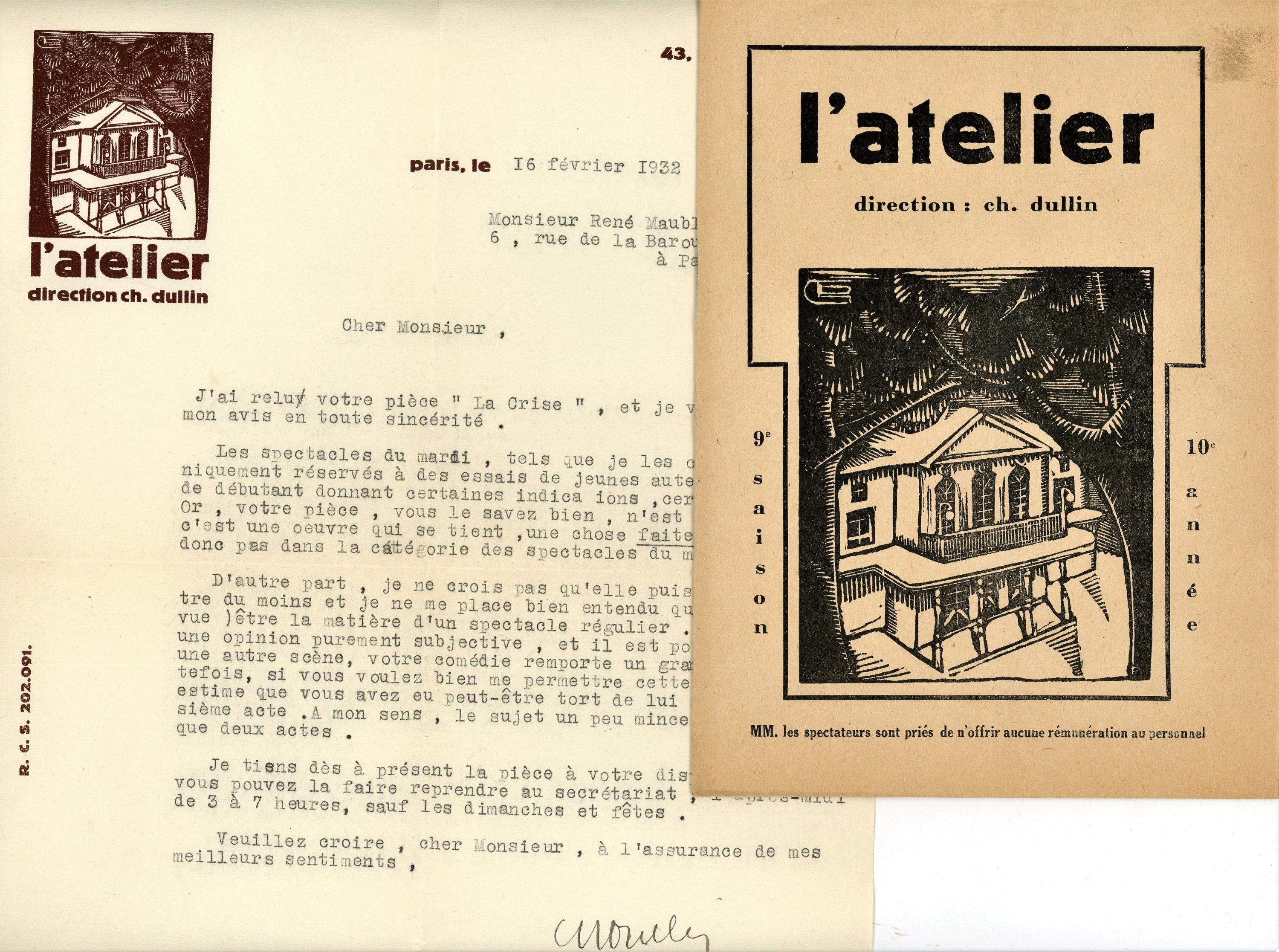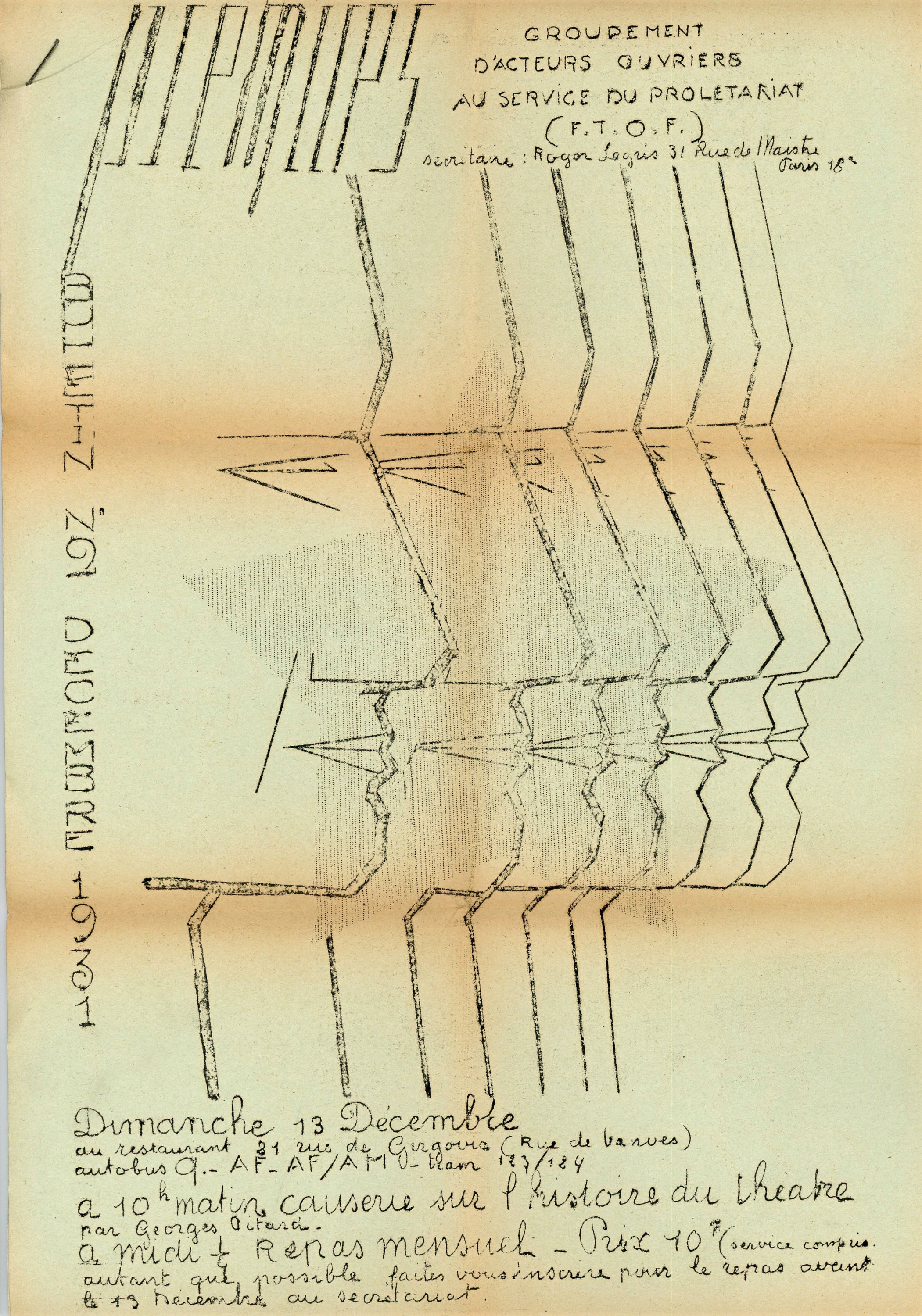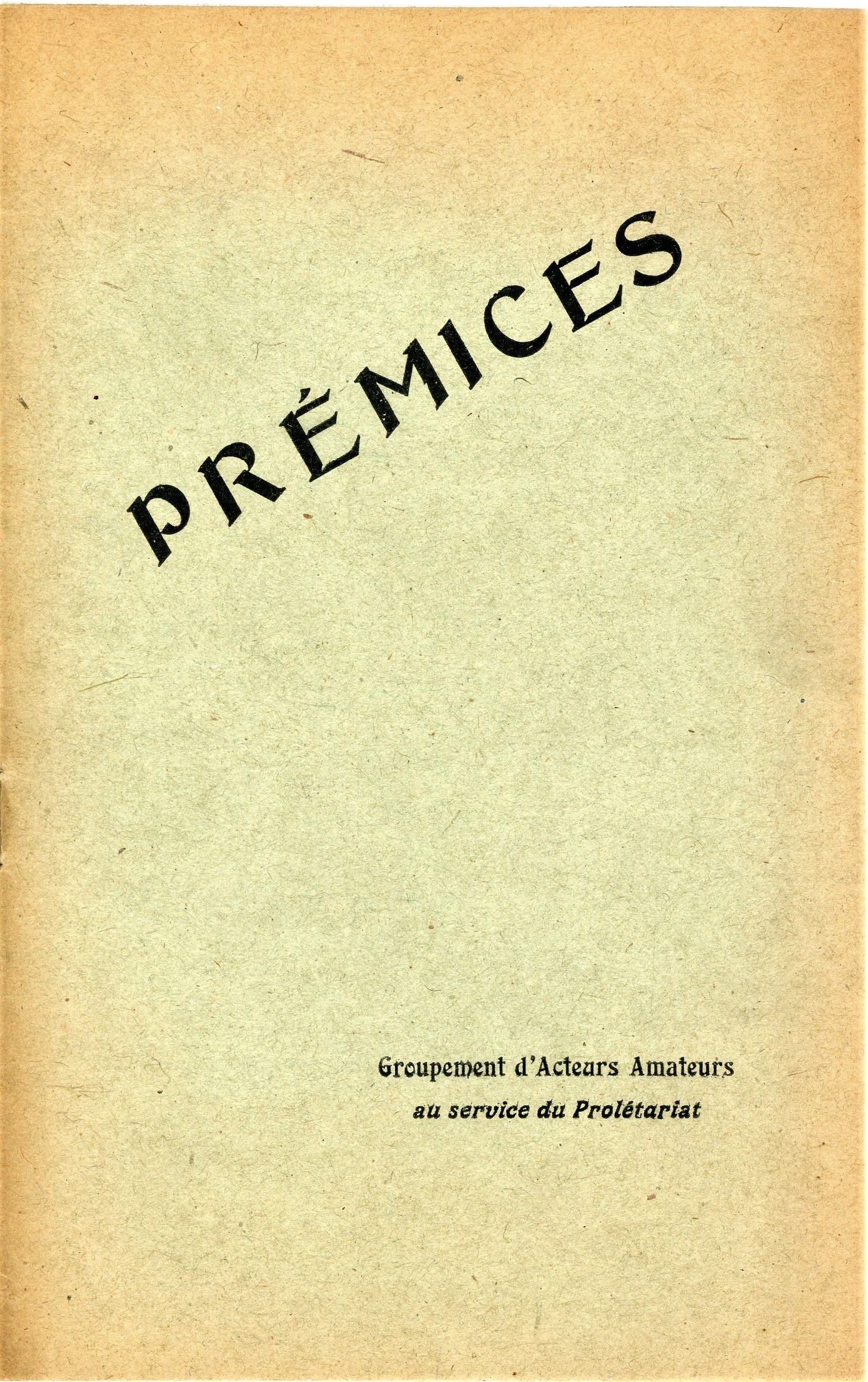 Le groupe théâtral « PRÉMICES » : L.A.S. Roger LEGRIS (1898-1981), acteur et metteur en scène ; + Brochure « Prémices Groupement dacteurs amateurs au service du prolétariat », présentation et statut, 11 pages in-8 ; 3 rares bulletins dinformation ronéotypés ou dactylographiés du groupe « Prémices », août, novembre et décembre 1931 ; Lettre dinformation, octobre 1932, annonçant le changement de titre de « Prémices » pour « Masses » ;