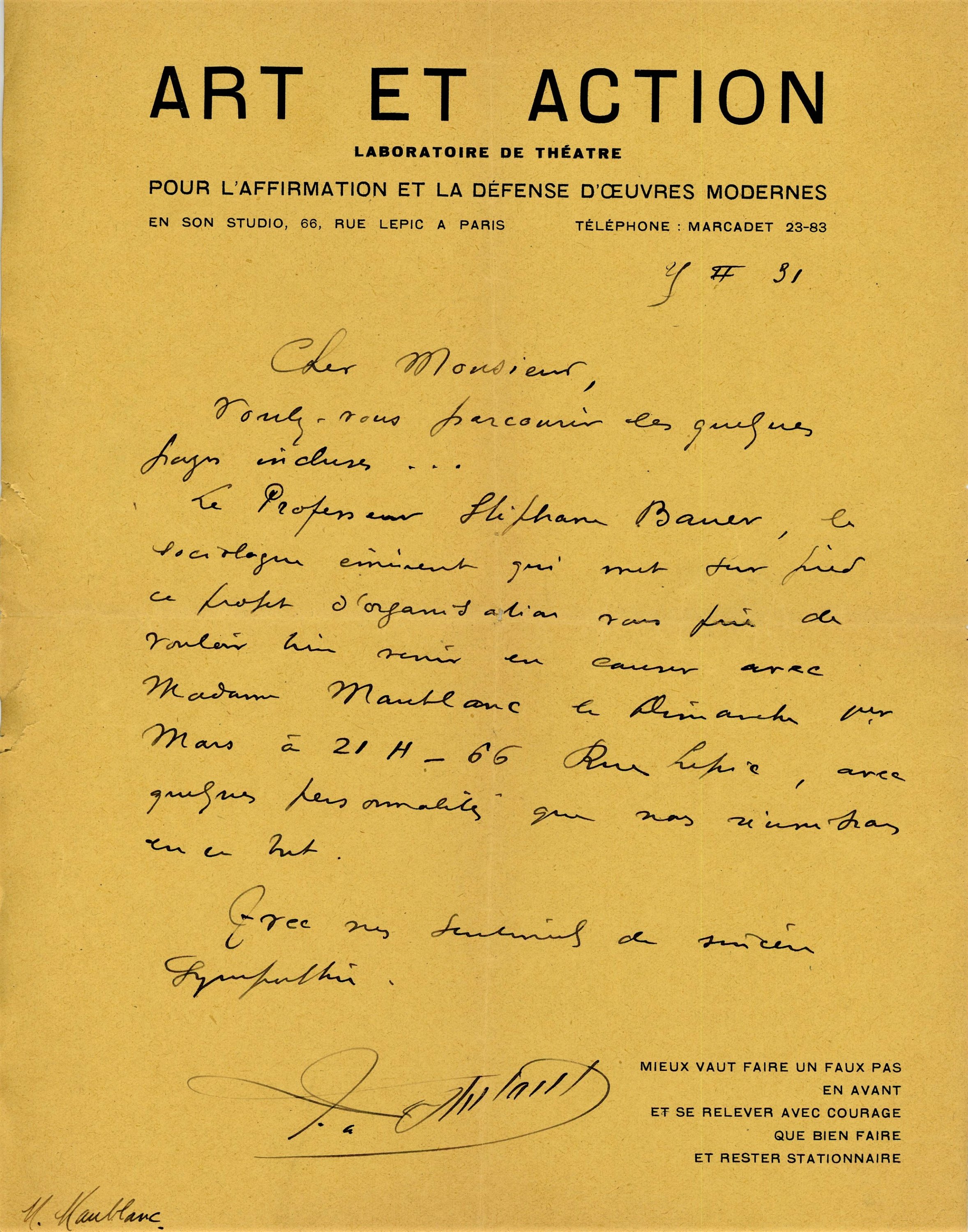 Lot de + de 120 pièces, correspondance de comédiens, metteurs en scène, acteurs, directeurs de théâtre (principalement davant-garde et dagitation-propagande), musiciens, peintres, décorateurs, dont :
