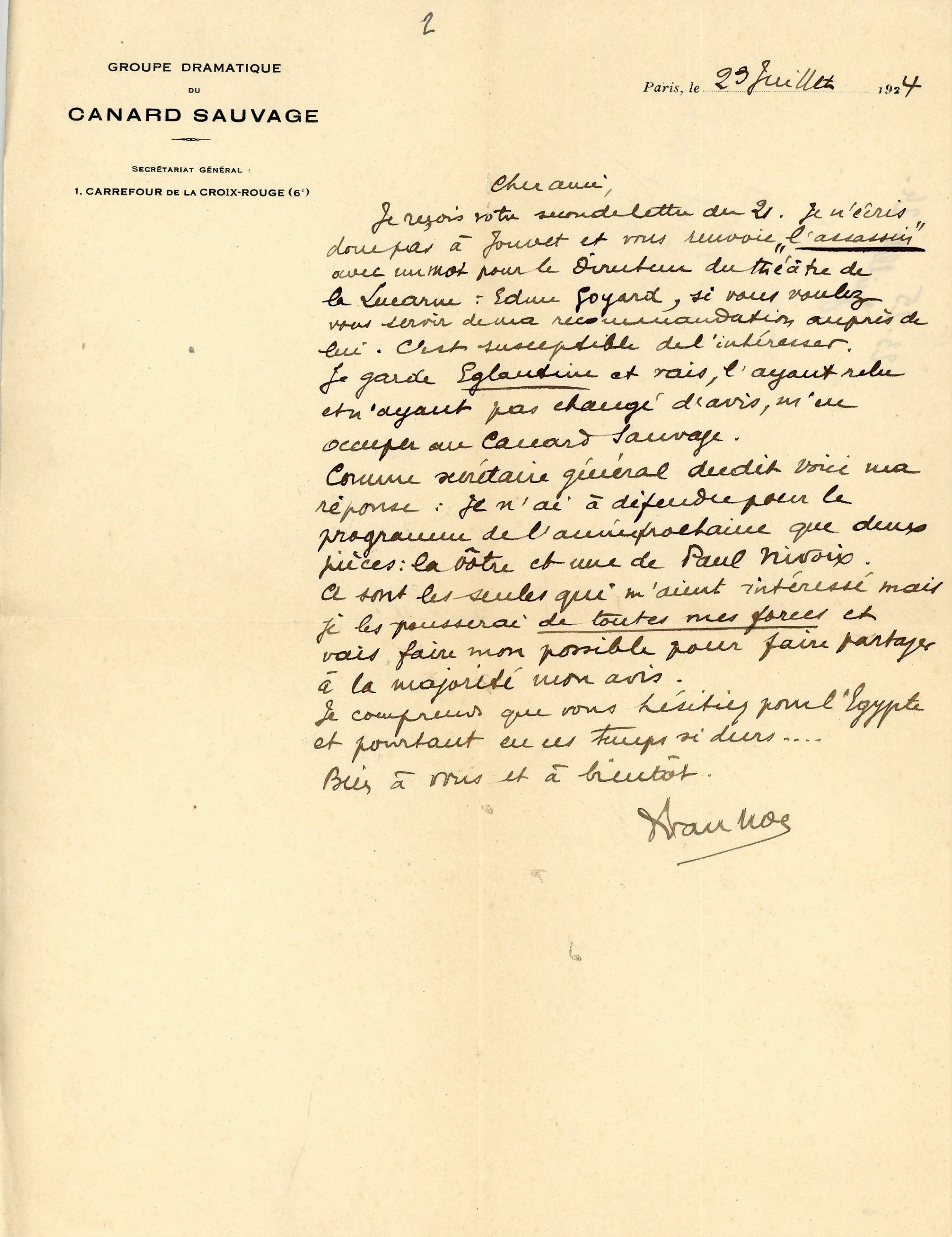 Pierre BOST, tapuscrit (inédit ?) dune comédie, vers 1925, 10 pages in-4 ; 4 L.A.S. Jean SARMENT (1897-1944), acteur ; 6 L.A.S. Etienne DECROUX (1898-1991), acteur, mime et chorégraphe ; L.A.S. Yvan NOÉ (1895-1963), à entête du « Groupe dramatique du Canard Sauvage » ; L.S. Charles DULLIN (1885-1949), directeur de la scène « LAtelier » + « latelier - Musse, ou lécole de lhypocrisie (Jules Romains) », br. in-8 ;