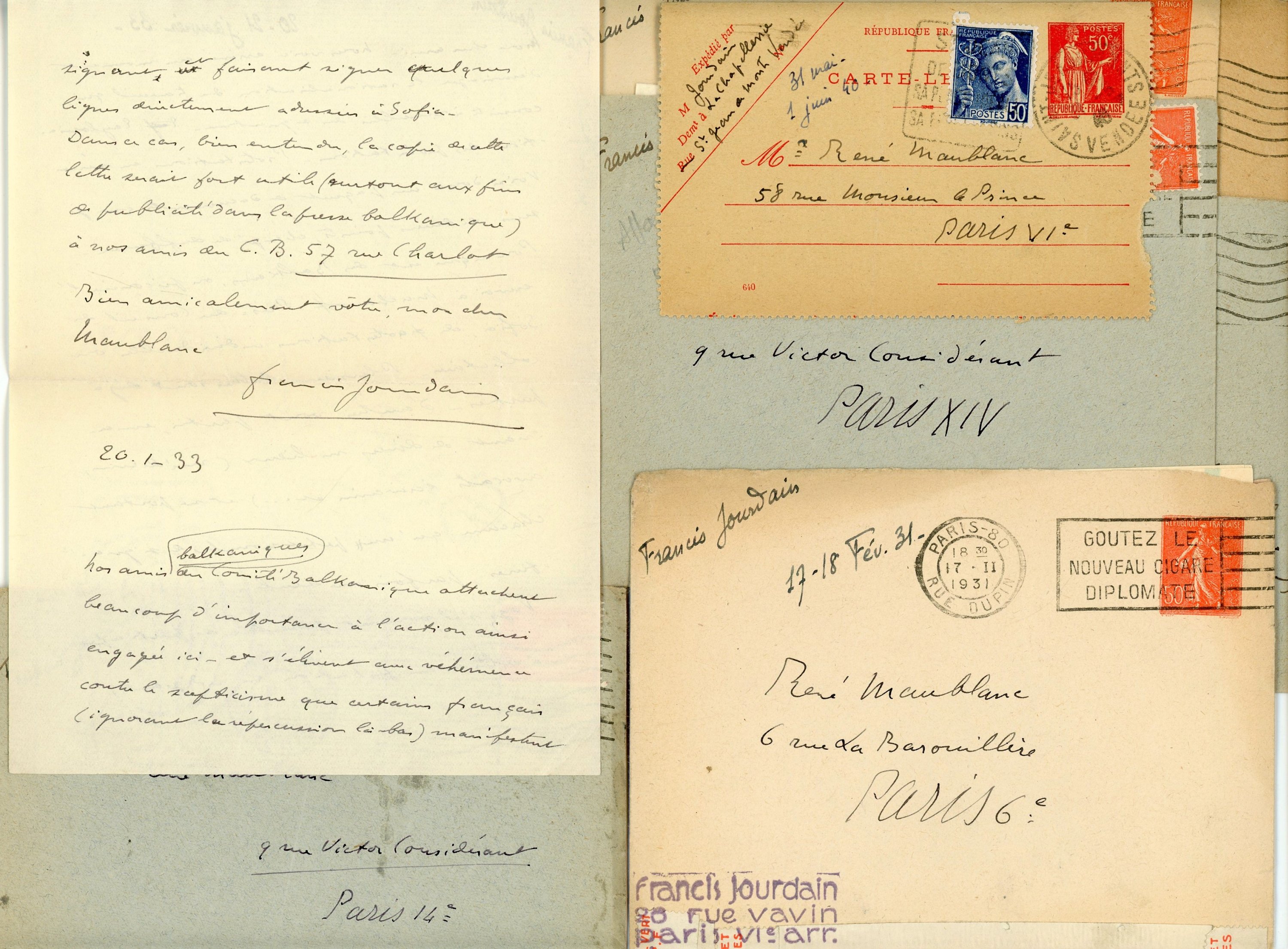 - Lot denv. 155 L.A.S. et L.S., en majorité avec enveloppes, 1929-1958, adressées à René Maublanc ; la correspondance davant-guerre témoigne des différentes luttes pacifistes menées par lartiste (soutien aux intellectuels de Roumanie (1930), comité de défense à louvrier polonais Olzanski (1932), comité balkanique (1933), comité damnistie et de défense des Indochinois et peuples colonisés (1933), comité daide aux victimes du fascisme hitlérien, etc), tandis que celle daprès-guerre aborde essentiellement sa collaboration au sein de la revue La Pensée, dont notamment des longs passages sur sa réaction contre la censure établie au sein du comité de lecture, sur sa vision de lart et son opposition par exemple à la reconnaissance du peintre communiste André Fougeron, ses rapports conflictuels avec Georges Cogniot, son engagement au parti communiste, un poème écrit en villégiature dans le Perche en 1949 ;