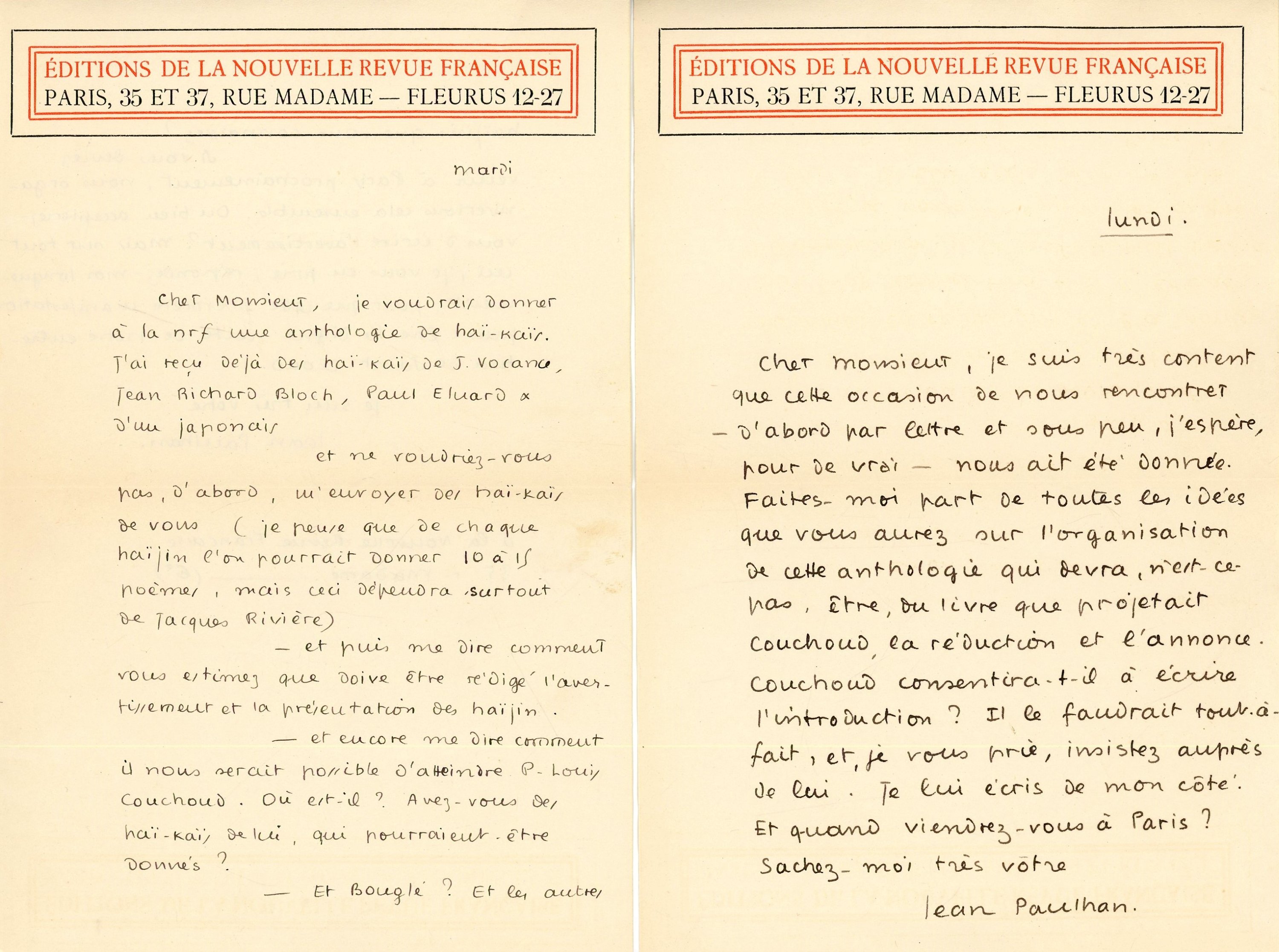 - 17 L.A.S. et L.S., entête Editions de la Nouvelle Revue Française, 1920-1938, Jean PAULHAN (1884-1968), secrétaire de Jacques Rivière, puis rédacteur en chef de 1925 à 1935, et directeur après 1935 ;