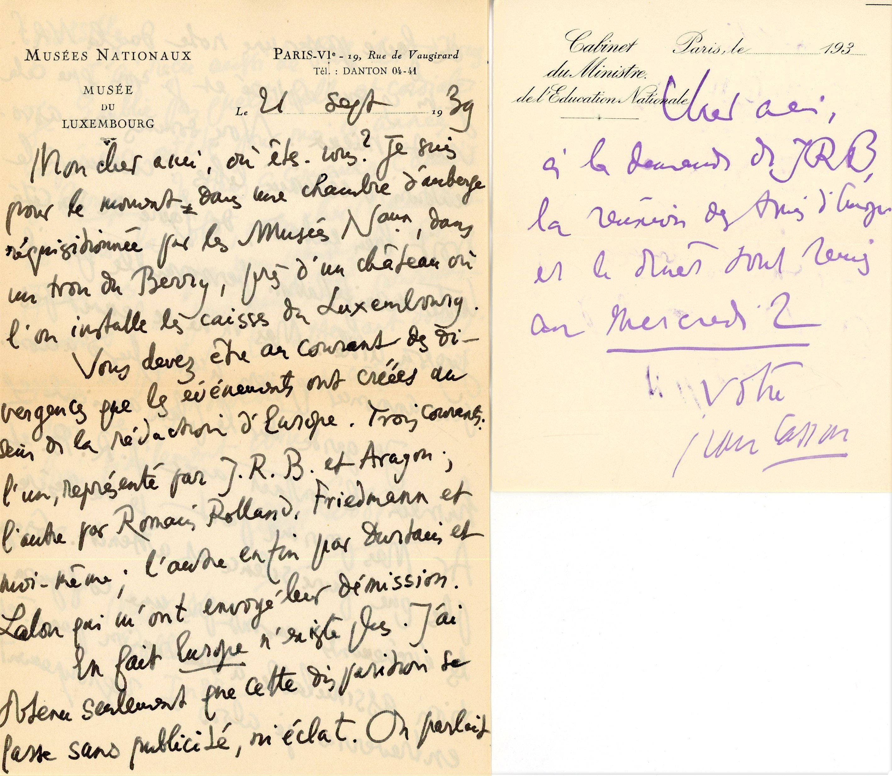 - 17 L.A.S. et L.S., 1929-1939, Jean CASSOU (1897-1988), conseiller littéraire des Editions Jacques-Olivier Fourcade de 1929 à 1931, directeur de la revue Europe de 1936 à 1939, membre du cabinet de Jean Zay ministre de l’Education nationale en 1936, coordonne dès 1939 l’évacuation des oeuvres d’art du patrimoine national, dont entête Editions J.O. Fourcade ;