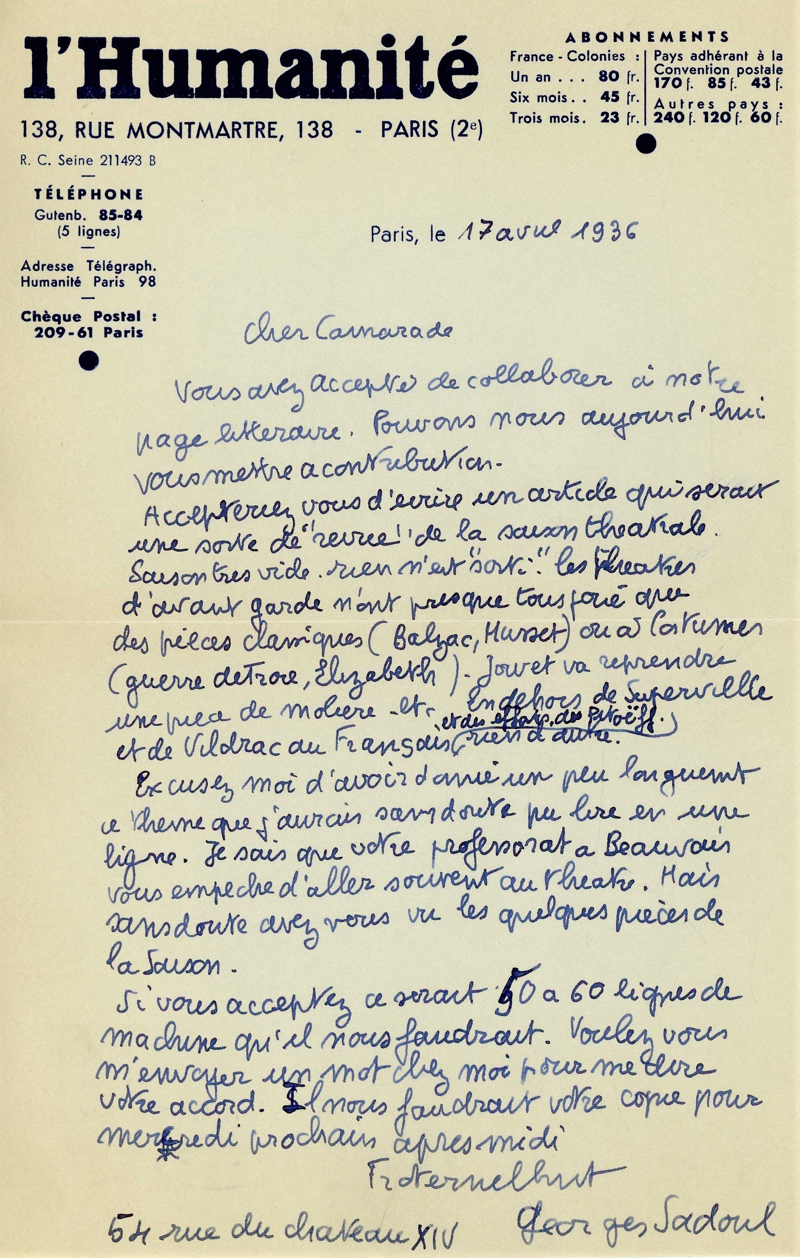 - 14 L.A.S. et L.S., à entêtes du journal L’Humanité et Mon Camarade, Georges SADOUL (1904-1967), chroniqueur dans la page culturelle de L’Humanité et directeur de publication de la revue de la jeunesse Mon Camarade ;