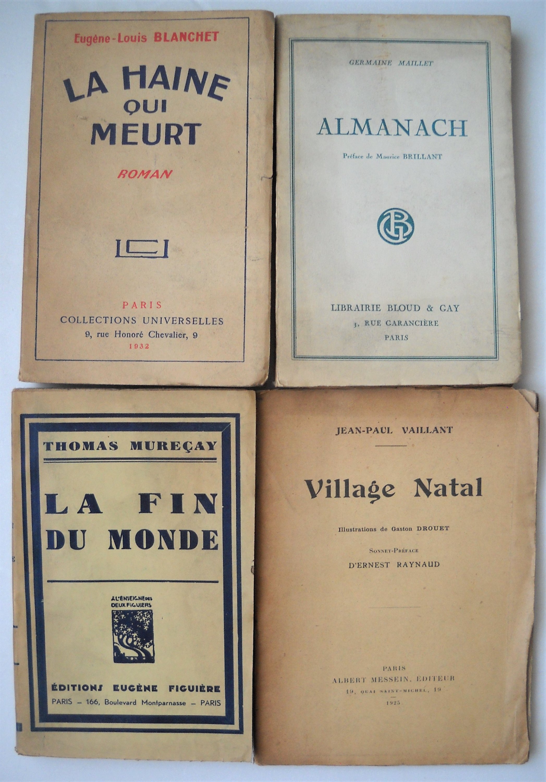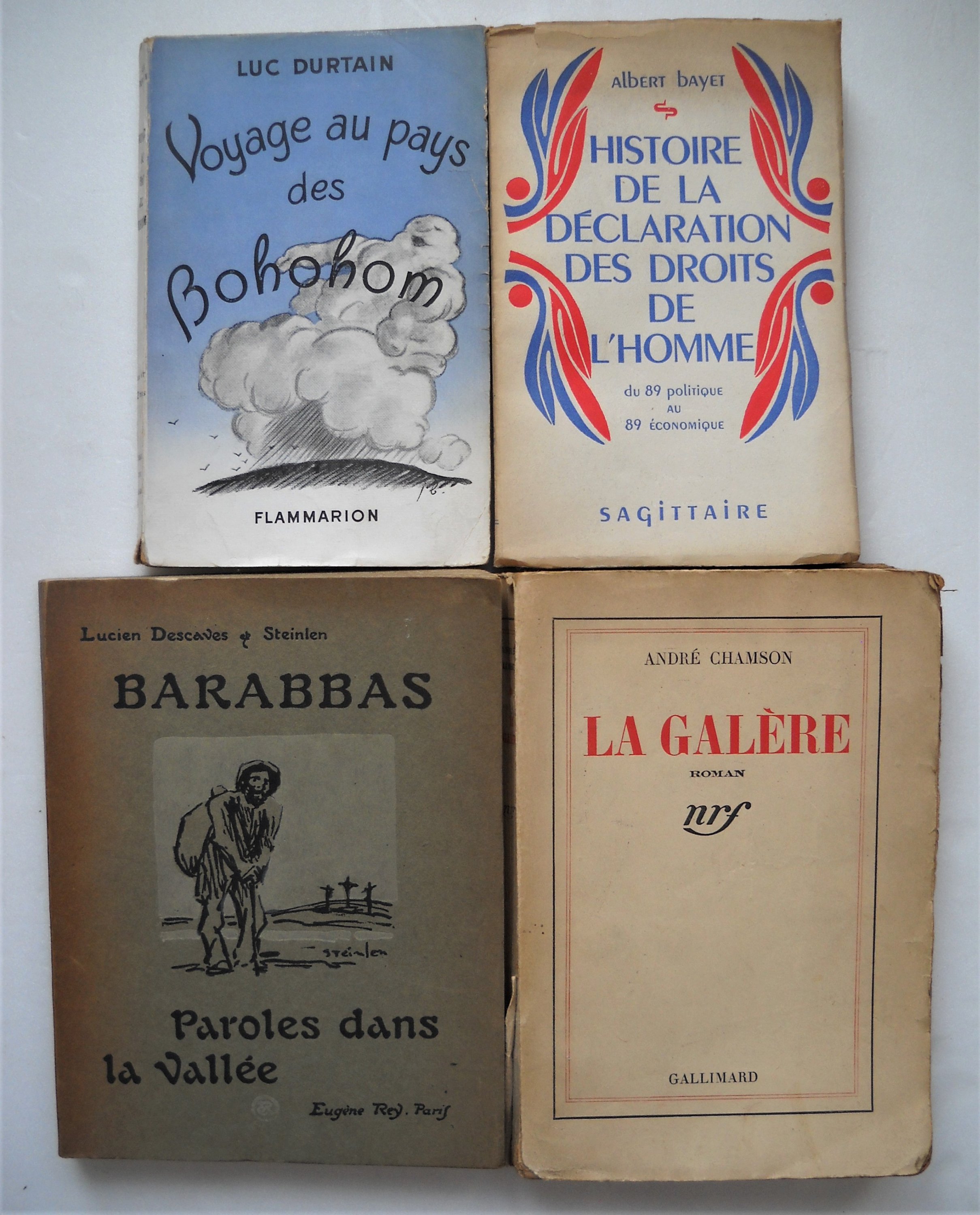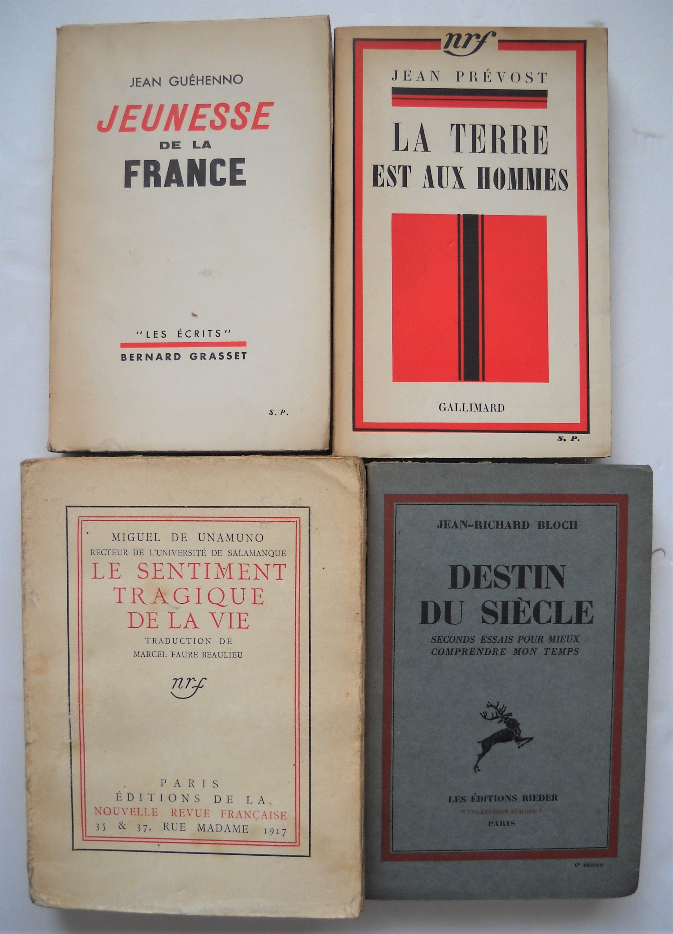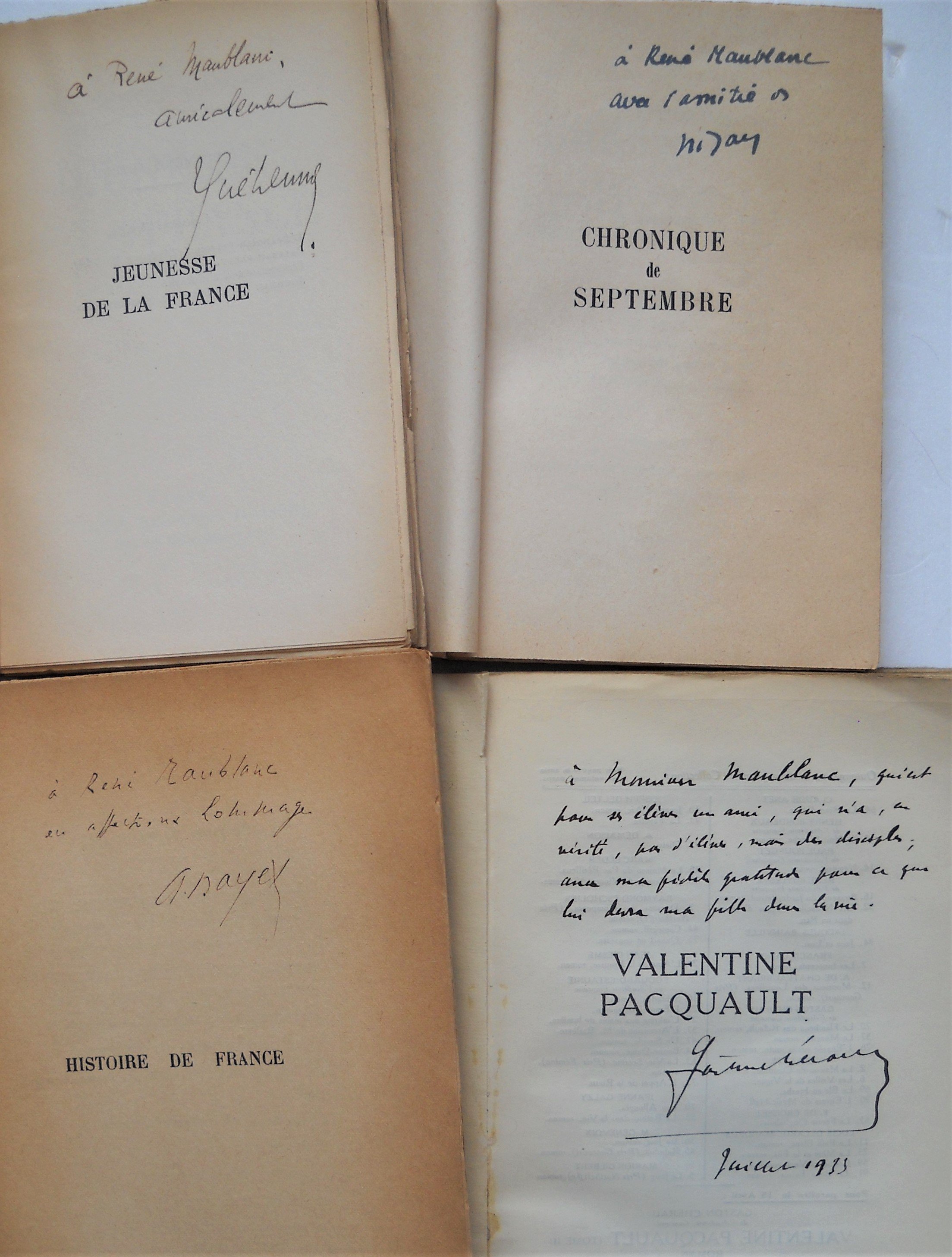 André NEPVEU, L’étape nécessaire, E. Sansot & Cie, 1907, br. in-12, 319 pages. – Lucien DESCAVES, Barabbas, paroles dans la vallée, dessins de Steilen, Eugène Rey édit., 1914, br. in-8, 255 pages. – Miguel de UNAMUNO, Le sentiment tragique de la vie, Editions N.R.F., 1917, br. in-8, 387 pages. – Henri BARBUSSE, Clarté, Ernest Flammarion, 1919, br. in-12, 290 pages. – James George FRAZER, Heures de Loisir, essais littéraires, avec préface d’Anatole France, Librairie Orientaliste Paul Geuthner, Paris, 1922, br. in-12, 222 pages. – Raymond GEIGER : Histoires Juives, N.R.F., Paris, Gallimard, 1923, br. in-12, 215 pages. ; Nouvelles histoires Juives, N.R.F., Paris, Gallimard, 1925, br. in-12, 222 pages. – Pierre BOST : L’imbécile, comédie en quatre actes, Gallimard N.R.F., 1923, br. in-16, 56 pages. Envoi autographe signé. ; Homicide par imprudence, Société des Editions Fast, 1925, br. in-8, 241 pages. Envoi autographe signé et daté. ; Prétextat, Gallimard, N.R.F., 1925, br. in-8, 221 pages. Ex. S.P. Envoi autographe ; Crise de croissance, Gallimard, N.R.F., 1926, br. in-8, 219 pages. Ex. S.P. ; Homicide par imprudence, Gallimard, N.R.F., 1936, br. in-8, 216 pages. Ex. S.P. Envoi autographe signé ; A la porte, au Sans Pareil, Le conciliabule des Trente, dirigé par Louis Martin-Chauffier, 1927, br. in-8, 121 pages. Envoi autographe signé. – André GIDE, Corydon – Quatre dialogues socratiques, N.R.F., 1924, br. in-12, 183 pages (en l’état) – Paul VALÉRY, Variété, N.R.F., Gallimard, 1924, br. in-12, 268 pages. – Edouard DUJARDIN, Théâtre II (les Argonautes), Mercure de France, 1924, br. in-12, 308 pages. Envoi autographe signé. – Rabindranath TAGORE, Mashi, Gallimard N.R.F., 1925, br. in-8, 218 pages. Ex. S.P. – Jean PREVOST : Tentative de solitude, avec un portrait de l’auteur par Henri Julié, N.R.F., 1925, br. in-8, 92 pages. Ex. sur vélin simili cuves des papeteries Navarre. Envoi autographe signé « A René Maublanc, en signe (malencontreux) de ma vive amitié, ce canular pénible » ; Plaisirs des sports – Essais sur le corps humain, N.R.F., Gallimard, 1925, br. in-12, 218 pages. Ex. S.P. ; La Terre est aux Hommes, N.R.F., Gallimard, 1936, br. in-12, 219 pages. Ex. S.P. Envoi autographe signé. – Théâtre complet de Eugène Labiche avec une préface par Emile Augier, Calmann-Lévy, 1927, br. in-12, 468 pages. – Léon TREICH : Histoires Gauloises, collection d’Anas, N.R.F., Gallimard, 1925, br. in-12, 189 pages. ; L’esprit de Rivarol, Coll. D’Anas, Gallimard N.R.F., 1926, br. in-12, 154 pages. – James JOYCE, Ulysse, traduit de l’anglais par Auguste MOREL assisté par Stuart GILBERT, traduction revue par Valery LARBAUD avec la collaboration de l’auteur, La Maison du Livre, Paris, 1929, br. in-4, 870 pages. Edition originale, ex. d’auteur n°159 sur alfa vergé. [La participation active de Joyce à l'édition française de son livre révolutionnaire, symbole et monument du modernisme naissant, est tout à fait dans l'ordre des choses puisque l'originale en anglais avait également été publiée à Paris en 1921 par Sylvia Beach, de Shakespeare & Cie - confrère, voisine et compagne d'Adrienne Monnier, à qui on doit la présente édition. Joyce avait alors déjà quitté l'Irlande pour le continent. Son livre fut d'ailleurs interdit dans son pays natal, ainsi qu'aux États-Unis.] – Jean-Paul VAILLANT, Village natal, Albert Meissen édit., 1925, br. in-8, 84 pages. Envoi autographe signé et daté. – Germaine MAILLET, Almanach, Librairie Bloud & Gay, 1926, br. in-8, 152 pages. Envoi autographe signé. – AUREL, La conscience embrasée, Paris, Editions Radot, 1927, br. in-12, 280 pages. – Robert-Hugh BENSON, traduit de l’anglais par Elisabeth Maurice DENIS, Dans le van du vanneur, Editions Saint Michel, 1929, br. in-8, 250 pages. Envoi autographe signé. – LUGNÉ-POE, La Parade – Le sot du tremplin, N.R.F., Gallimard, 1930, br. in-12, 278 pages. Ex. S.P. Envoi autographe signé. – Gaston CHEREAU, Valentine Pacquault, 2 tomes, ill. en couleurs de Pierre Lissac. Le livre Moderne illustré, J. Ferenczi et fils édit., 1930, br. in-8, 206 et 189 pages. Ex. sur papier Alfa outhevin chalandre. Envoi autographe signé et daté « à Monsieur Maublanc pour ses élèves un ami, qui n’a, en vérité, pas d’élèves, mais des disciples ; avec ma fidèle gratitude pour ce que lui dira ma fille dans la vie » (couv. en l’état)