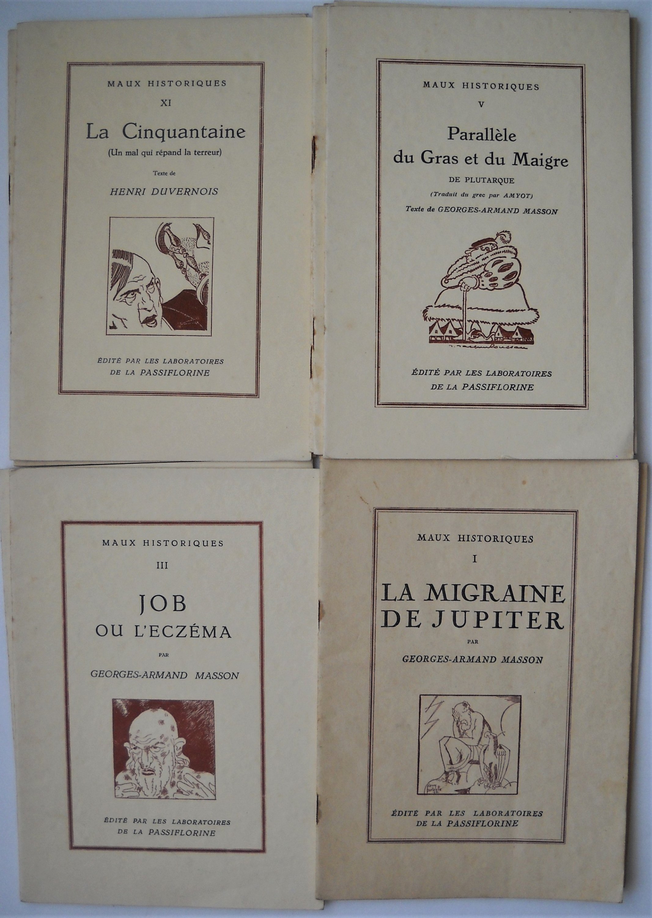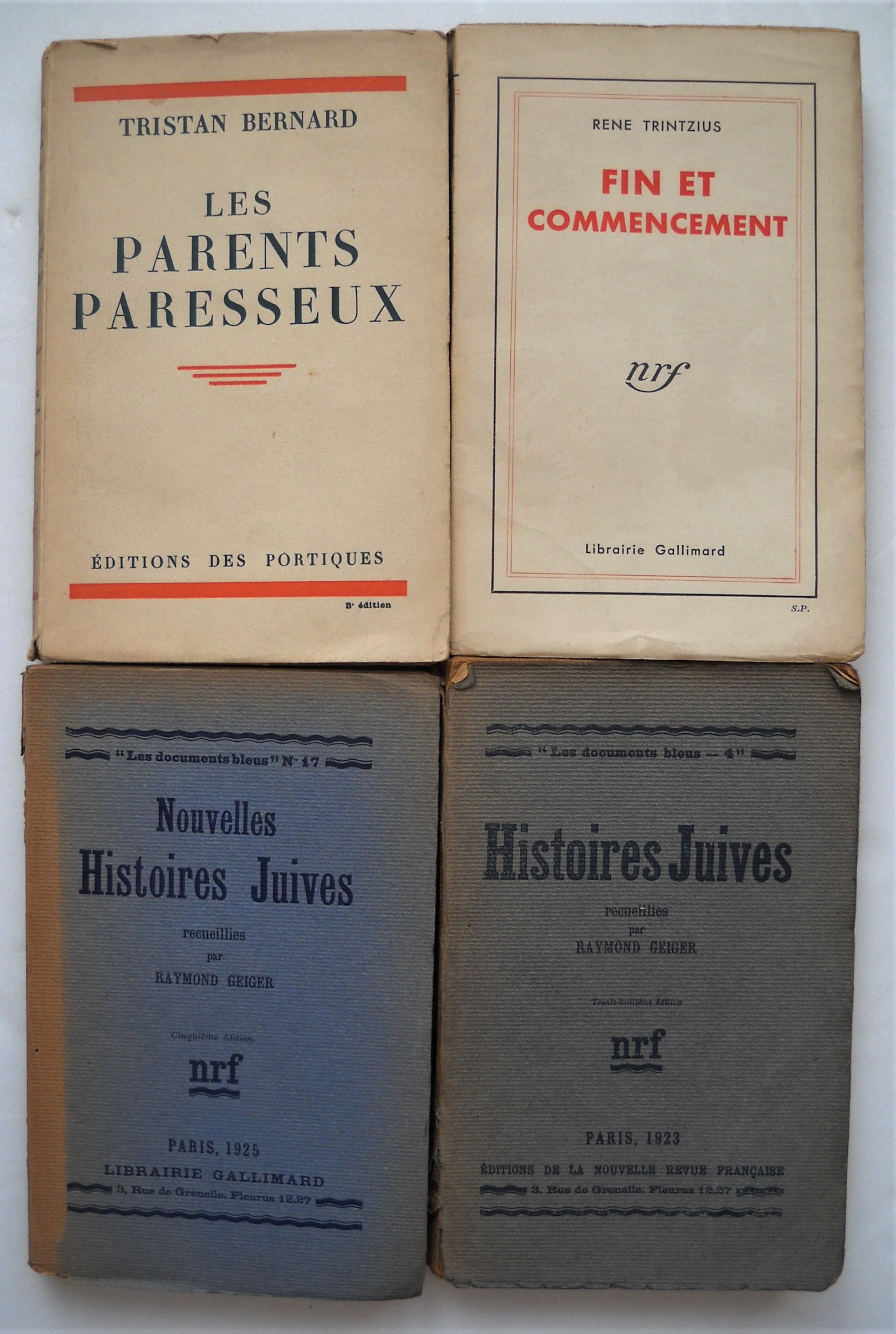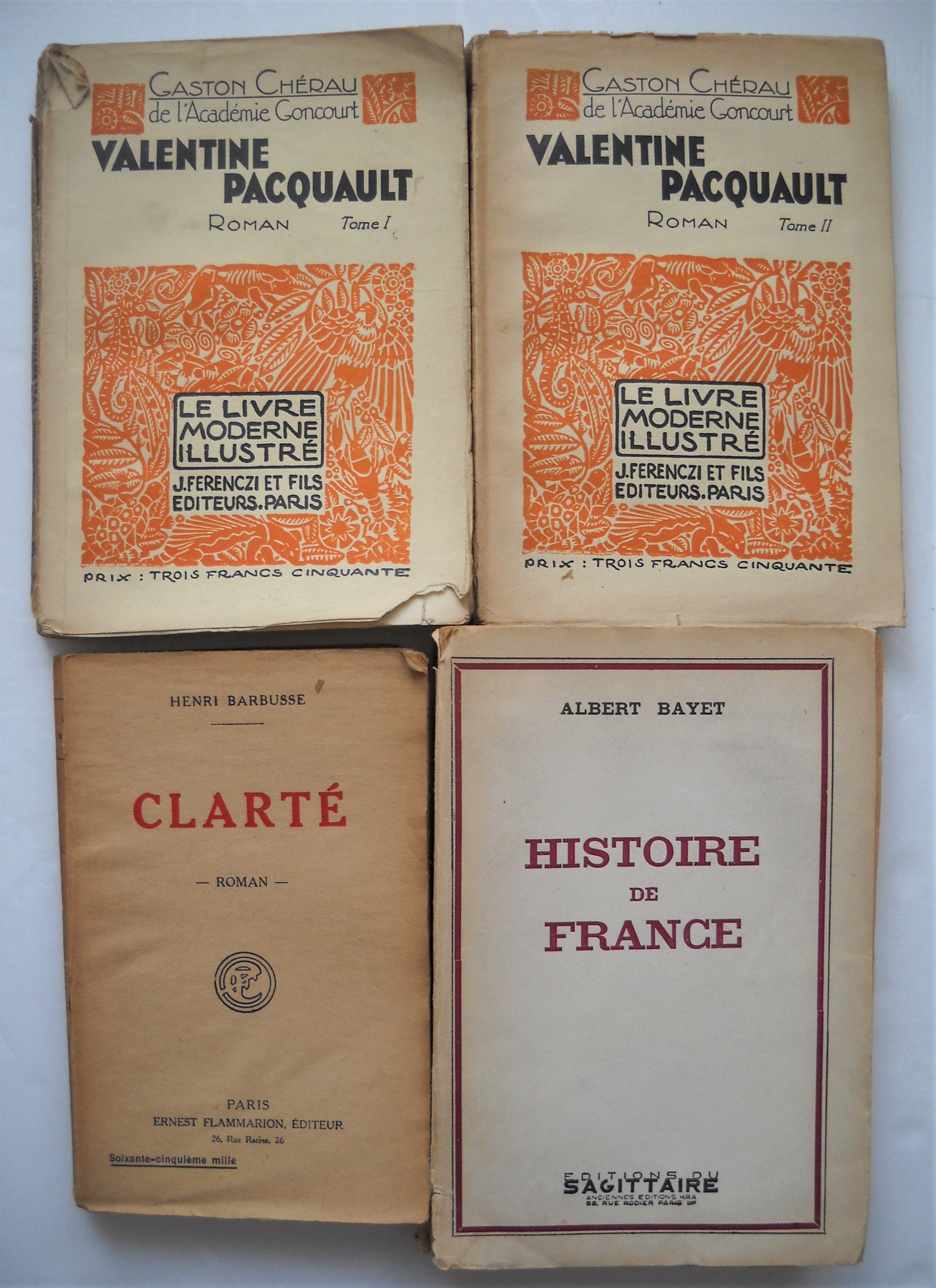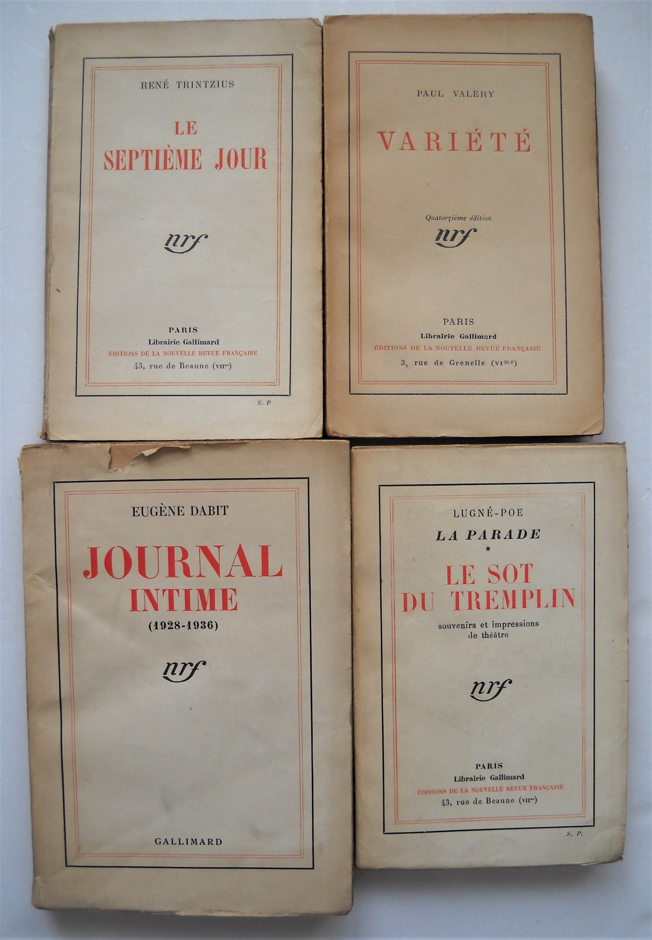 André NEPVEU, L’étape nécessaire, E. Sansot & Cie, 1907, br. in-12, 319 pages. – Lucien DESCAVES, Barabbas, paroles dans la vallée, dessins de Steilen, Eugène Rey édit., 1914, br. in-8, 255 pages. – Miguel de UNAMUNO, Le sentiment tragique de la vie, Editions N.R.F., 1917, br. in-8, 387 pages. – Henri BARBUSSE, Clarté, Ernest Flammarion, 1919, br. in-12, 290 pages. – James George FRAZER, Heures de Loisir, essais littéraires, avec préface d’Anatole France, Librairie Orientaliste Paul Geuthner, Paris, 1922, br. in-12, 222 pages. – Raymond GEIGER : Histoires Juives, N.R.F., Paris, Gallimard, 1923, br. in-12, 215 pages. ; Nouvelles histoires Juives, N.R.F., Paris, Gallimard, 1925, br. in-12, 222 pages. – Pierre BOST : L’imbécile, comédie en quatre actes, Gallimard N.R.F., 1923, br. in-16, 56 pages. Envoi autographe signé. ; Homicide par imprudence, Société des Editions Fast, 1925, br. in-8, 241 pages. Envoi autographe signé et daté. ; Prétextat, Gallimard, N.R.F., 1925, br. in-8, 221 pages. Ex. S.P. Envoi autographe ; Crise de croissance, Gallimard, N.R.F., 1926, br. in-8, 219 pages. Ex. S.P. ; Homicide par imprudence, Gallimard, N.R.F., 1936, br. in-8, 216 pages. Ex. S.P. Envoi autographe signé ; A la porte, au Sans Pareil, Le conciliabule des Trente, dirigé par Louis Martin-Chauffier, 1927, br. in-8, 121 pages. Envoi autographe signé. – André GIDE, Corydon – Quatre dialogues socratiques, N.R.F., 1924, br. in-12, 183 pages (en l’état) – Paul VALÉRY, Variété, N.R.F., Gallimard, 1924, br. in-12, 268 pages. – Edouard DUJARDIN, Théâtre II (les Argonautes), Mercure de France, 1924, br. in-12, 308 pages. Envoi autographe signé. – Rabindranath TAGORE, Mashi, Gallimard N.R.F., 1925, br. in-8, 218 pages. Ex. S.P. – Jean PREVOST : Tentative de solitude, avec un portrait de l’auteur par Henri Julié, N.R.F., 1925, br. in-8, 92 pages. Ex. sur vélin simili cuves des papeteries Navarre. Envoi autographe signé « A René Maublanc, en signe (malencontreux) de ma vive amitié, ce canular pénible » ; Plaisirs des sports – Essais sur le corps humain, N.R.F., Gallimard, 1925, br. in-12, 218 pages. Ex. S.P. ; La Terre est aux Hommes, N.R.F., Gallimard, 1936, br. in-12, 219 pages. Ex. S.P. Envoi autographe signé. – Théâtre complet de Eugène Labiche avec une préface par Emile Augier, Calmann-Lévy, 1927, br. in-12, 468 pages. – Léon TREICH : Histoires Gauloises, collection d’Anas, N.R.F., Gallimard, 1925, br. in-12, 189 pages. ; L’esprit de Rivarol, Coll. D’Anas, Gallimard N.R.F., 1926, br. in-12, 154 pages. – James JOYCE, Ulysse, traduit de l’anglais par Auguste MOREL assisté par Stuart GILBERT, traduction revue par Valery LARBAUD avec la collaboration de l’auteur, La Maison du Livre, Paris, 1929, br. in-4, 870 pages. Edition originale, ex. d’auteur n°159 sur alfa vergé. [La participation active de Joyce à l'édition française de son livre révolutionnaire, symbole et monument du modernisme naissant, est tout à fait dans l'ordre des choses puisque l'originale en anglais avait également été publiée à Paris en 1921 par Sylvia Beach, de Shakespeare & Cie - confrère, voisine et compagne d'Adrienne Monnier, à qui on doit la présente édition. Joyce avait alors déjà quitté l'Irlande pour le continent. Son livre fut d'ailleurs interdit dans son pays natal, ainsi qu'aux États-Unis.] – Jean-Paul VAILLANT, Village natal, Albert Meissen édit., 1925, br. in-8, 84 pages. Envoi autographe signé et daté. – Germaine MAILLET, Almanach, Librairie Bloud & Gay, 1926, br. in-8, 152 pages. Envoi autographe signé. – AUREL, La conscience embrasée, Paris, Editions Radot, 1927, br. in-12, 280 pages. – Robert-Hugh BENSON, traduit de l’anglais par Elisabeth Maurice DENIS, Dans le van du vanneur, Editions Saint Michel, 1929, br. in-8, 250 pages. Envoi autographe signé. – LUGNÉ-POE, La Parade – Le sot du tremplin, N.R.F., Gallimard, 1930, br. in-12, 278 pages. Ex. S.P. Envoi autographe signé. – Gaston CHEREAU, Valentine Pacquault, 2 tomes, ill. en couleurs de Pierre Lissac. Le livre Moderne illustré, J. Ferenczi et fils édit., 1930, br. in-8, 206 et 189 pages. Ex. sur papier Alfa outhevin chalandre. Envoi autographe signé et daté « à Monsieur Maublanc pour ses élèves un ami, qui n’a, en vérité, pas d’élèves, mais des disciples ; avec ma fidèle gratitude pour ce que lui dira ma fille dans la vie » (couv. en l’état)