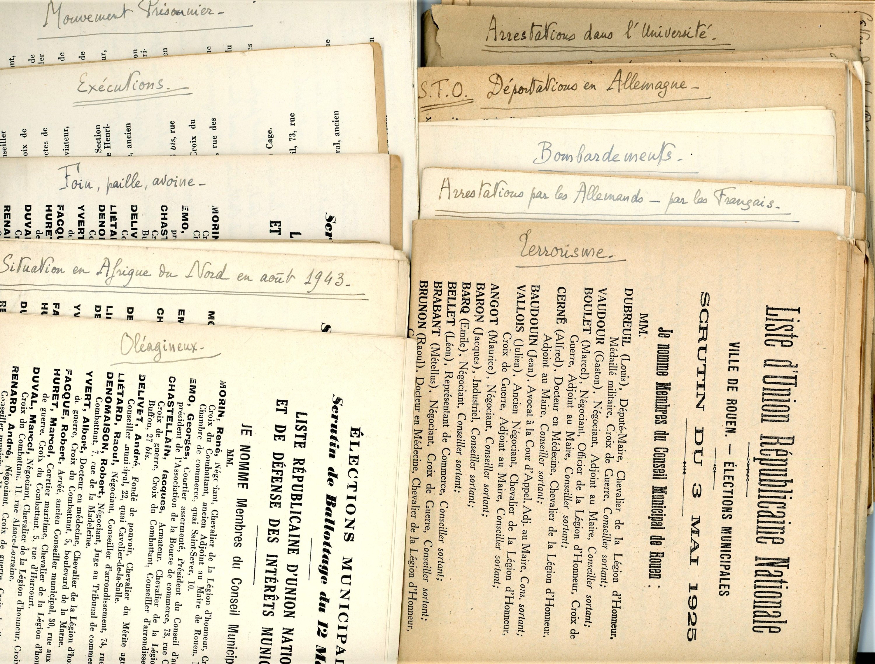 - + de 400 pages env. de notes manuscrites de R.M. sur des bouts de papier de fortune, 1943-1944 ; informations extraites des rapports des préfectures interceptés par la Résistance et classées par thèmes : opinion publique, police, propagande, terrorisme, arrestations par les Allemands et les Français, bombardements, arrestations dans luniversité, STO, etc ;