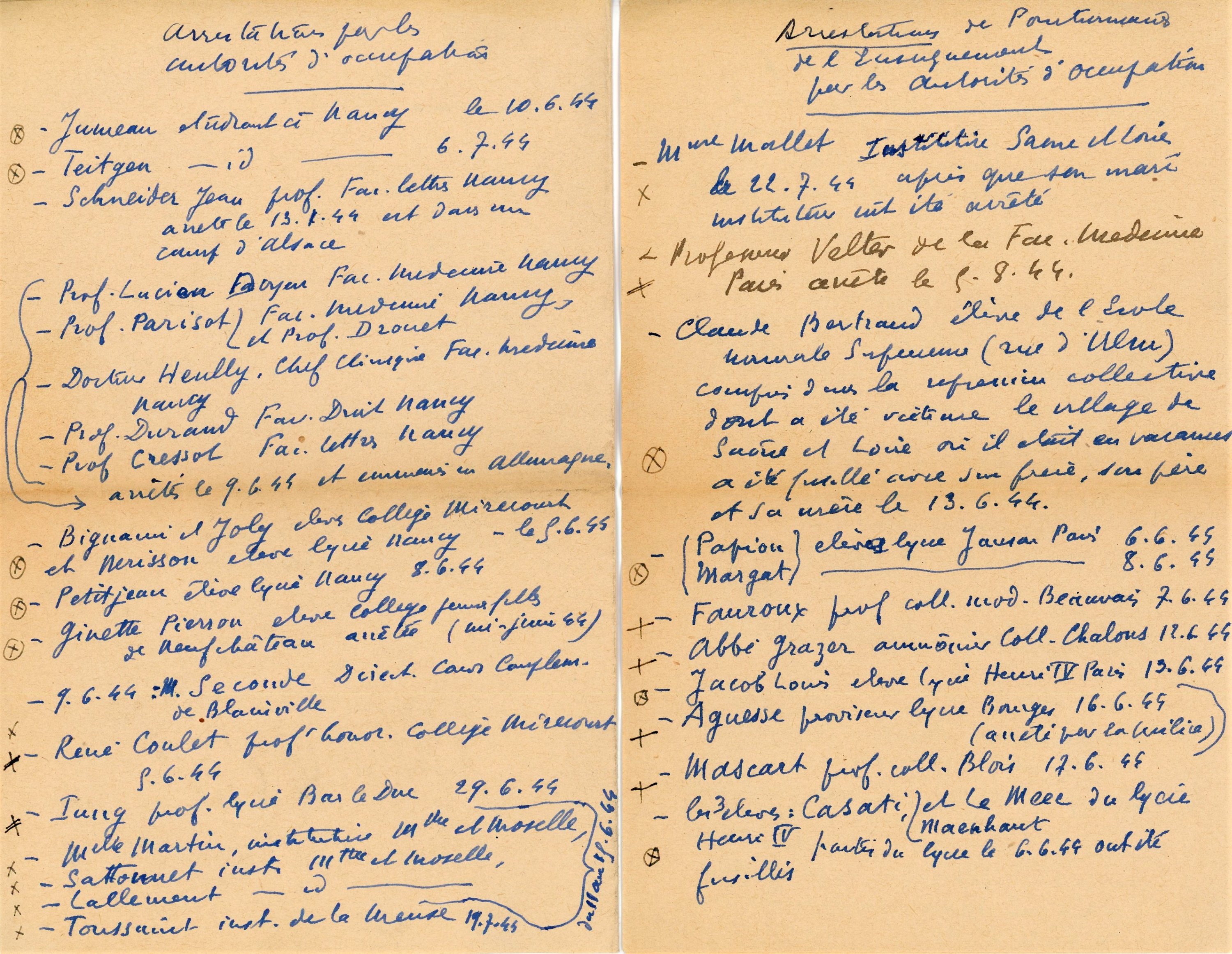- Liste manuscrite de noms denseignants et détudiants arrêtés ou fusillés par les autorités doccupation, entre juin et août 1944 ;