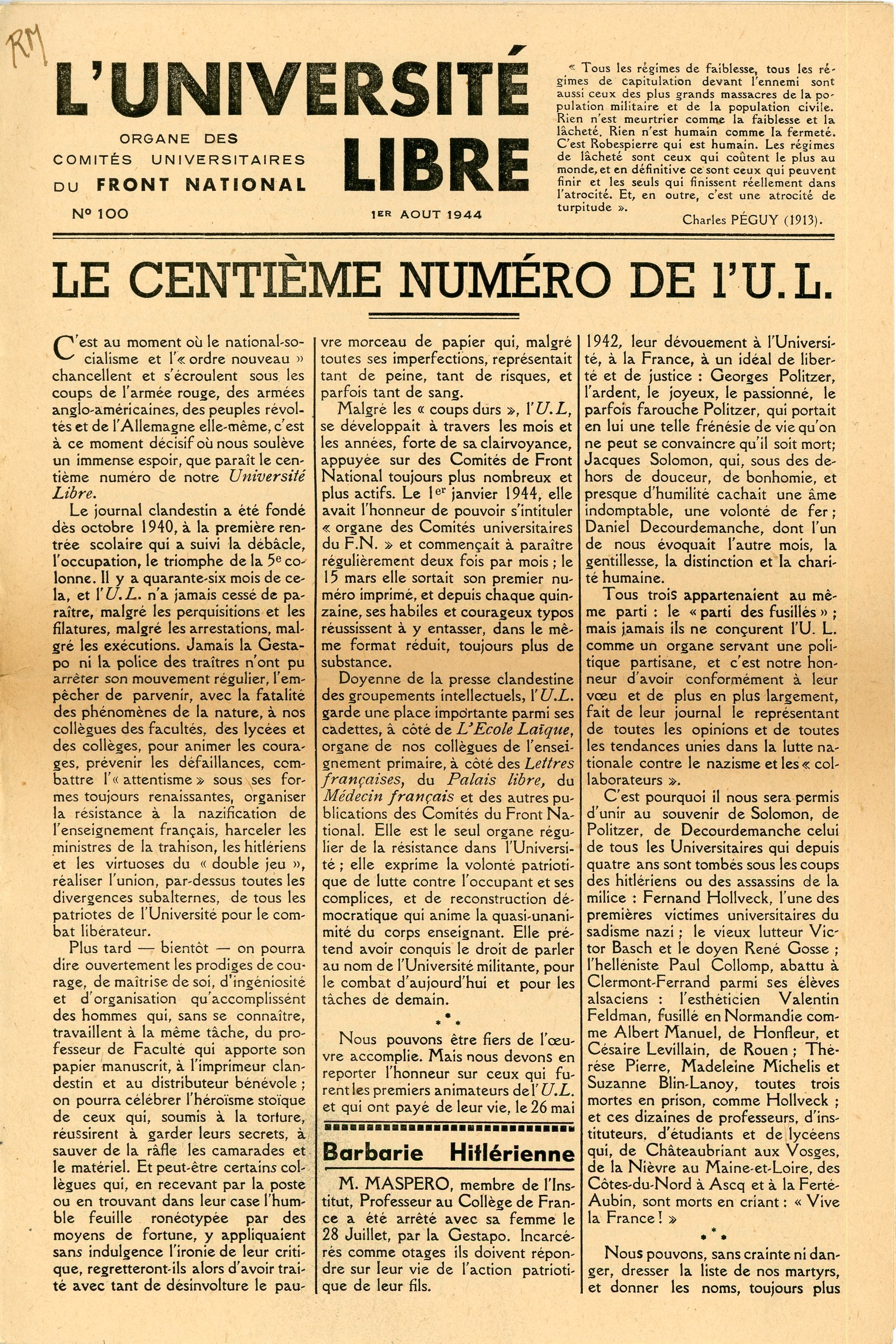 LUNIVERSITE LIBRE, ORGANE DES COMITES UNIVERSITAIRES DU FRONT NATIONAL DE LIBERATION, 1942-1947