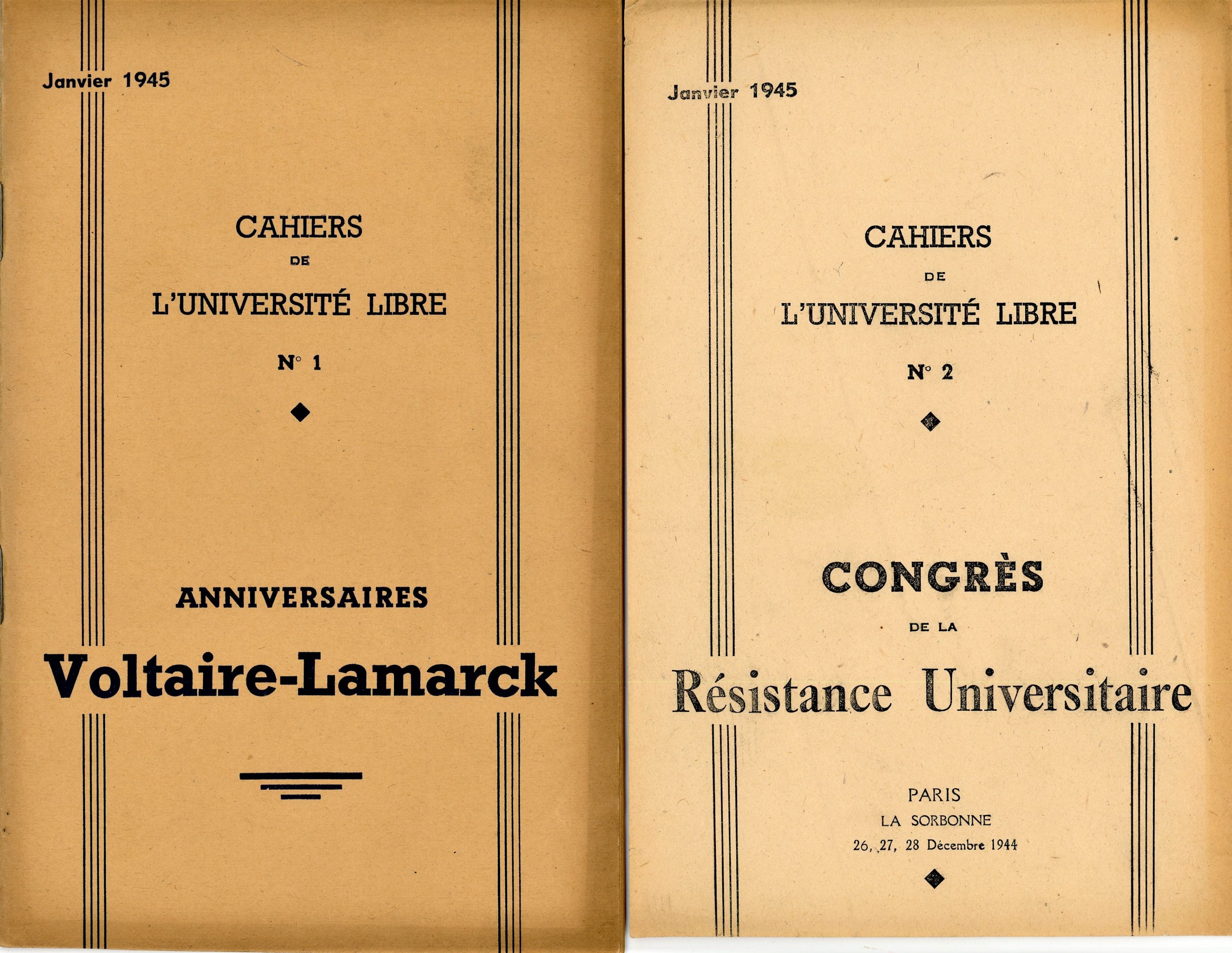- n°1 et 2 Cahiers de lUniversité Libre, janvier 1945, « Anniversaires Voltaire-Lamarck » et « Congrès de la Résistance Universitaire à la Sorbonne, 26 au 28 décembre 1944 » ;
