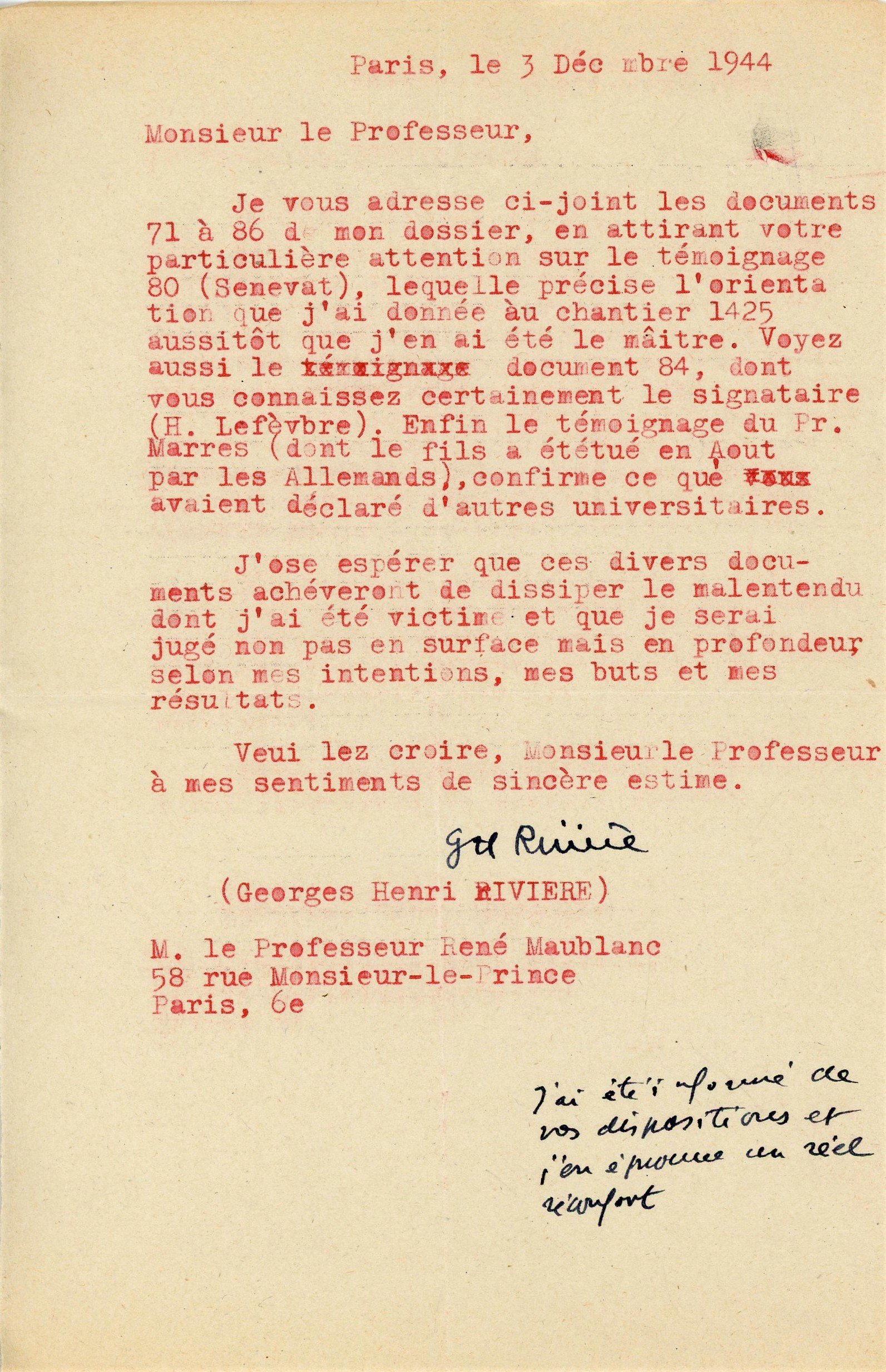 Lot de + de 20 pièces, dont : 2 L.S., 16 nov. et 3 déc. 1944, adressées à René Maublanc ; suspecté de collaboration sous lOccupation, il adresse à R.M. copies de multiples témoignages afin de laider à le réhabiliter, lui reprochant laide reçu par le gouvernement vichyste dans le cadre de ses recherches scientifiques à linstar du chantier 1425 + une vingtaine de pages tapuscrites dattestations et témoignages.