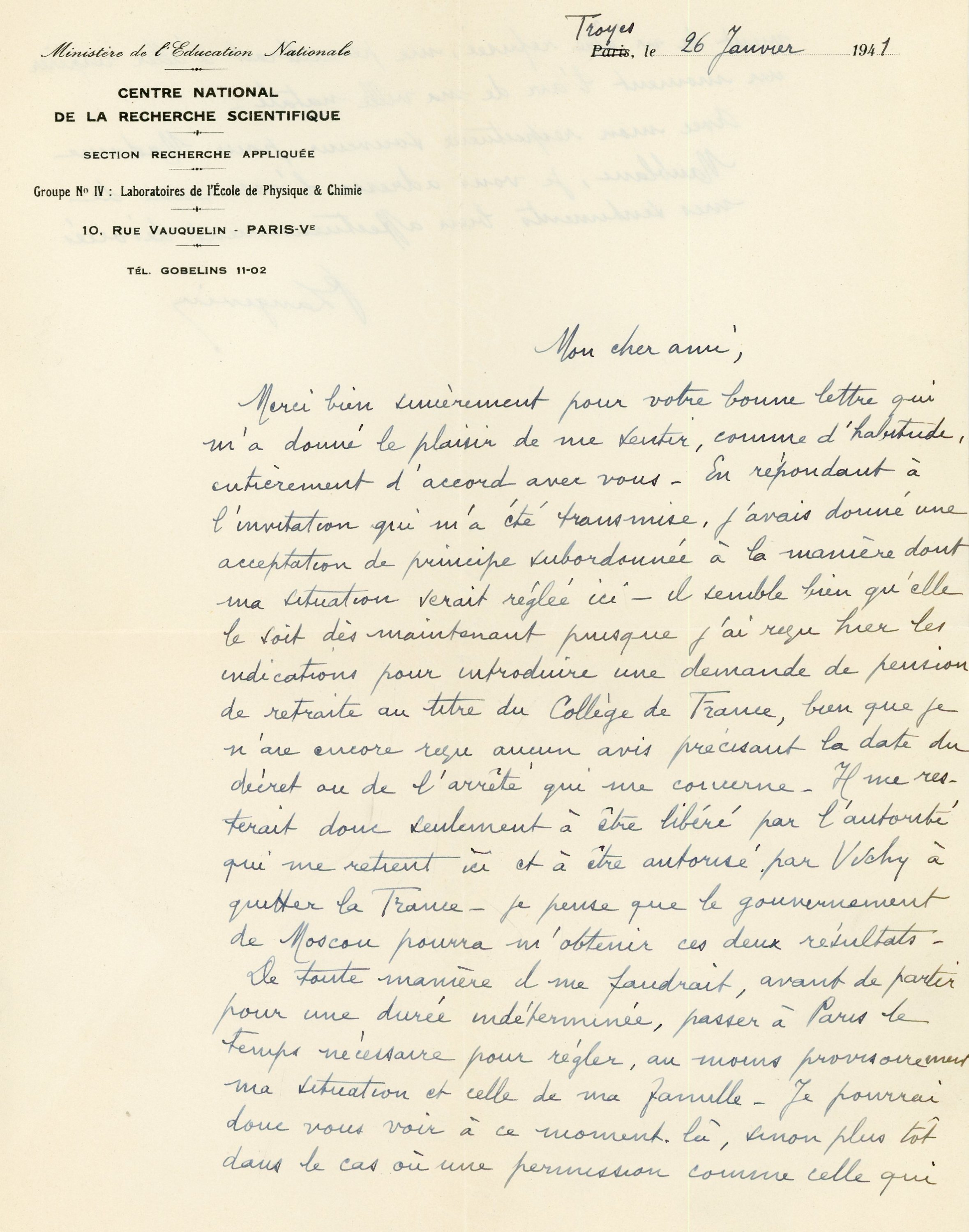 - Discours de M. Langevin au congrès de l’Union national des Intellectuels en juin 1946 ; tapuscrit de 9 pages in-4 ;