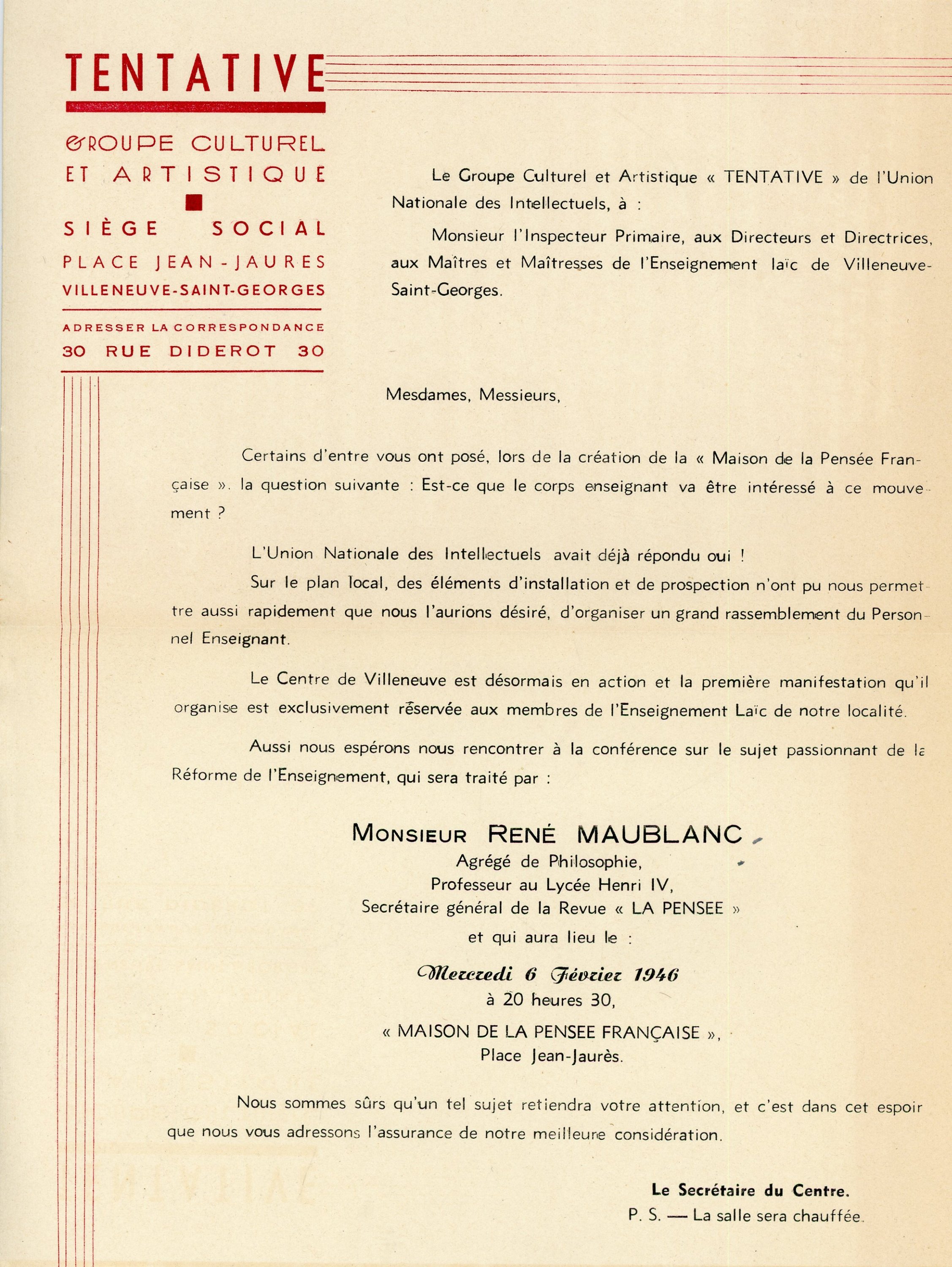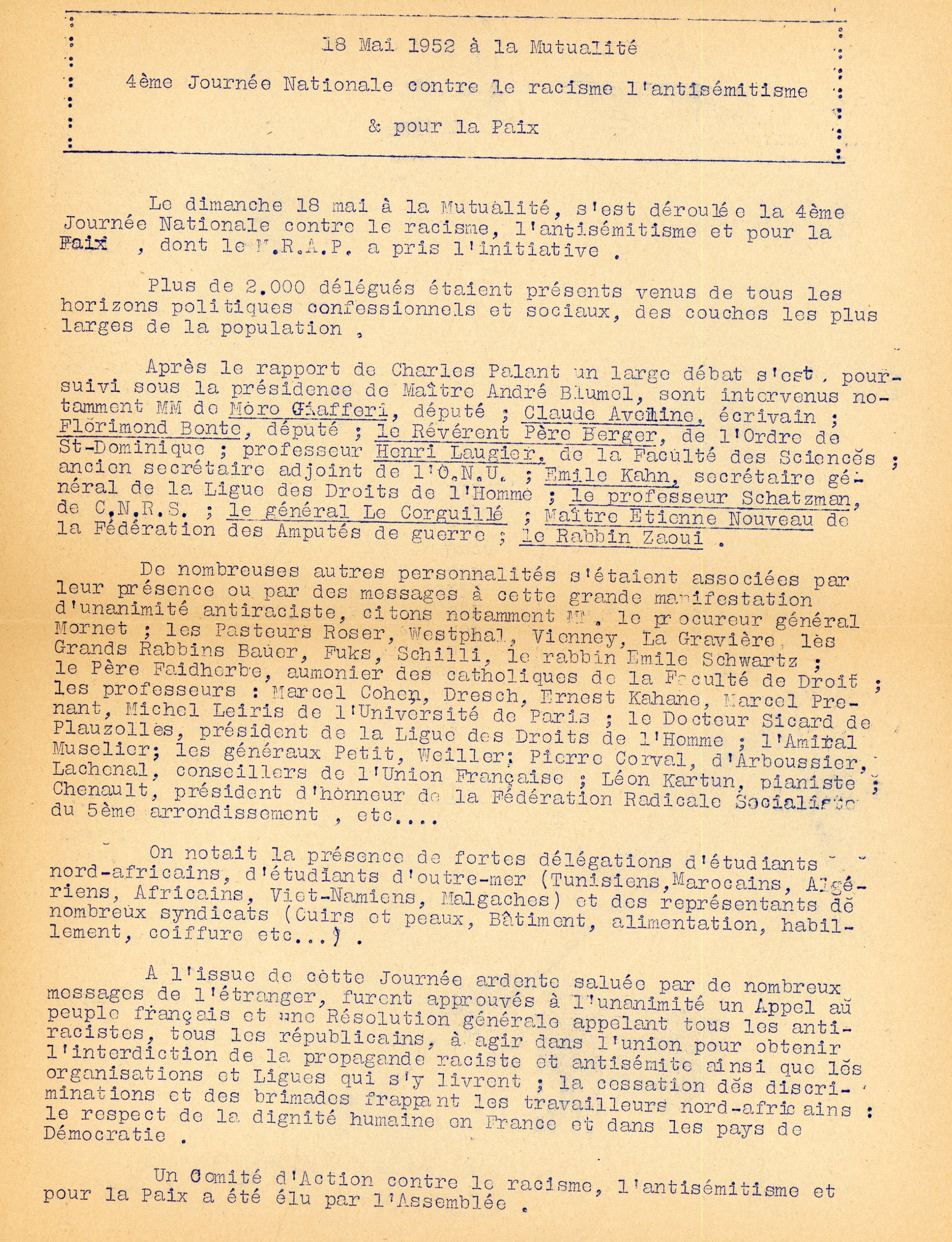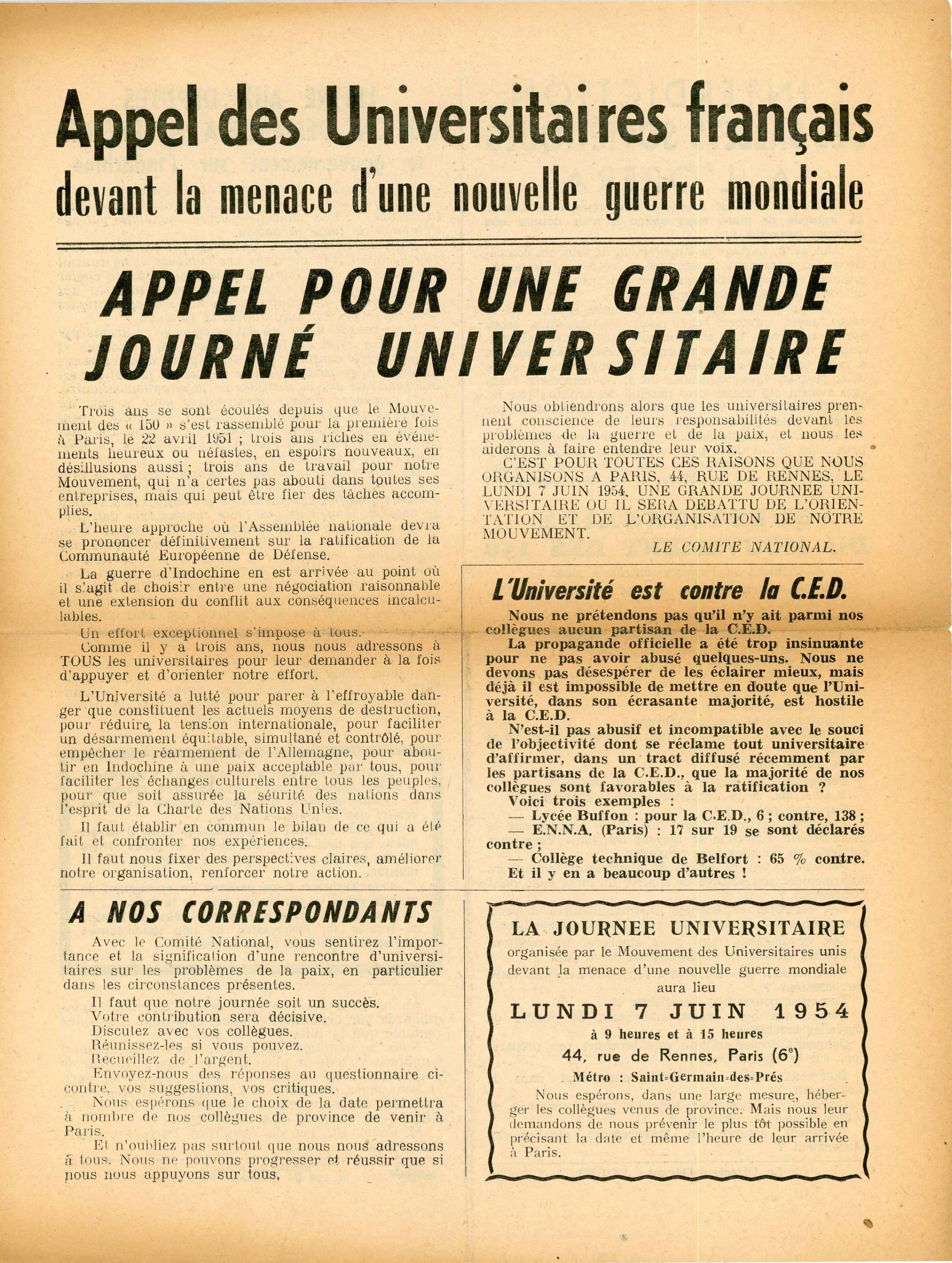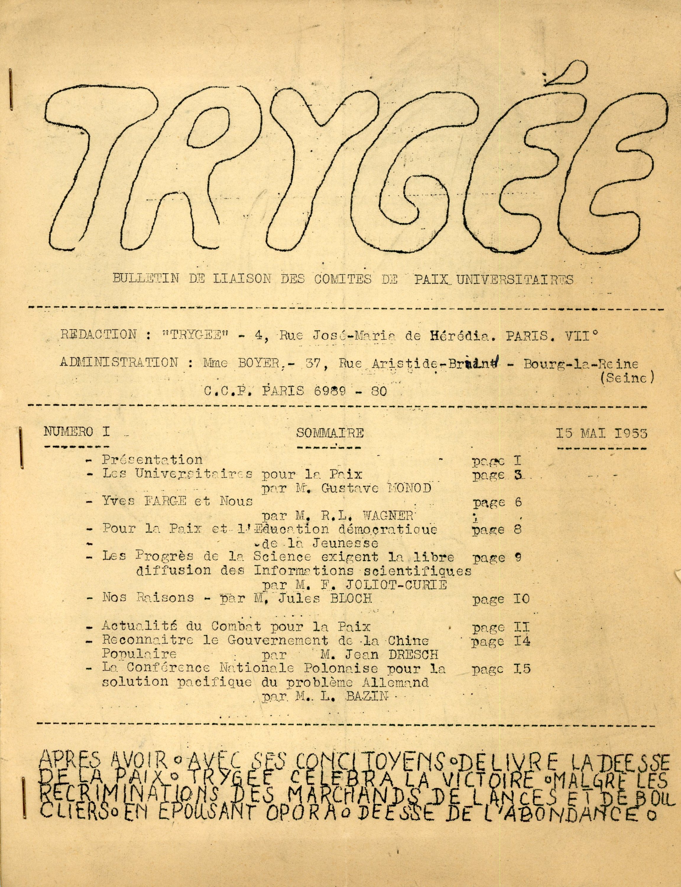 - Réunion de correspondances, tracts, rapports, bulletins d’informations reçus par René Maublanc entre 1944 et 1960, relatifs à ses multiples engagements dans les mouvements de lutte pour la paix, la liberté et anticolonialiste en France, Algérie, Vietnam, Grèce, Yougoslavie, Madagascar, Pologne (« Mouvements contre le racisme, l’antisémitisme et pour la paix », « Conseil national du mouvement de la paix », « Pour la défense du professeur André Bonnard et des libertés d’expression », « Combattants de la paix et de la liberté »…), dans le syndicalisme enseignant et le militantisme universitaire (« Mouvement des 150 » avec appel contre la menace d’une nouvelle guerre mondiale, contre la guerre de Corée ; « Comité universitaire pour la défense des libertés » ; Union française des Intellectuels (UNI), Union française universitaire (UFU), Union rationaliste, L’Ecole Laïque, etc), au sein du Parti communiste français (rapports des commissions internes et notes de lecture de la section idéologique, revues de presse, correspondance de militants et de sections d’arrondissements ; association France-U.R.S.S. ; l’enseignement ouvrier et l’Université Nouvelle ; Peuple et Culture ; arrestation de René Maublanc et de 35 autres manifestants communistes le 23 mai 1952 : pétitions signées par les élèves du lycée Henri IV, lettres de sympathie, coupures de presse ; etc).