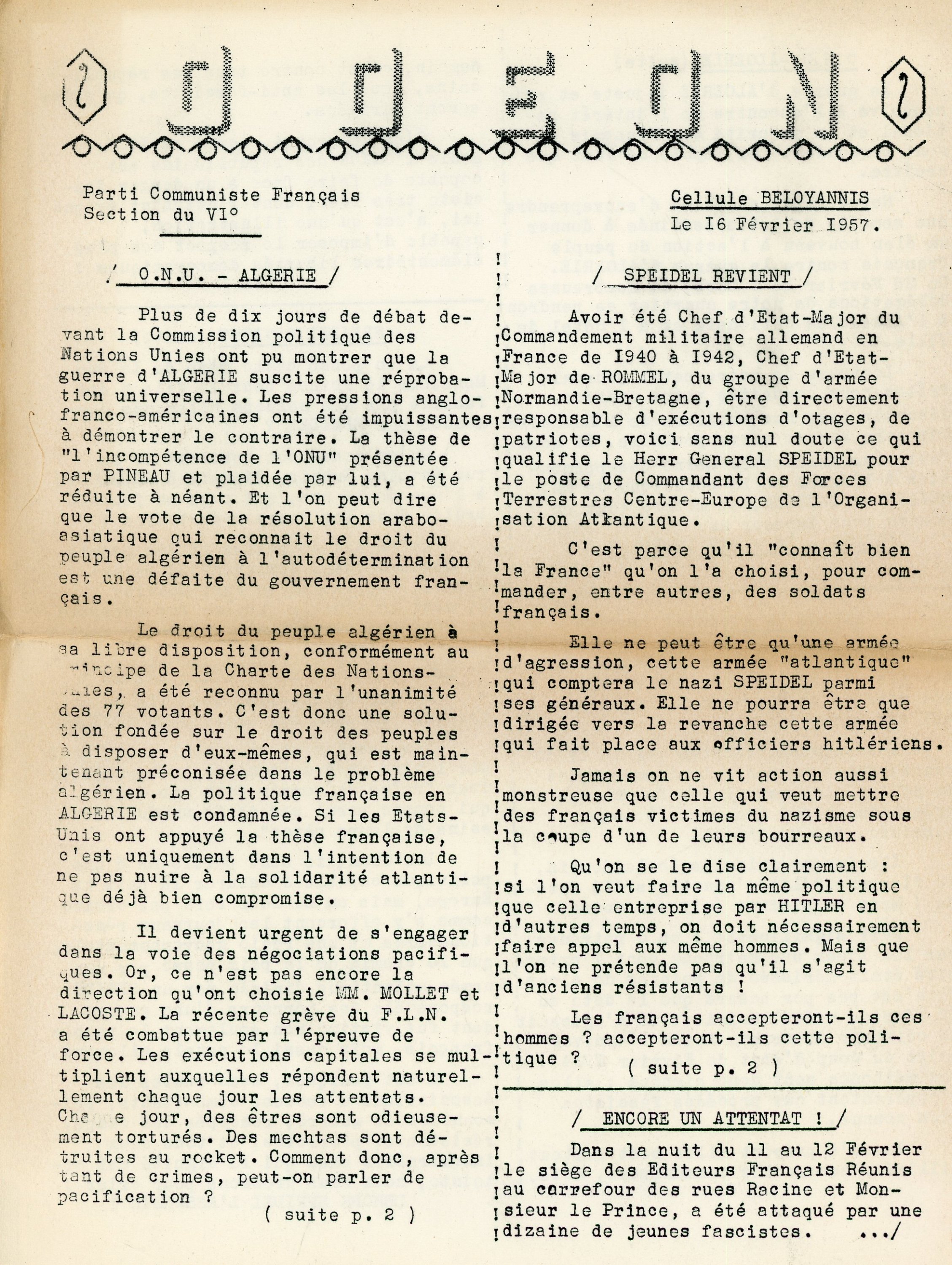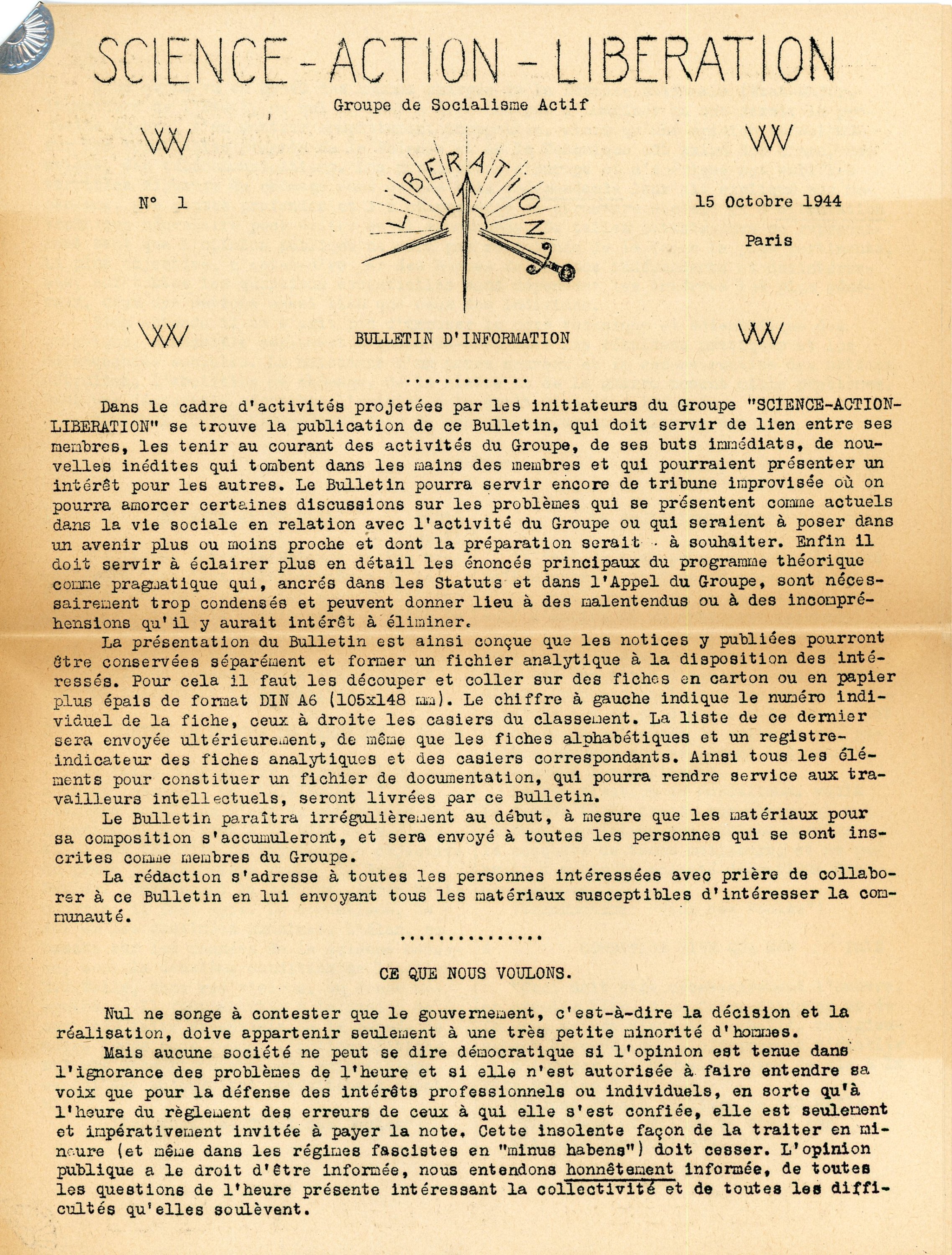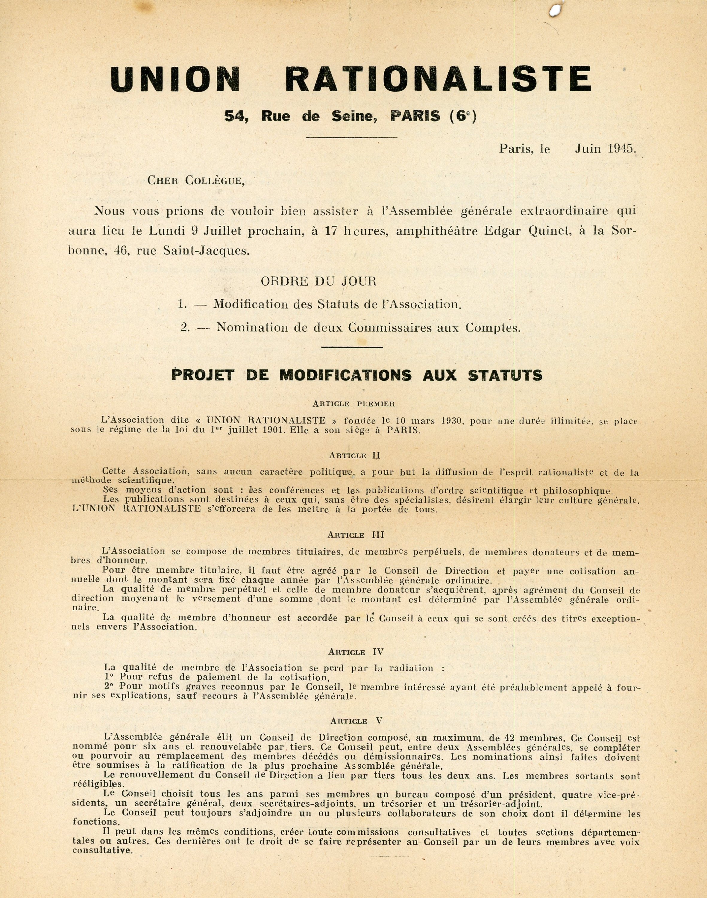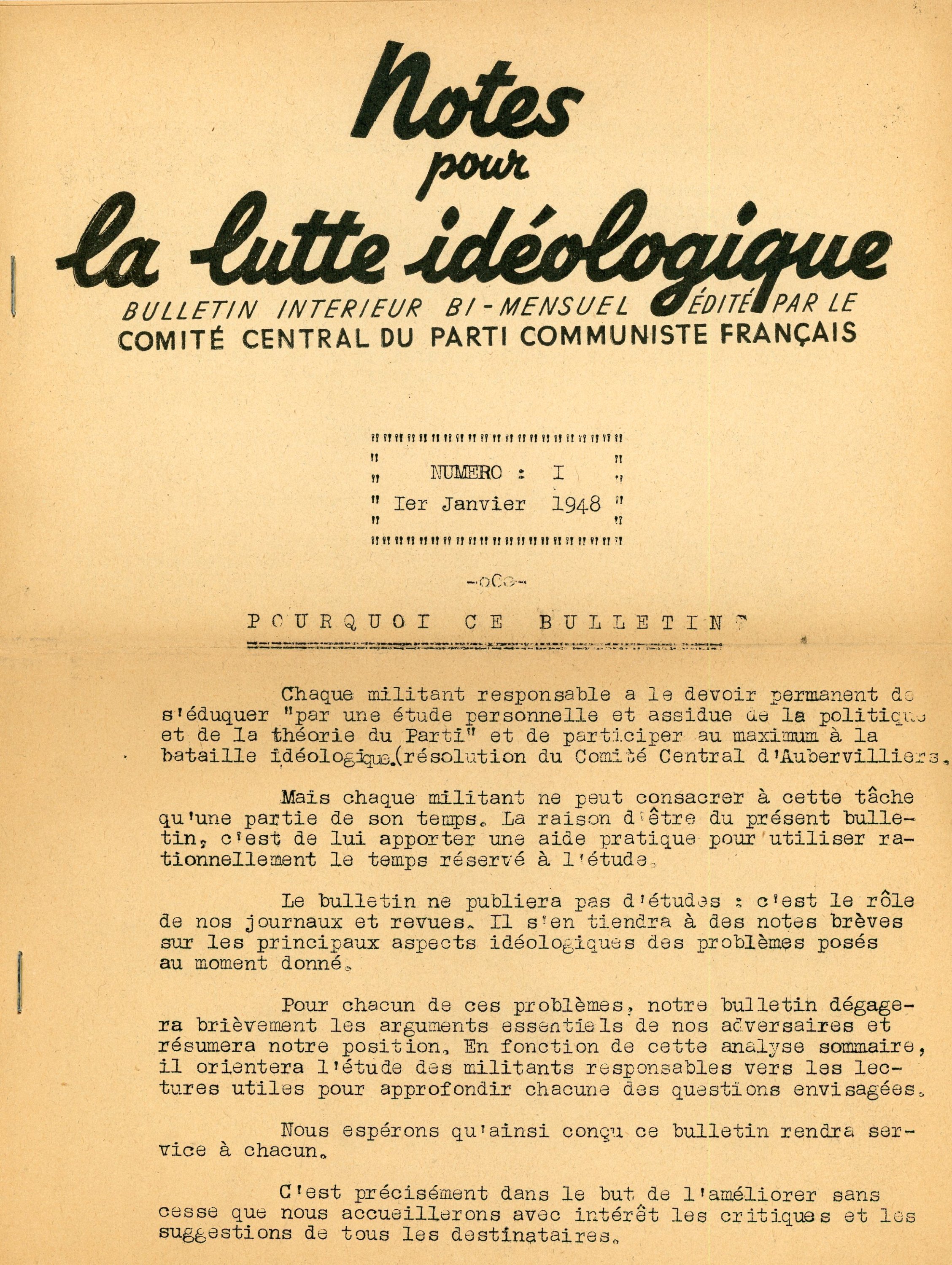 - Réunion de correspondances, tracts, rapports, bulletins d’informations reçus par René Maublanc entre 1944 et 1960, relatifs à ses multiples engagements dans les mouvements de lutte pour la paix, la liberté et anticolonialiste en France, Algérie, Vietnam, Grèce, Yougoslavie, Madagascar, Pologne (« Mouvements contre le racisme, l’antisémitisme et pour la paix », « Conseil national du mouvement de la paix », « Pour la défense du professeur André Bonnard et des libertés d’expression », « Combattants de la paix et de la liberté »…), dans le syndicalisme enseignant et le militantisme universitaire (« Mouvement des 150 » avec appel contre la menace d’une nouvelle guerre mondiale, contre la guerre de Corée ; « Comité universitaire pour la défense des libertés » ; Union française des Intellectuels (UNI), Union française universitaire (UFU), Union rationaliste, L’Ecole Laïque, etc), au sein du Parti communiste français (rapports des commissions internes et notes de lecture de la section idéologique, revues de presse, correspondance de militants et de sections d’arrondissements ; association France-U.R.S.S. ; l’enseignement ouvrier et l’Université Nouvelle ; Peuple et Culture ; arrestation de René Maublanc et de 35 autres manifestants communistes le 23 mai 1952 : pétitions signées par les élèves du lycée Henri IV, lettres de sympathie, coupures de presse ; etc).