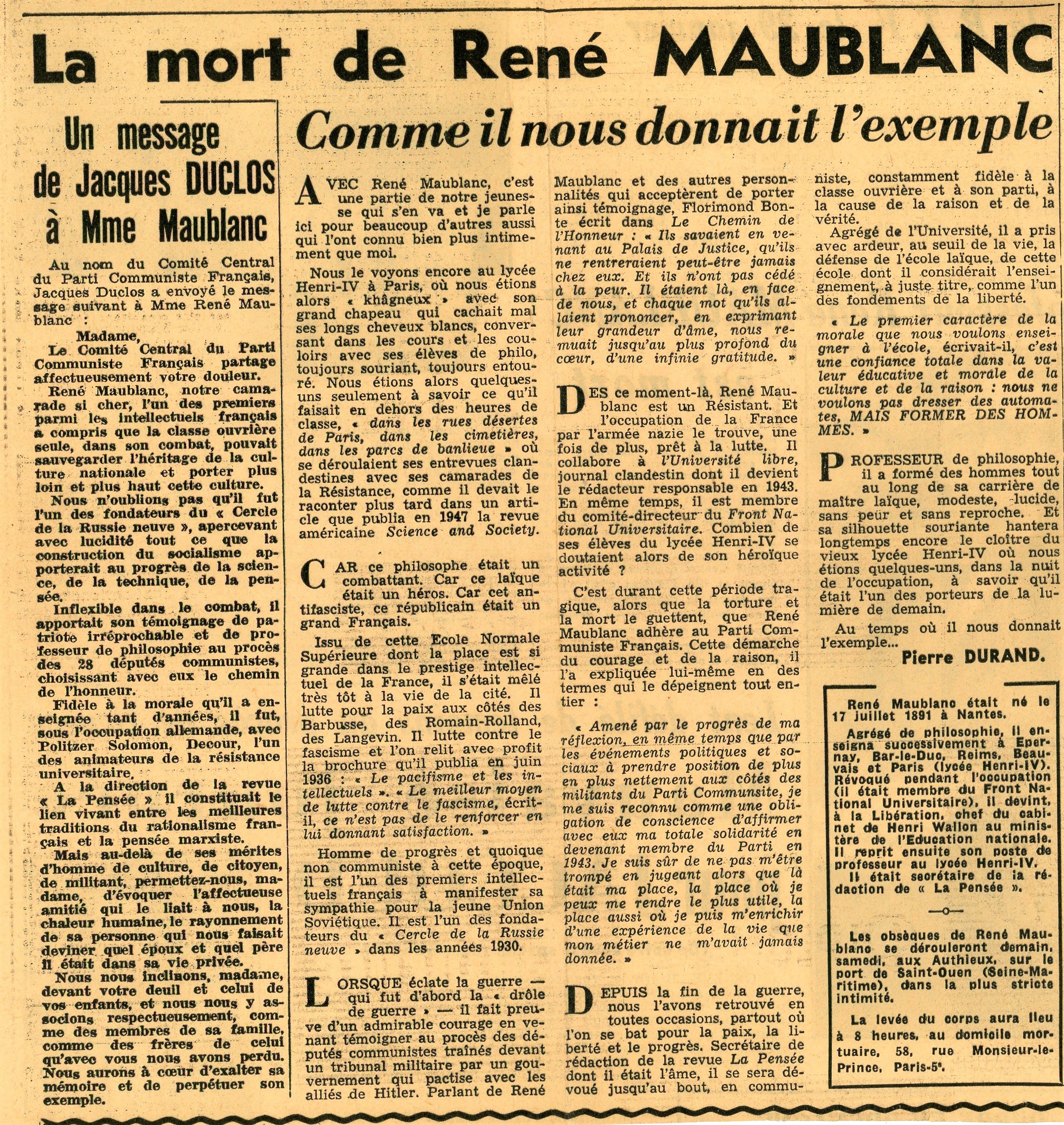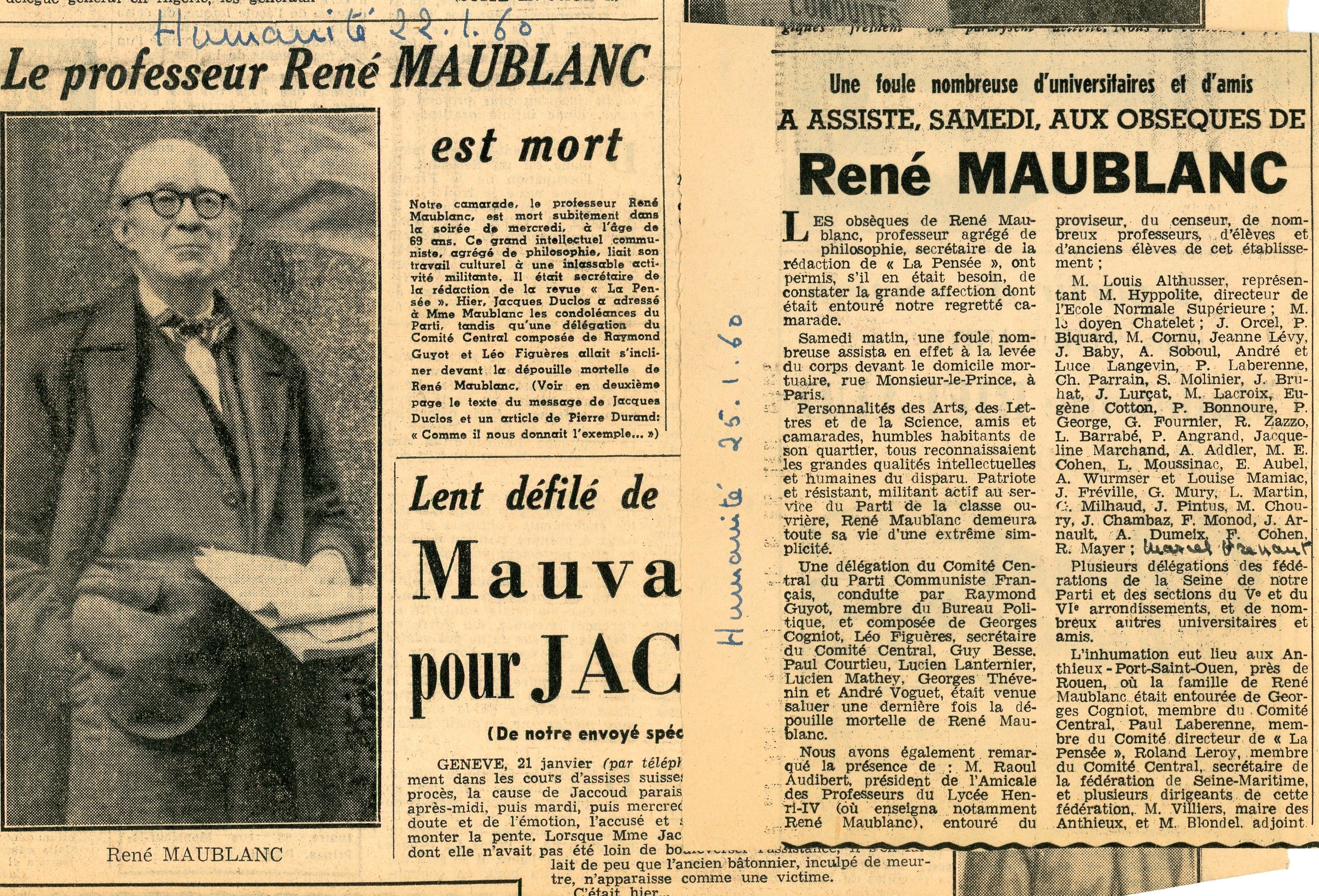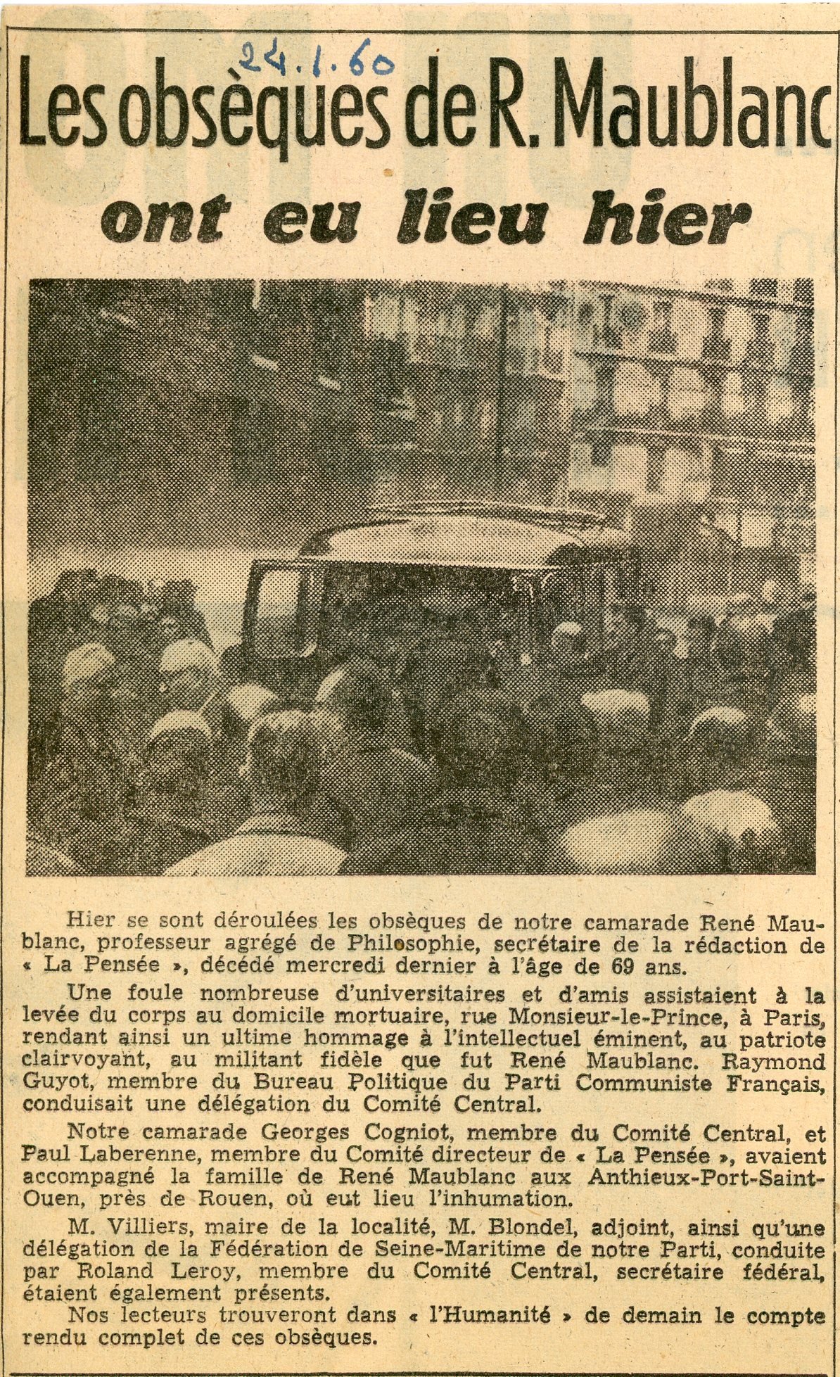 - Nombreuses coupures de presse ; feuillets des signatures de condoléances lors des obsèques du 23 janvier 1960 ; René Maublanc, Les Cahiers rationalistes, février 1960, br. in-8, 64 pages ; René Maublanc, philosophe, militant et écrivain, La Pensée, mars-avril 1960.