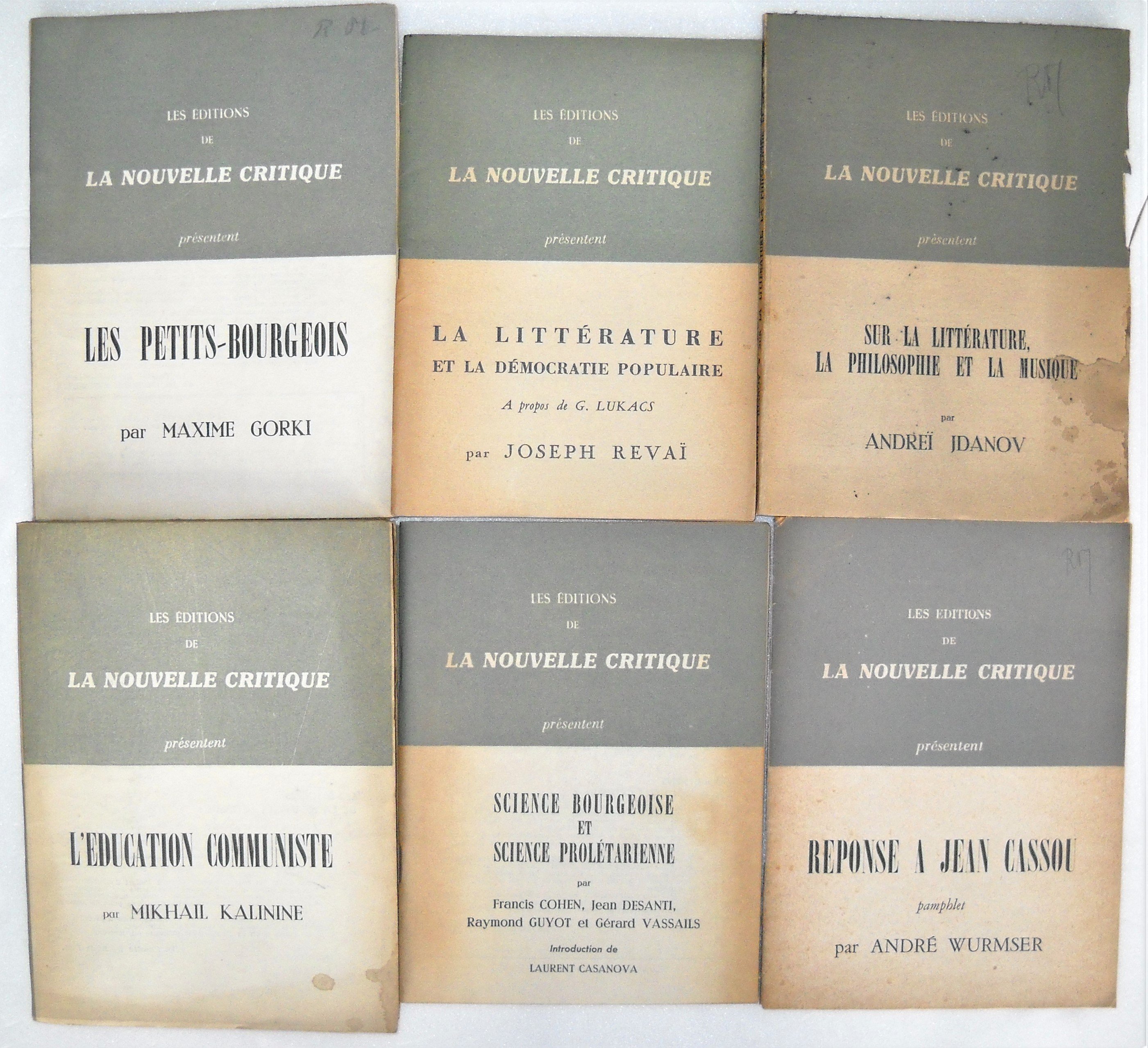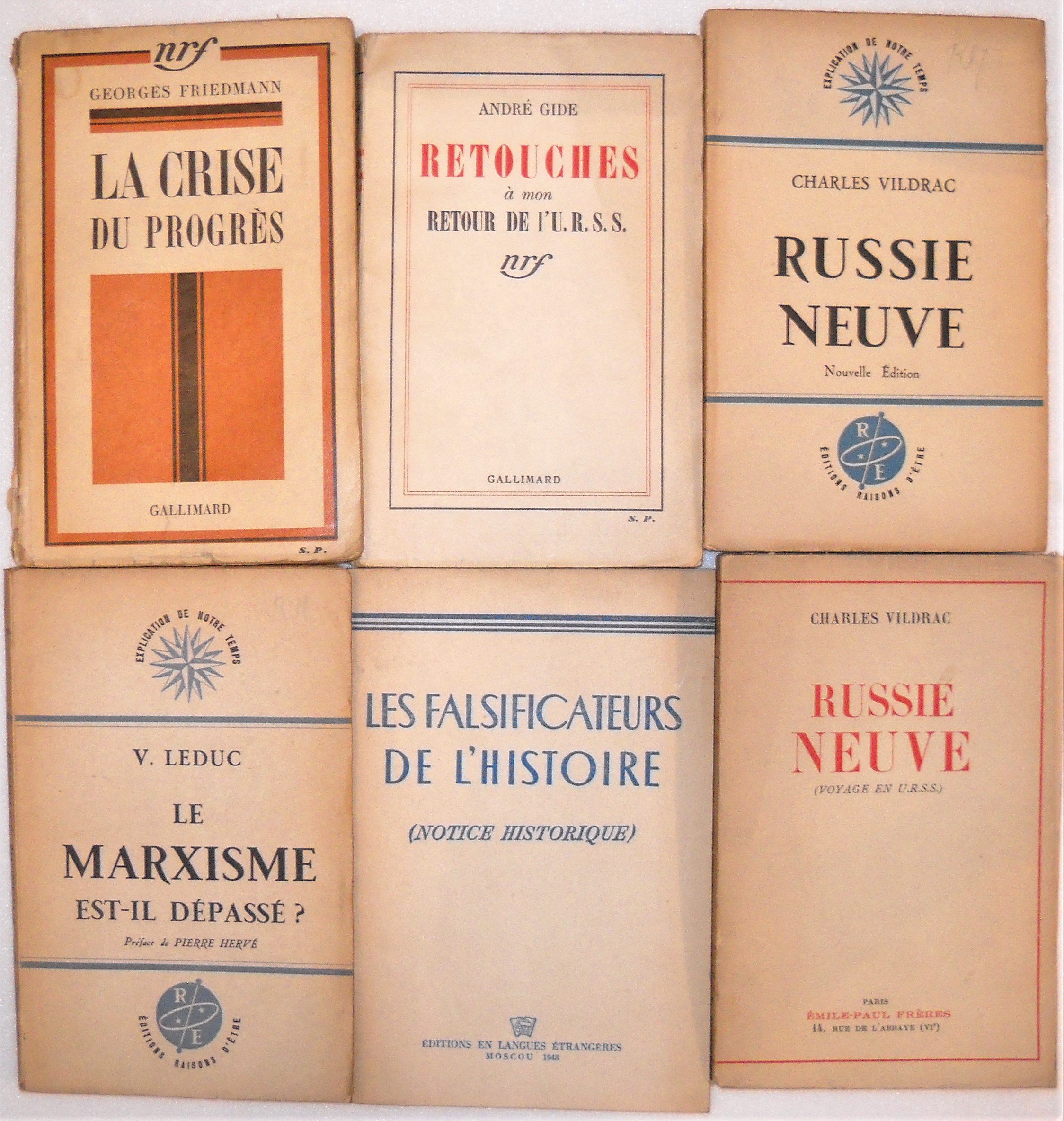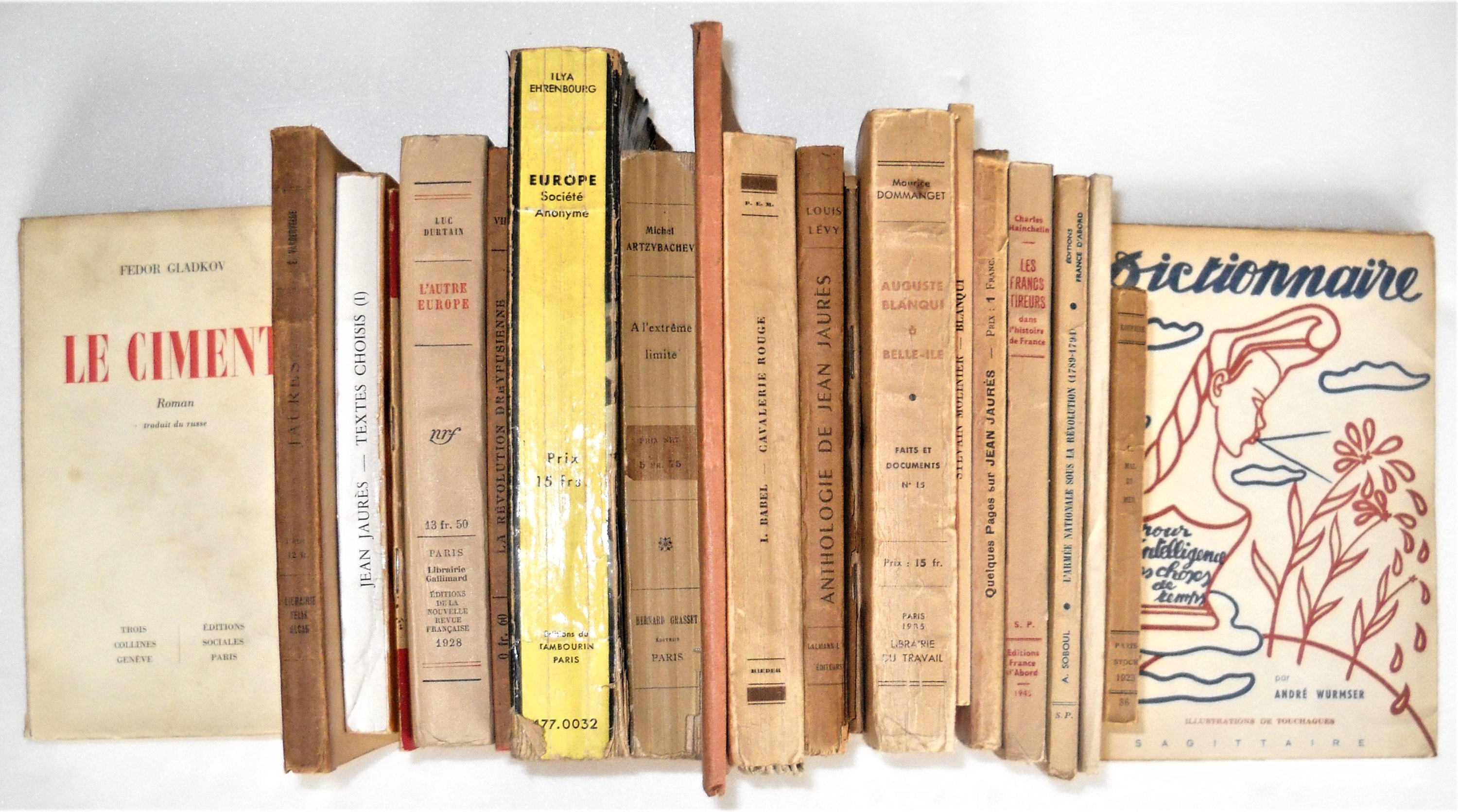 Jean JAURÈS, Discours à la jeunesse, Paris, F. Rieder et Cie, [1903], plaquette in-12, 27 pages. – Georges SOREL, La révolution dreyfusienne, Bibliothèque du mouvement socialiste, Paris, Librairie des sciences politiques et sociales, Marcel Rivière, 1909, br. in-12, 64 pages. – Jules GUESDE, Essai de catéchisme socialiste, Les documents du socialisme, Marcel rivière & Cie, 1912, br. in-12, 71 pages. – Michel ARTZYBACHEV, traduit du russe, A l’extrême limite, Bernard Grasset, 1913, br. in-12, 343 pages. – Lucien LEVY-BRUHL, Quelques pages sur Jean Jaurès, Paris, librairie de l’Humanité, 1916, br. in-12, 85 pages. – Un anniversaire, Jean Jaurès, n°1 du 11 août 1917 « Le fait de la semaine », br. in-12, 64 pages. (en l’état) – Le bilan de la paix blanche par un économiste, 1918, br. in-8, 22 pages – Alexandre KOUPRINE, Le mal de mer, Collection Les contemporains, librairie Stock, 1923, in-16 br., 126 pages. – Deux discours de M. Alexandre Millerand, président de la République, Paris, Marcel Giard, 1923, br. in-12, 49 pages – Isaac BABEL, traduit du russe avec une introduction par Maurice PARIJANINE, Cavalerie rouge, Les Editions Rieder, 1928, br. in-8, 260 pages. Ex. H.C. sur vergé de rives à la forme. Envoi autographe signé de Parijanine. – Luc DURTAIN, L’autre Europe, Moscou et sa foi, Gallimard N.R.F., 1928, in-12 br., 351 pages (manque à la couverture) – E. VANDERVELDE, Jaurès, Collection Réformateurs sociaux, Librairie Félix Alcan, 1929, broché. in-8, 150 pages. – Pierre LEGRAND, Y-a-t-il un dumping soviétique ?, Librairie André Delpeuch, 1930, br. in-8, 58 pages. – Ilya EHRENBOURG, Europe société anonyme, Editions du tambourin, 1931, in-4 br., 413 pages (en l’état) – Alexandre ZEVAES, Les grands manifestes du socialisme français au XIXe siècle, Société nouvelle d’imprimerie et d’édition, Paris, 1934, br. in-8, 101 pages – Maurice DEMMANGET, Blanqui à Belle-Ile, Editions de la librairie du travail, 1935, br. in-8, 275 pages. Envoi autographe signé. – Georges FRIEDMANN, La crise du progrès, N.R.F., Gallimard, 1936, br. in-12, 284 pages. Ex. S.P. Envoi autographe signé. – André GIDE, Retouches à mon retour de l’U.R.S.S., N.R.F., Gallimard, 1937, br. in-12, 126 pages. Ex. S. P. – Charles VILDRAC, Russie Neuve (voyage en U.R.S.S.), Emile-Paul Frères, 1937, in-12 br., 254 pages. Envoi autographe signé. – Fedor GLADKOV, Le ciment, Trois Collines Genève, 1944, br. in-12, 384 pages. – Albert SOBOUL, L’armée nationale sous la Révolution, 1789-1794, Editions France d’Abord, Paris, 1945, br. in-12, 137 pages. Envoi autographe signé et daté. Ex. S.P. – Charles HAINCHELIN, Les francs-tireurs dans l’histoire de France, Editions France d’Abord, 1945, br. in-12, 140 pages. – V. LEDUC, Le marxisme est-il dépassé ?, Editions Raisons d’Etre, 1946, br. in-12, 176 pages. Envoi autographe signé. – Louis LEVY, Anthologie de Jean Jaurès, Calmann-Lévy, 1946, br. in-12, 320 pages. Envoi autographe signé. – André WURMSER, Dictionnaire pour l’intelligence des choses de ce temps, illustrations de Touchagues, Paris, Sagittaire, 1946, br. in-8, 118 pages. Ex. S.P. Envoi autographe signé. – Charles VILDRAC, Russie neuve, Editions Raisons d’Etre, 1947, br. in-12, 212 pages. Envoi autographe signé. – Sylvain MOLINIER, Blanqui – Centenaire de la révolution de 1848, P.U.F., 1948, br. in-12, 70 pages. Envoi autographe signé. – Les falsificateurs de l’histoire (notice historique), Editions en langues étrangères, Moscou, 1948, plaquette in-12, 63 pages. – Maxime GORKI, Les petits bourgeois. Les éditions de la nouvelle critique, 1949, in-8 br., 125 pages. – Andreï JDANOV, Sur la littérature, la philosophie et la musique, Les Editions de la Nouvelle Critique, 1950, br. in-12, 94 pages. – André WURMSER, Réponse à Jean Cassou pamphlet, Les éditions de la Nouvelle Critique, 1950, plaquette in-12, 32 pages. Envoi autographe signé. – Mikhaïl KALININE, L’éducation communiste, Editions de la Nouvelle critique, 1950, br. in-12, 157 pages. – Joseph REVAÏ, La littérature et la démocratie populaire, Les éditions de la Nouvelle Critique, 1950, plaquette in-12, 39 pages. – Collectif, Science bourgeoise et science prolétarienne, Les éditions de la Nouvelle Critique, 1950, plaquette in-12, 47 pages. – Madeleine REBEYRIOUX, Jean Jaurès – Textes choisis – Tome 1er – Contre la guerre et la politique coloniale, Editions sociales, 1959, br. in-12, 238 pages. Envoi autographe signé. – Jaurès la paix et la démocratie, Editions sociales, 1959, plaquette in-12, 47 pages. – Roger GARAUDY, Lettre à Emmanuel Mounier homme d’esprit – pamphlet, Les Editions de la Nouvelle Critique, s.d., plaquette in-12, 17 pages.
