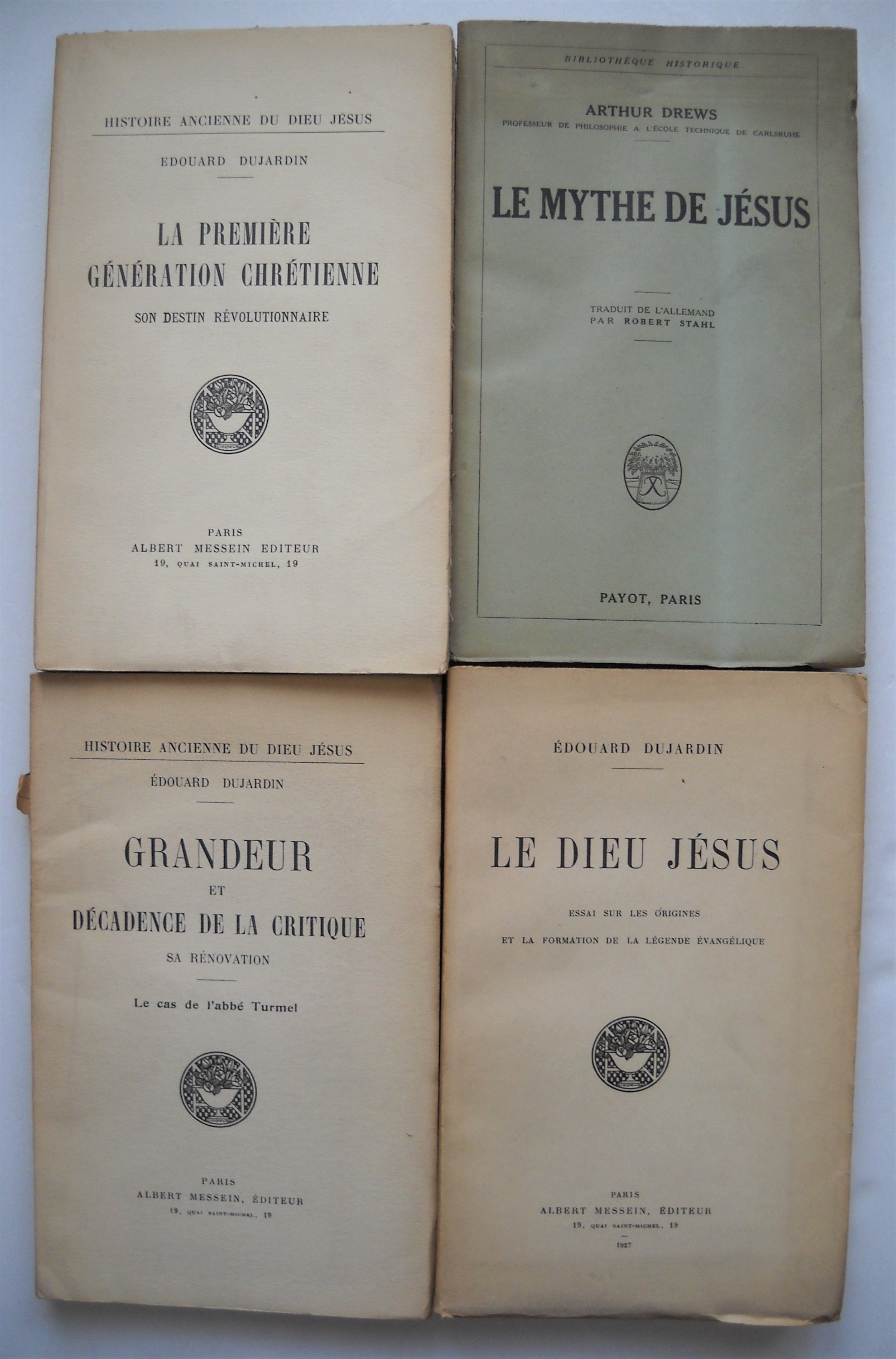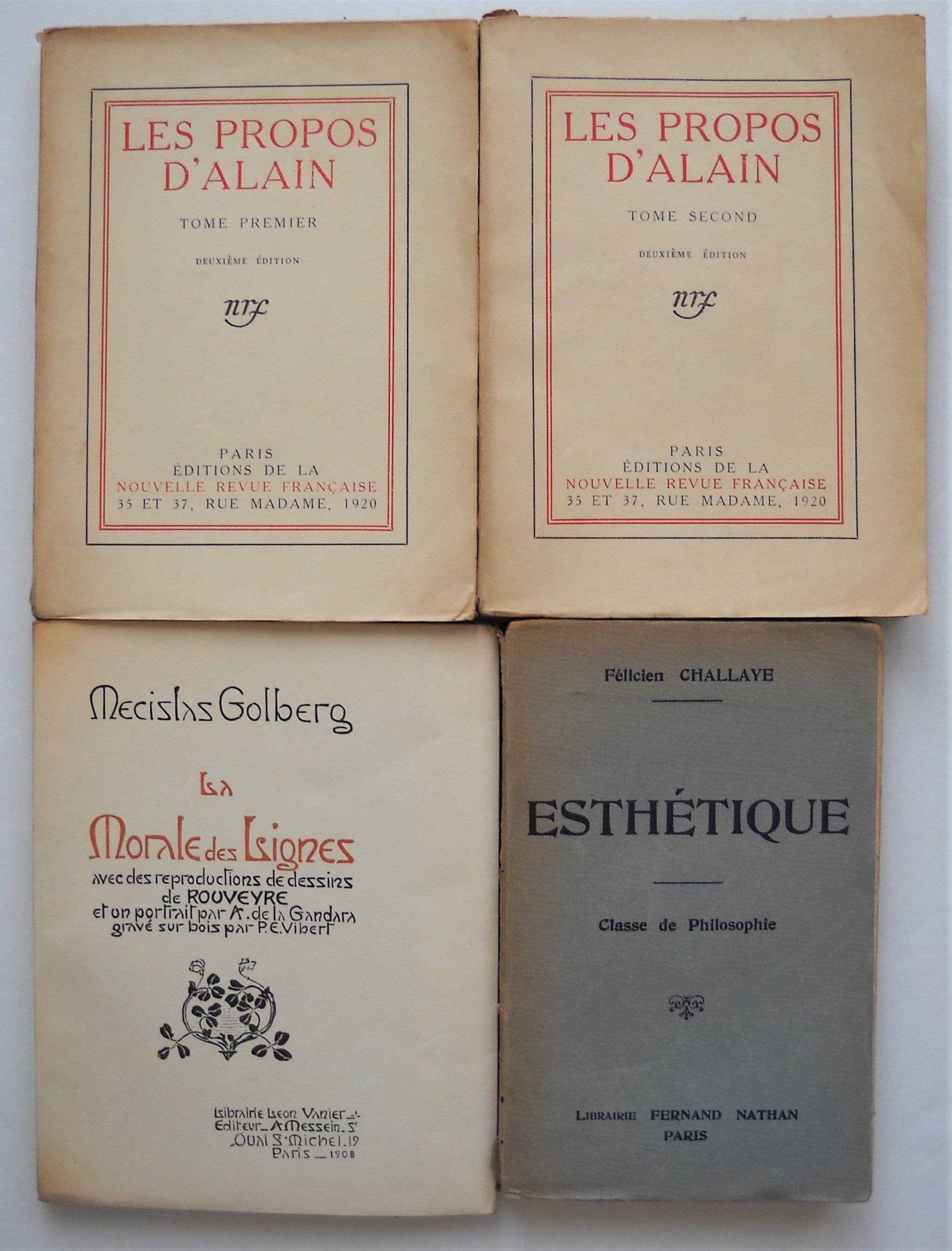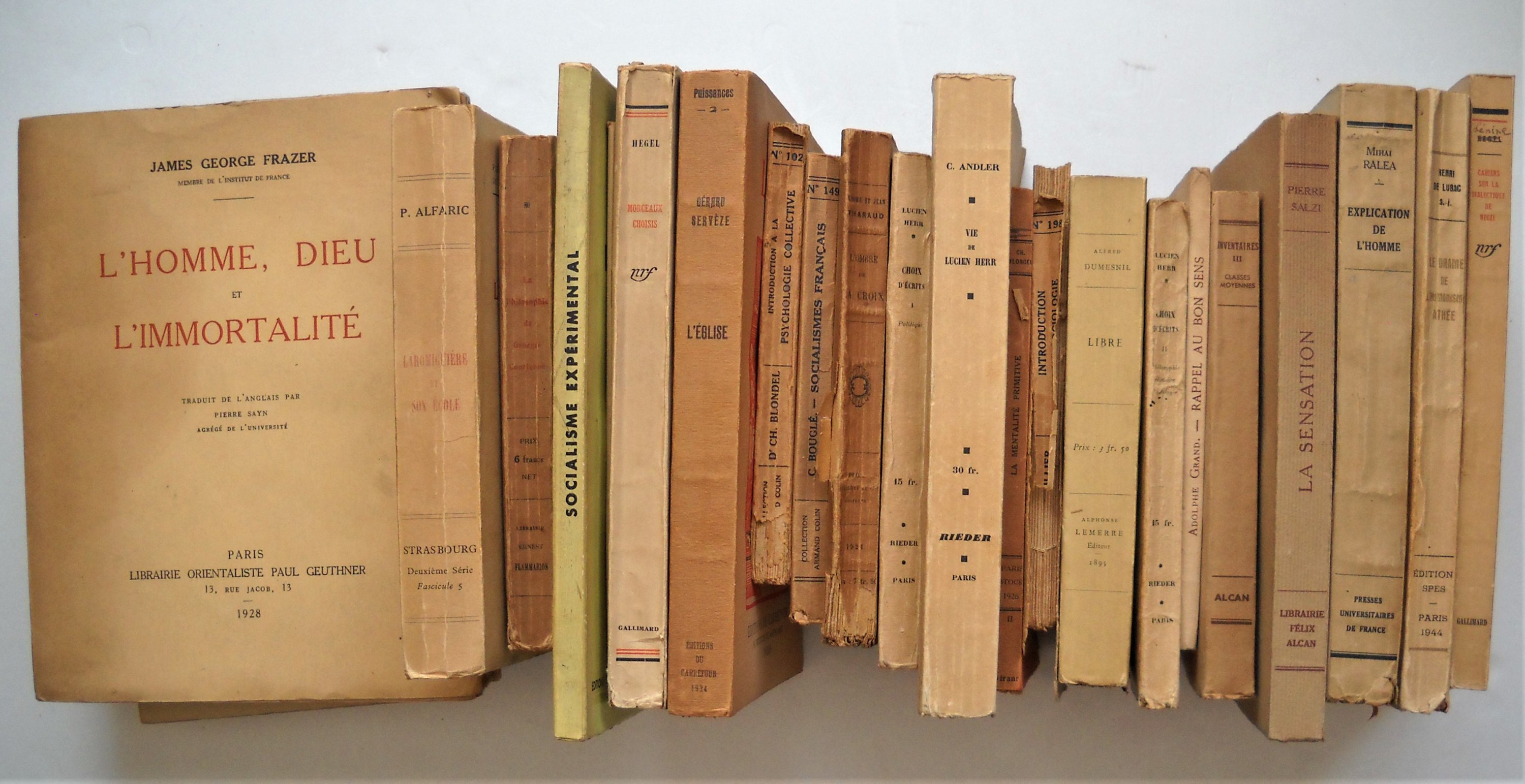 Alfred DUMESNIL, Libre, Alphonse Lemerre édit., 1895, br. in-12, 340 pages. MECISLAS GOLBERG, La morale des Lignes, Librairie Léon Vanier, Paris, 1908, br. in-12, 196 pages. 2 ex. La philosophie de Georges Courteline, Ernest Flammarion, 1917 et 1922, br. in-16 et in-12, 186 et 190 pages. Jérôme et Jean THARAUD, Lombre de la croix, Plon, 1920, br. in-12, 306 pages. Emile-Auguste CHARTIER sous pseudonyme ALAIN : Les propos dAlain, tomes 1 et 2, N.R.F., Gallimard, 1920, br. in-12, 246 et 264 pages. Editions originales. ; Système des Beaux-Arts rédigé pour les artistes en vue dabréger leurs réflexions préliminaires, Paris, Edition de la Nouvelle revue Française, 1920, br. in-8, 334 pages. Edition originale. Ex. n°553 sur vélin pur fil Lafuma de Voiron. Arthur DREWS, Le mythe de Jésus », traduit de lallemand par Robert Stahl. Payot, Paris, 1926, br. in-8, 254 pages. Envoi autographe signé. James George FRAZER, Lhomme, Dieu et limmortalité, traduit de langlais par Pierre Sayn, Librairie Orientaliste Paul Geuthner, 1928, br. in-4, 330 pages. Prosper ALFARIC, Laromiguière et son école, étude biographique, Les Belles Lettres, Paris, 1929, br. in-12, 324 pages. Envoi autographe signé. Edouard DUJARDIN : Le Dieu Jésus Essai sur les origines et la formation de la légende évangélique, Albert Messein, Paris, 1927, br. in-8, 260 pages. Envoi autographe signé. ; Grandeur et décadence de la critique, sa rénovation Le cas de labbé Turmel, Albert Messein, Paris, 1931, br. in-8, 165 pages. ; La première génération chrétienne, son destin révolutionnaire, Albert Messein, Paris,1935, br. in-8, 412 pages. Envoi autographe signé. Félicien CHALLAYE, Esthétique classe de Philosophie, Librairie Fernand Nathan, 1929, br. in-12, 198 pages. Envoi autographe signé. Lucien HERR, Choix décrits Politique Philosophie, histoire, philologie, 2 tomes, Les Editions Rieder, Paris, 1932, br. in-12, 282 et 292 pages. Charles ANDLER, Vie de Lucien Herr, Rider éditeur, Paris, 1932, br. in-8, 334 pages. Célestin BOUGLÉ, Socialismes français, collection Armand Colin, 1932, br. in-12, 200 pages. Envoi autographe signé. Gérard SERVÈZE, Léglise, Editions du carrefour, Paris, 1934, br. in-8, 340 pages. Envoi autographe signé. Pierre SALZI, La sensation, étude de sa genèse et de son rôle dans la connaissance, Librairie Félix Alcan, 1934, br. in-8, 198 pages. Envoi autographe signé et daté. Georges LACOMBE, Une lettre philosophique de Jules Lachelier, avant-propos de Georges LACOMBE, chez lauteur, Bayonne, avril 1934, plaquette in-8, 6 pages. Envoi autographe signé. Charles BLONDEL : La mentalité primitive, préface de Lévy-Bruhl, Delamain & Boutelleau, Paris, br. in-12, 122 pages ; Introduction à la psychologie collective, collection Armand Colin, 1936, br. in-12, 208 pages. Adolphe GRAND, Rappel au bon sens ou du danger de lanalyse et des fictions, Editions Jouve, Paris, 1935, br. in-12, 98 pages. Maurice WEBER, La valeur culturelle des mathématiques, Paris, Librairie de lEnseignement technique, 1935, plaquette in-8, 7 pages. Envoi autographe signé. A.M. AUZENDE, Un pas en avant, essai de philosophie populaire, Librairie Tacussel, Marseille, 1935, br. in-12, 86 pages. Envoi autographe signé et daté. Armand CUVILLIER, Introduction à la sociologie, collection Armand Colin, 1936, br. in-12, 208 pages. Envoi autographe signé. (en létat) Collectif et avant-propos de Célestin BOUGLE, Inventaires III Classes moyennes, Librairie Félix Alcan, 1939, br. in-12, 354 pages. Louis VALLON, Socialisme expérimental, Editions du centre polytechnicien détudes économiques, 1936, br. in-8, 152 pages. Envoi autographe signé. HEGEL, traduction par Henri LEFEBVRE et N. GUTTERMAN Morceaux choisis, N.R.F., Gallimard, 1939, br. in-8, 343 pages. Ex. S.P. Envoi autographe signé. Henri de LUBAC, Le drame de lhumanisme athée, Editions Spes, Paris, 1944, br. in-8, 412 pages. Marcel COHEN, Linguistique et matérialisme dialectique, Ophrys, Gap, 1948, plaquette in-8, 19 pages. Joint : L.A.S., 27 mai 1949, 1 page in-8. Mihai RALEA, Explication de lhomme, Presses Universitaires de France, 1949, br. in-8, 299 pages. Envoi autographe signé : « Au camarade R. Maublanc, en souvenir de nos années détudes au « centre de documentation sociale » à lécole normale supérieure, profonde amitié ». Jean-François REVEL, Pourquoi des philosophes ?, Julliard, 1957, br. in-12, 174 pages. Ex. S.P. Envoi autographe signé. Jacques NICOLLE, La science au service de lémancipation de lhomme, Editions Liberté, Alger, s.d., plaquette in-8, 38 pages. Divers numéros de revues.