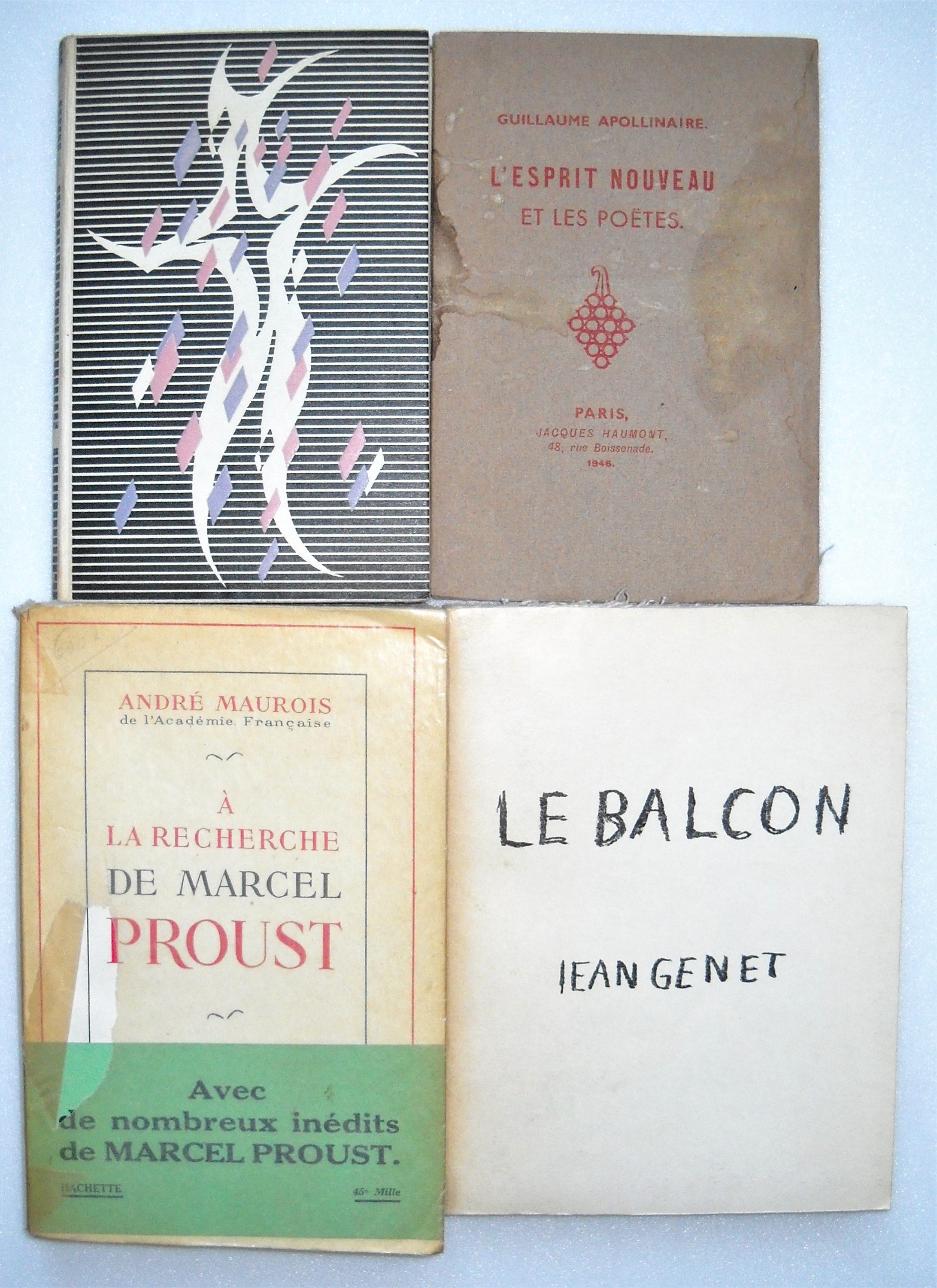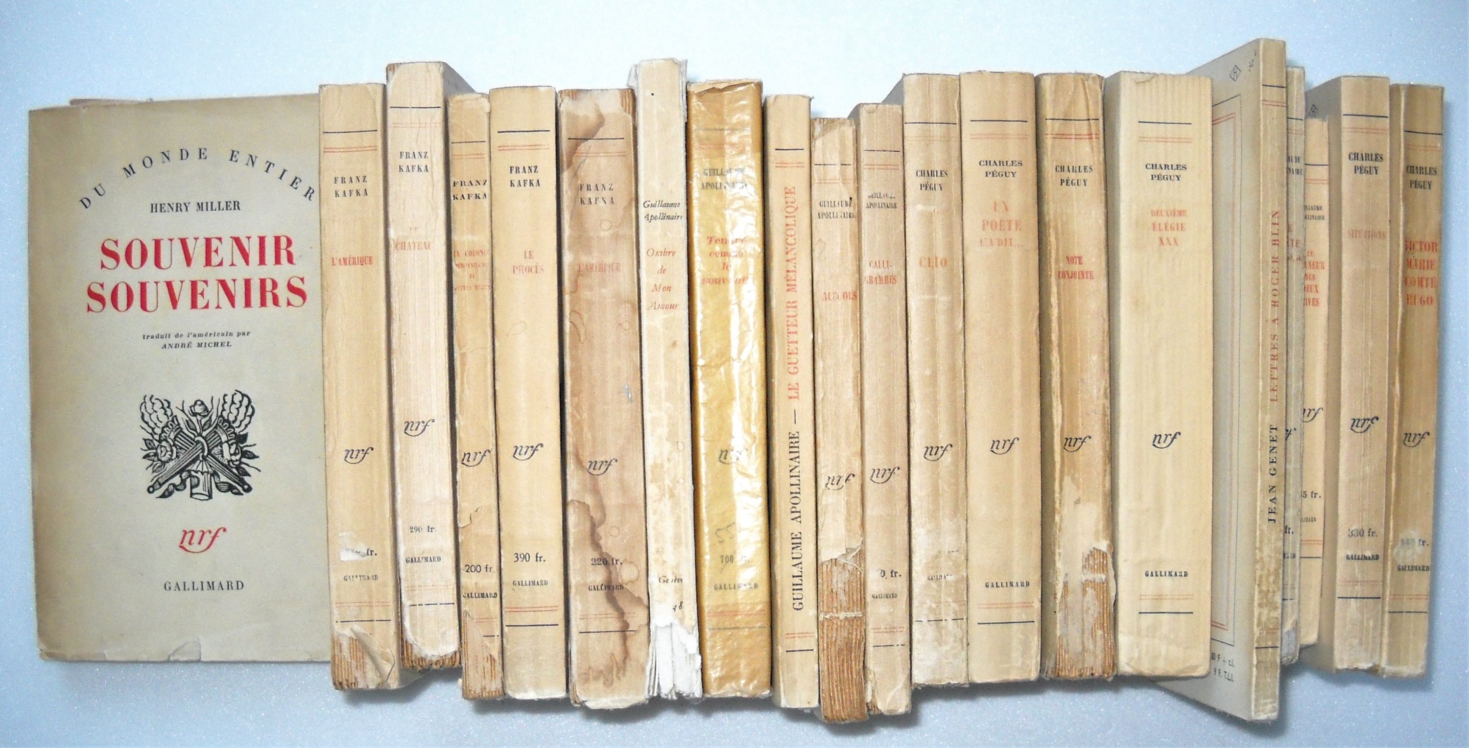 Guillaume APOLLINAIRE : Lesprit nouveau et les poètes, Jacques Haumont, Paris, 1946, br. in-12, 29 pages. Ex. n°774/1500 sur vélin blanc de Rives ; Le guetteur mélancolique, frontispice de Picasso, N.R.F., Gallimard, 1952, br. in-12, 149 pages ; Ombre de Mon Amour Poèmes, Pierre Cailler éditeur, Vésenaz, 1948, br. in-8, 145 pages et 19 planches ; Tendre comme le souvenir, N.R.F., Gallimard, 1952, br. in-12, 354 pages ; Alcools, poèmes 1898-1913, N.R.F., Gallimard, 1948, br. in-12, 169 pages ; Calligrammes, N.R.F., Gallimard, 1948, br. in-12, 204 pages ; La femme assise, N.R.F., Gallimard, 1948, rel. in-12, 156 pages. Ex. n°814 sur Alfa Navarre ; Le poète assassiné, N.R.F., Gallimard, 1947, br. in-12, 236 pages ; Le flaneur des deux rives, N.R.F., Gallimard, 1949, br. in-12, 107 pages. Michel BUTOR, Essais sur les essais, N.R.F., Gallimard, 1968, br. in-12, 216 pages. Jean GENET : Haute surveillance, N.R.F., Gallimard, 1965, br. in-12, 97 pages ; Lettres à Roger Blin, N.R.F., Gallimard, 1966, br. in-8, 69 pages ; Le balcon, Marc Barbezat, 1962, br. in-8, 205 pages. Franz KAFKA : 2 ex. LAmérique, N.R.F., Gallimard, 1946 et 1949, br. in-12, 339 pages. ; Le château, N.R.F., Gallimard, 1947, broché in-12, 255 pages ; Le procès, N.R.F., Gallimard, 1951, br. in-12, 283 pages ; La colonie pénitentiaire, N.R.F., Gallimard, 1948, br. in-12, 187 pages. André MAUROIS, A la recherche de Marcel Proust, Hachette, 1956, br. in-8, 346 pages. Henry MILLER, Souvenirs souvenirs, N.R.F., Gallimard, 1953, br. in-8, 347 pages. Charles PEGUY : Victor-Marie comte Hugo, N.R.F., Gallimard, 1947, br. in-12, 241 pages ; Situations, N.R.F., Gallimard, 1948, br. in-12, 251 pages ; Clio, N.R.F., Gallimard, 1948, br. in-12, 276 pages ; Un poète la dit