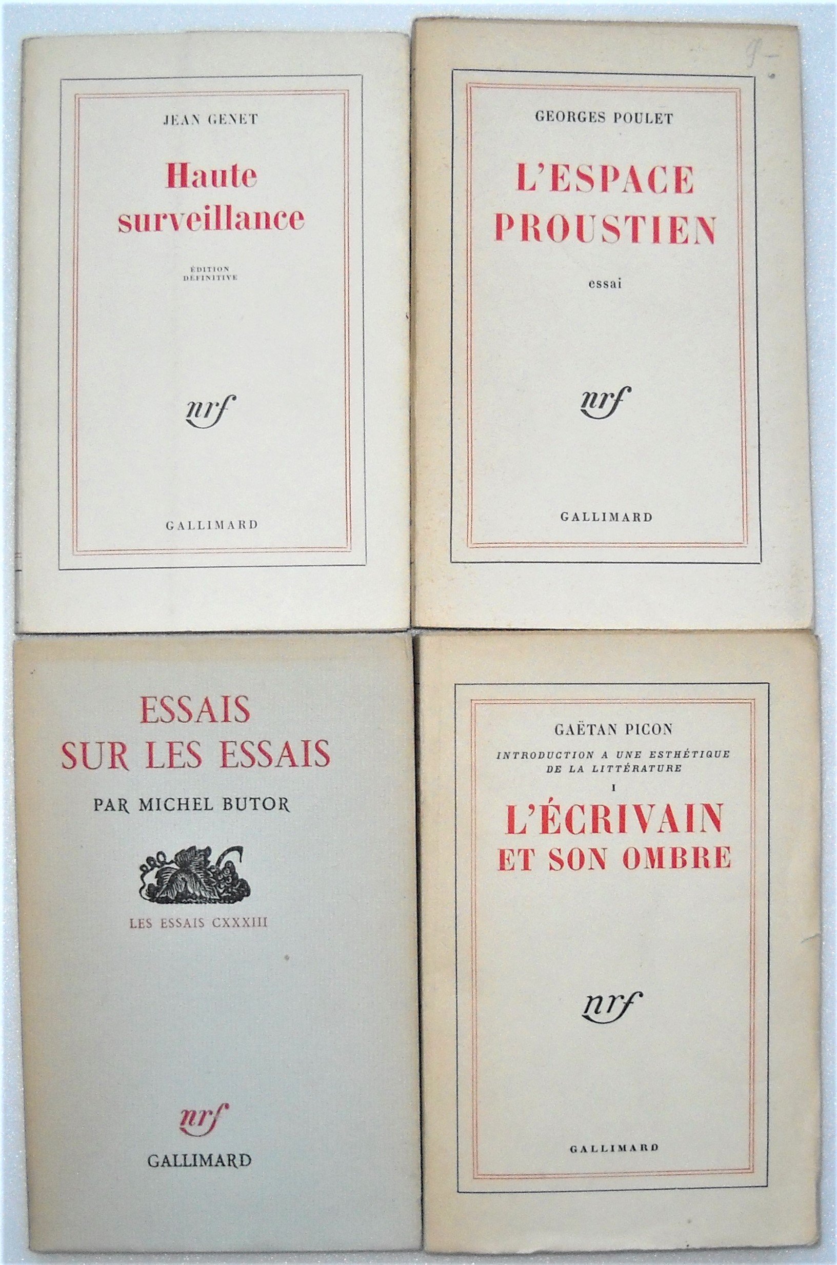 , N.R.F., Gallimard, 1953, br. in-12, 316 pages ; Note conjointe, N.R.F., Gallimard, 1951, br. in-12, 319 pages ; Deuxième élégie XXX, N.R.F., Gallimard, 1955, br. in-12, 434 pages. Gaëtan PICON, Lécrivain et son ombre, N.R.F., Gallimard, 1960, br. in-12, 316 pages. Georges POULET, Lespace proustien, N.R.F., Gallimard, br. in-12, 1964, broché in-12, 177 pages.