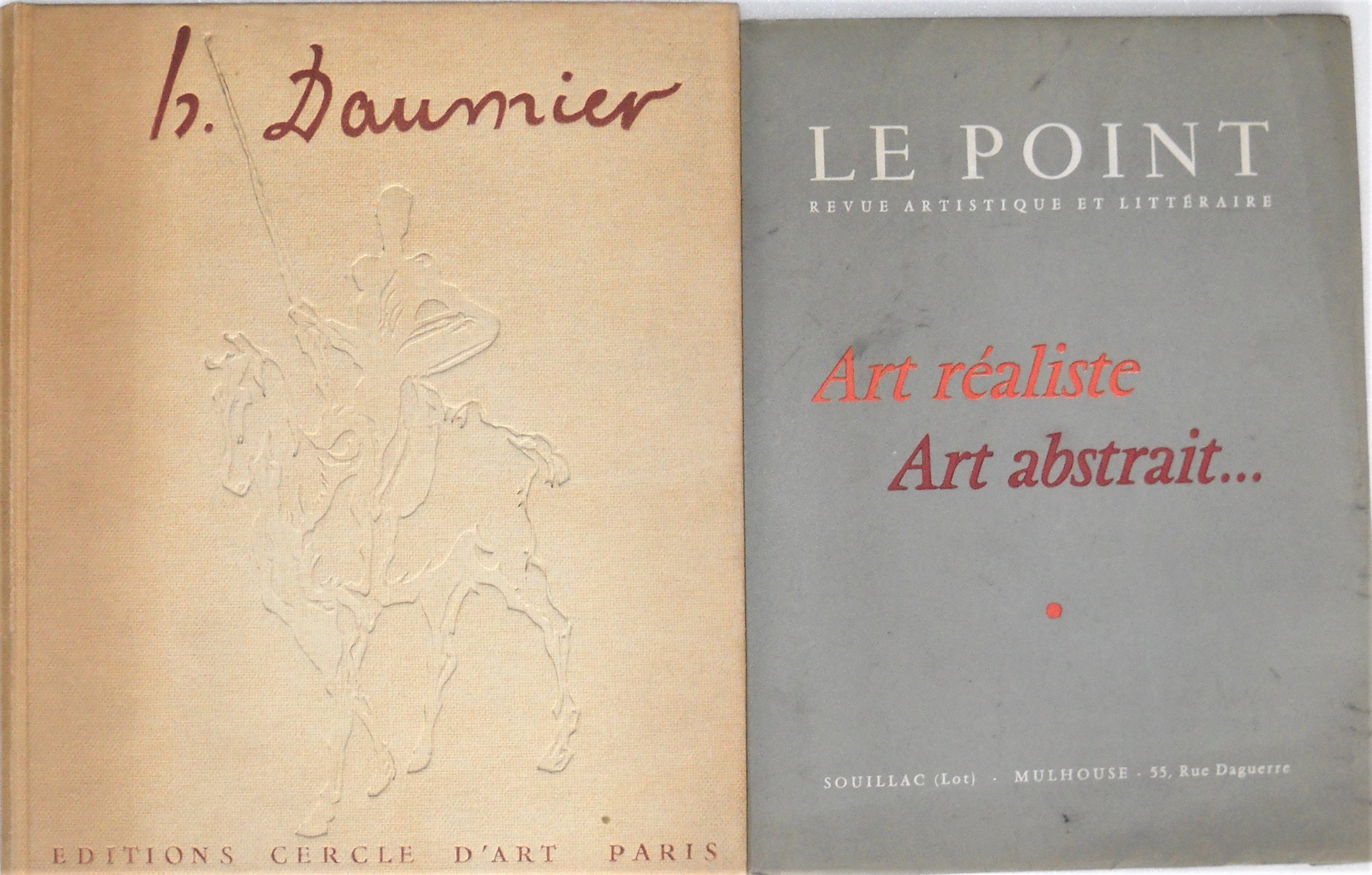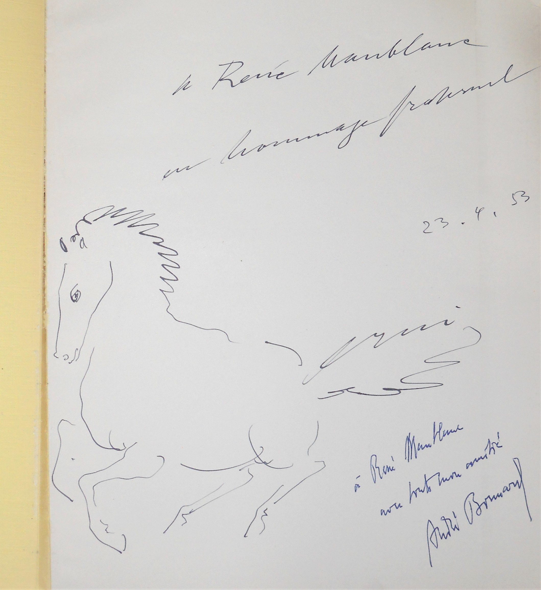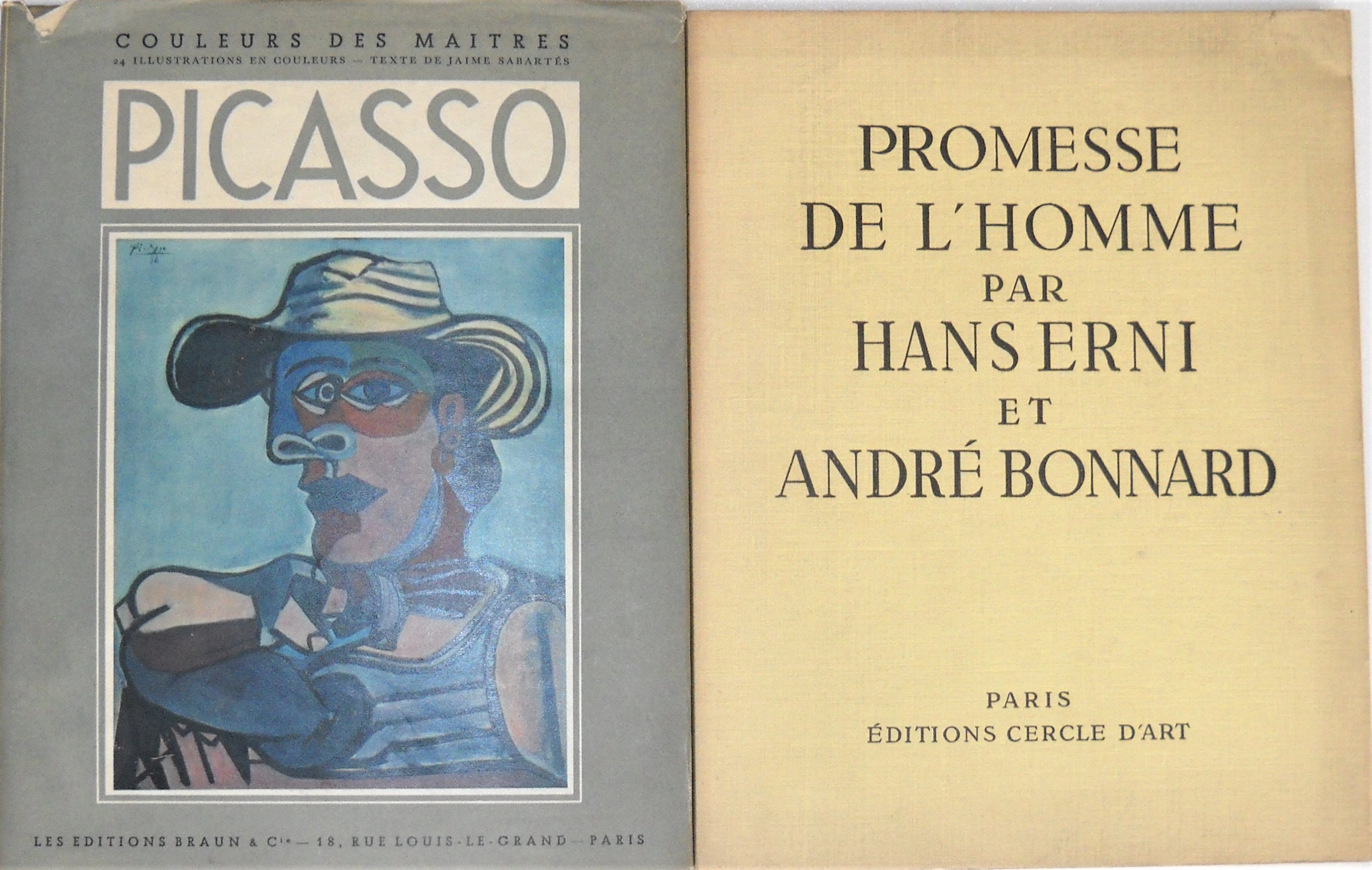 Couleurs des maîtres : Picasso, préface de James Sabartès. Les éditions Braun & Cie, Paris, 1946, rel. in-4, 12 pages de texte et 24 planches d’illustrations. – Hommage à Gustave Courbet, Les Amis de Gustave Courbet, 1948, plaquette in-8, éditée à l’occasion du 70e anniversaire de la mort de G. Courbet, ex. n°205/750. Joint L.A.S., Paris, 14 juin 1948, de Robert FERNIER (1895-1977), président de l’association et fondateur du musée Courbet à Ornans, 2 pages in-4. – Guillaume APOLLINAIRE, Les peintres cubistes, méditations esthétiques, Editions Pierre Cailler, Genève, 1950, br. in-12, 139 pages. – Bonnard, exposition rétrospective, préface de Charles Terrasse, Bernheim-jeune, Paris, mai-juillet 1950., 27 pages – Honoré Daumier, introduction d’André WURMSER, Editions Cercle d’Art, Paris, 1951, rel. in-4, 120 pages. – Jean FALLOT, Réalité de l’œuvre d’art, Julliard, Paris, 1951, br. in-12, 109 pages. Envoi autographe signé et daté. – Hans ERNI et André BONNARD, Promesse de l’homme, Paris, Editions du Cercle d’Art, 1953, br. in-4, illustré de 30 compositions de Hans Erni. Envois autographes signés avec dessin d’un cheval par Erni. – Art réaliste, art Abstrait, Le Point, revue artistique et littéraire, septembre 1954. – Félix Valloton, Maison de la pensée française, Paris, 1955, br. in-8.