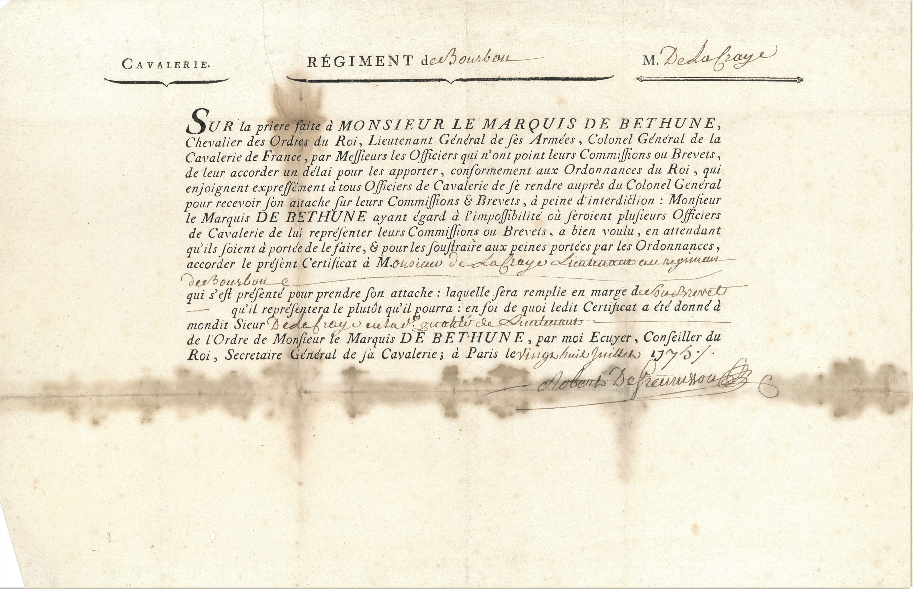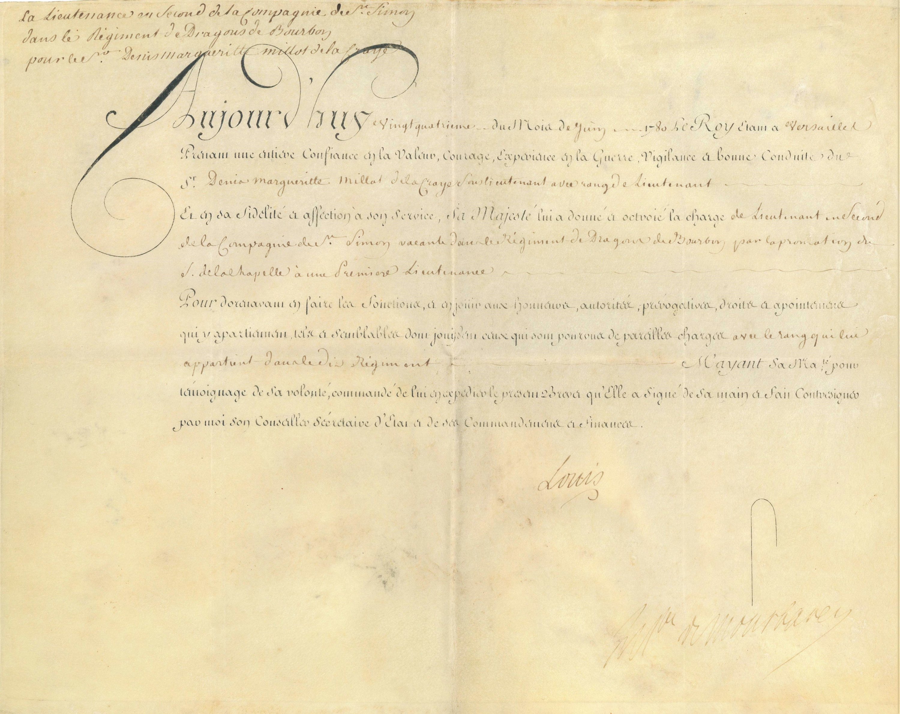 P.S., Versailles, 24 juin 1780, « Louis » et contresignée par le prince de Montbarey, ministre secrétaire détat au département de la Guerre sous Louis XVI, commission de lieutenant en second de la compagnie de Saint Simon dans le régiment de Bourbon-Dragons, 1 page oblong in-fol. en velin, en partie impr.