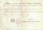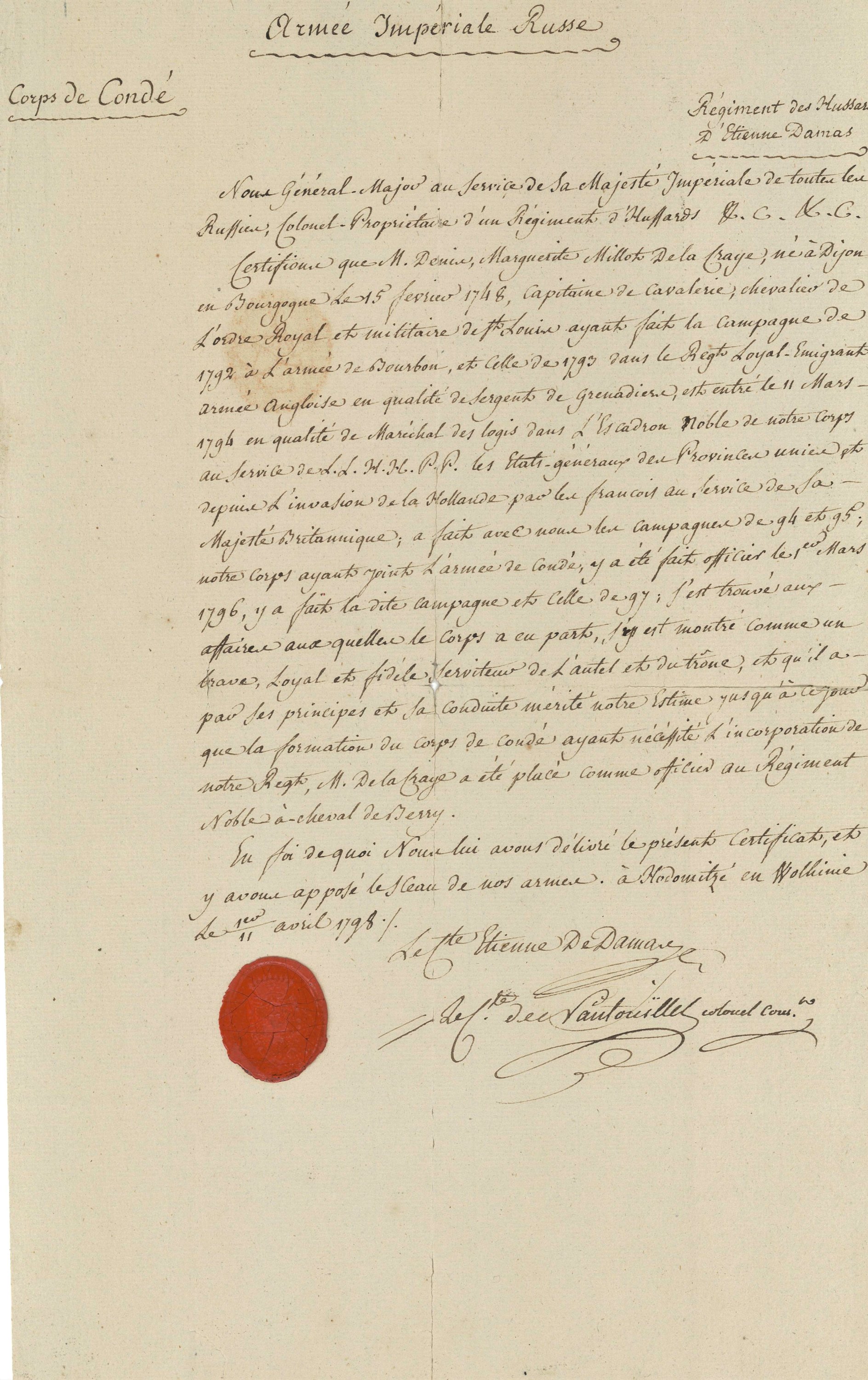 P.S., Hodomitzé en Wolhinie, 11 avril 1798, comte Etienne de DAMAS-CRUX (1754-1846), commandant du régiment des hussards de la Légion de Damas dans larmée du prince de Condé, incorporée dans larmée impériale russe, contresignée par le comte de Nantouillet, 1 page in-fol., cachet de cire rouge.